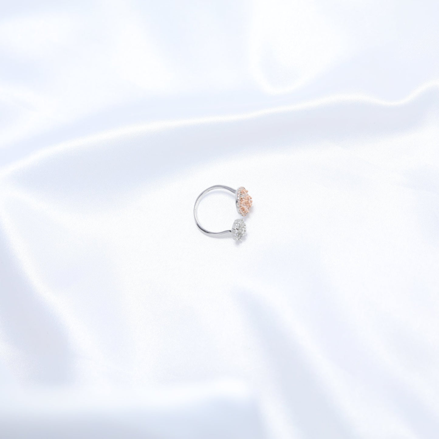 A perfect blend of elegance and modernity, the Dual Bloom Ring showcases a unique open-band design adorned with two dazzling floral-inspired clusters. One cluster sparkles with pure white cubic zirconia stones, radiating timeless sophistication, while the other shines in a warm, rose-gold hue, symbolizing charm and passion.
