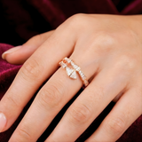 The Twin Arrow Ring is a modern statement piece, meticulously crafted in 92.5 sterling silver with a luxurious rose gold finish. This ring features a unique bypass design, where two geometric arrow motifs meet in the center to create a bold, overlapping silhouette. Each triangular arrowhead and the connecting rectangular links are encrusted with pavé-set crystals, offering a continuous shimmer that wraps elegantly around the finger.