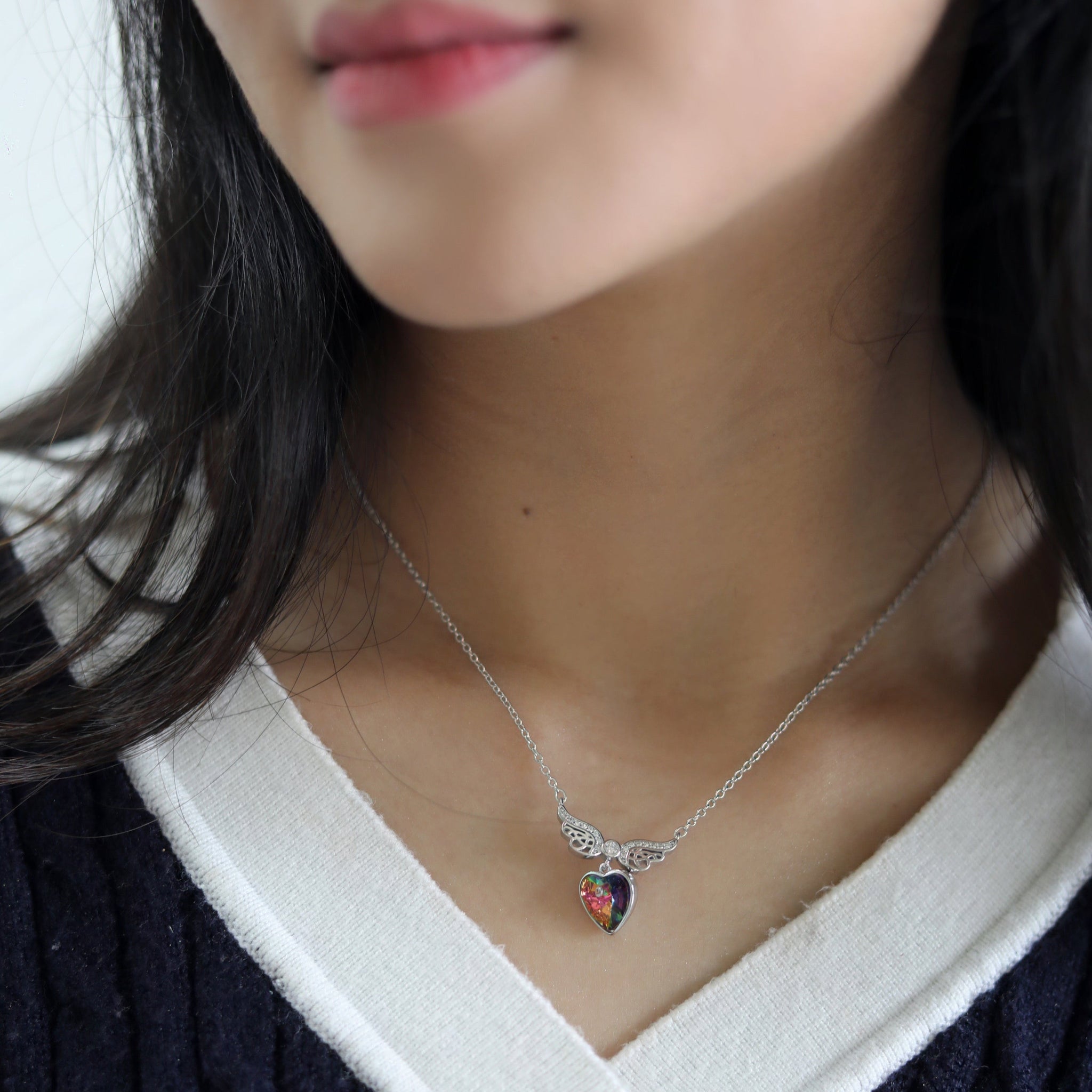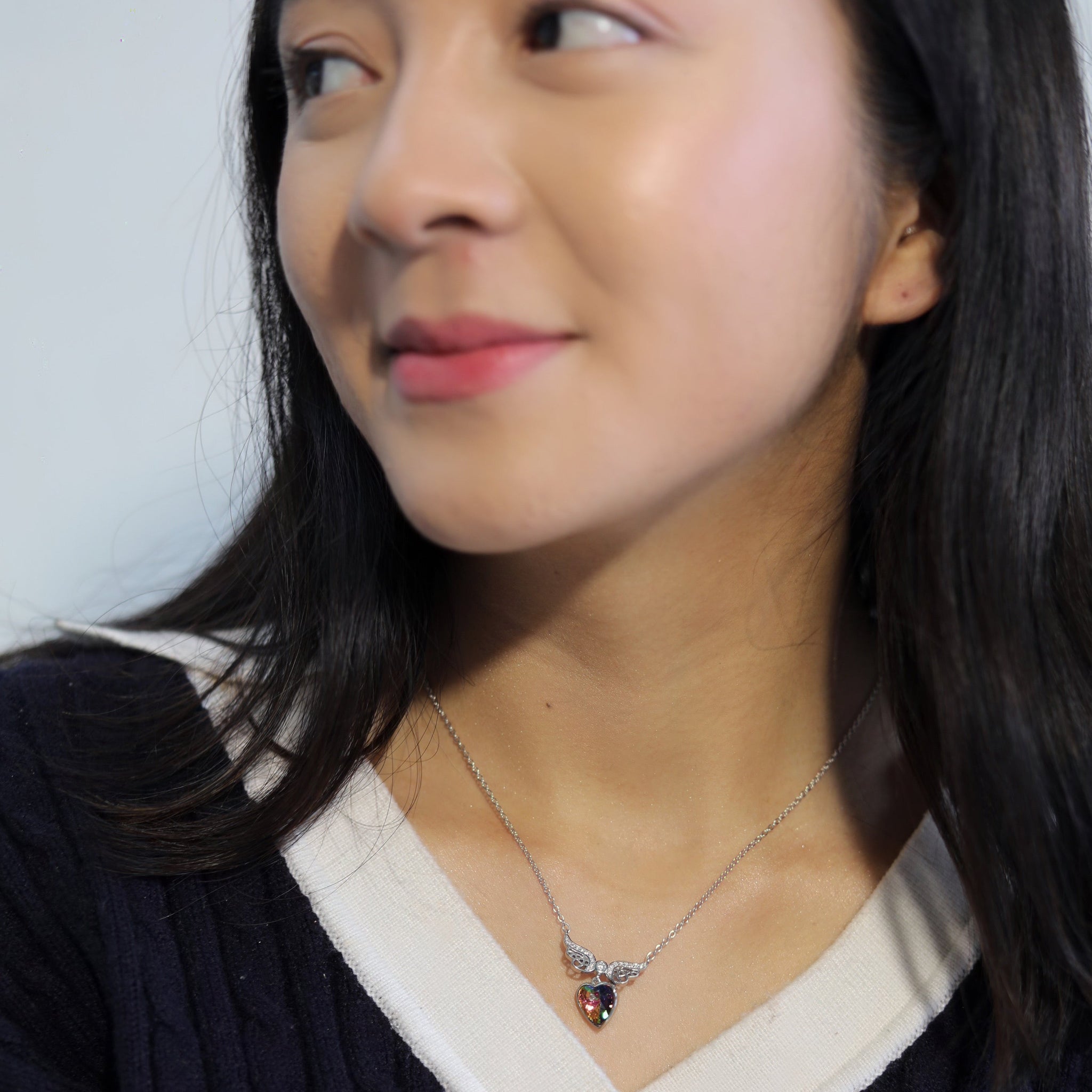 Embrace elegance with the Wings of Love pendant, a stunning piece that beautifully combines grace and charm. Designed with delicate silver wings adorned with sparkling accents, this pendant cradles a mesmerizing multicolored heart-shaped stone, symbolizing love in all its vibrant hues.
