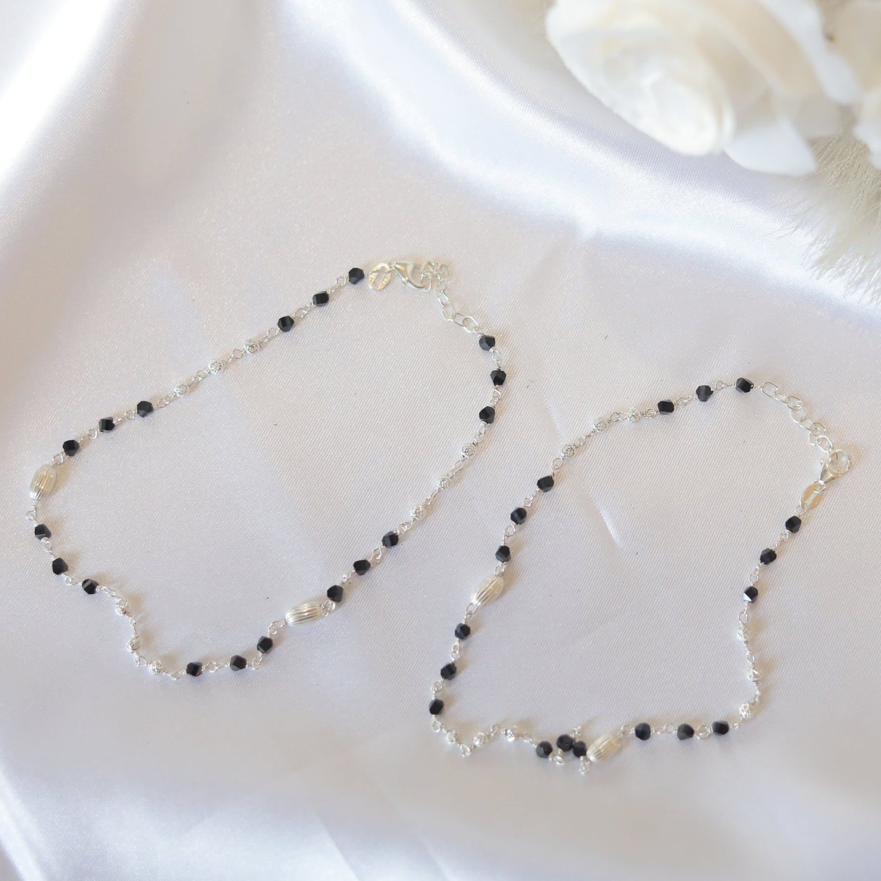 Delicate, minimal, and sophisticated—the Midnight Grace Anklets are a blend of 92.5 sterling silver and dainty black beads, creating a timeless piece that complements every outfit. Whether you're dressing up for a special occasion or keeping it casual, these anklets add just the right touch of elegance.