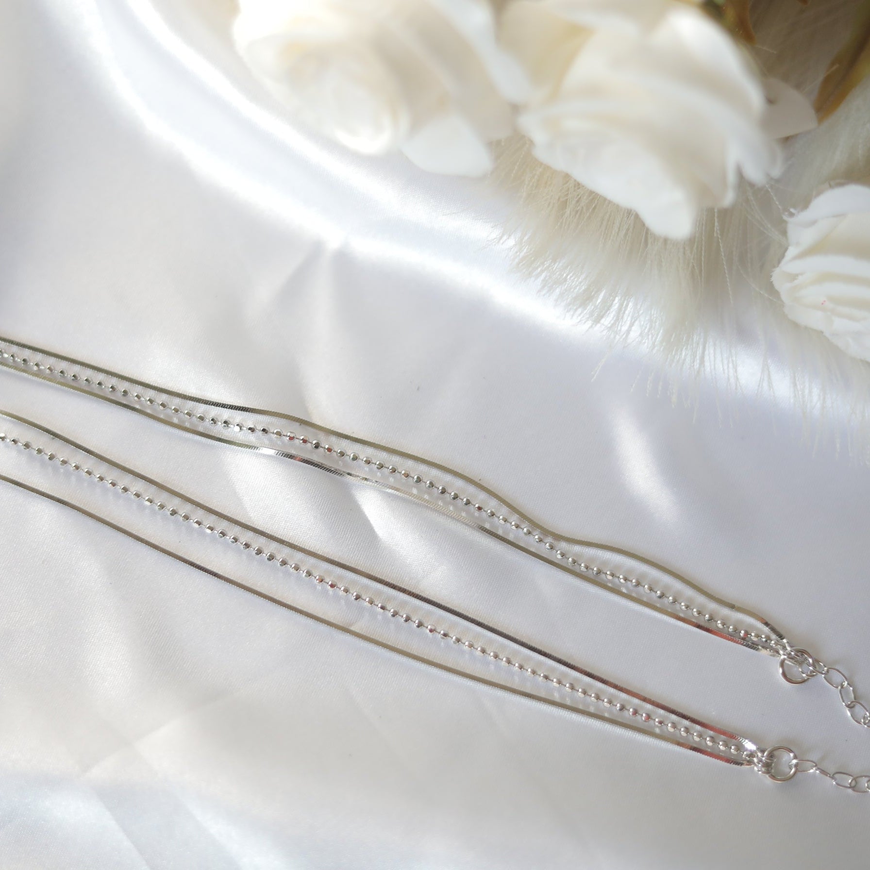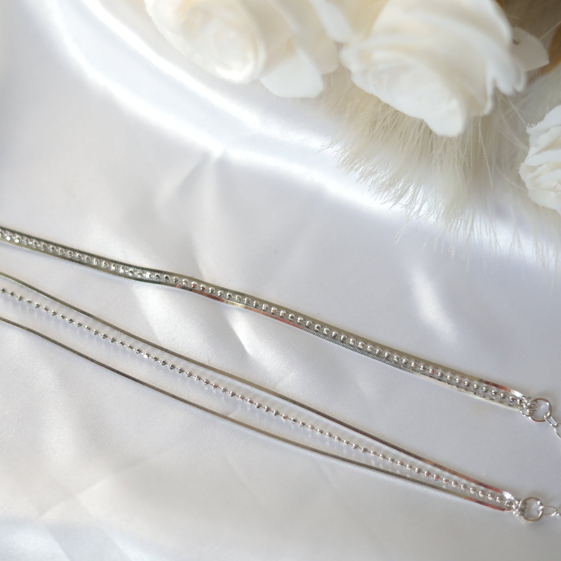 Crafted with precision, the dual-layer design offers a graceful contrast—one strand adorned with subtle beadwork for a touch of texture, while the other remains effortlessly smooth, exuding understated charm. The adjustable clasp ensures a comfortable fit, making it a perfect everyday accessory or an elegant addition to special occasions.