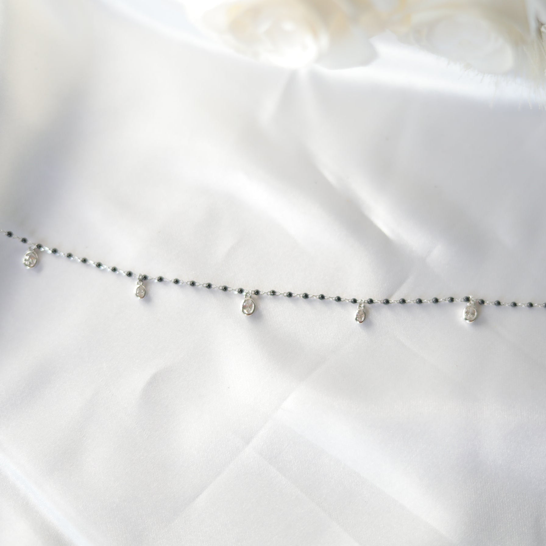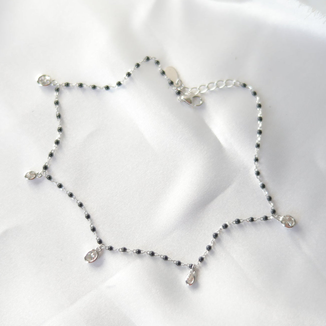 Let your style shine with the Silver Starlit Charm Anklet, a delicate blend of 92.5 sterling silver and timeless black beads, adorned with sparkling drop charms that dance with your every move. This minimal yet captivating piece is perfect for those who love understated elegance with a hint of sparkle.