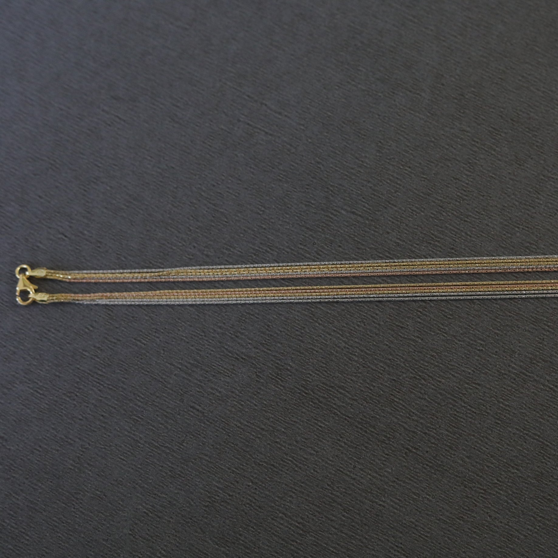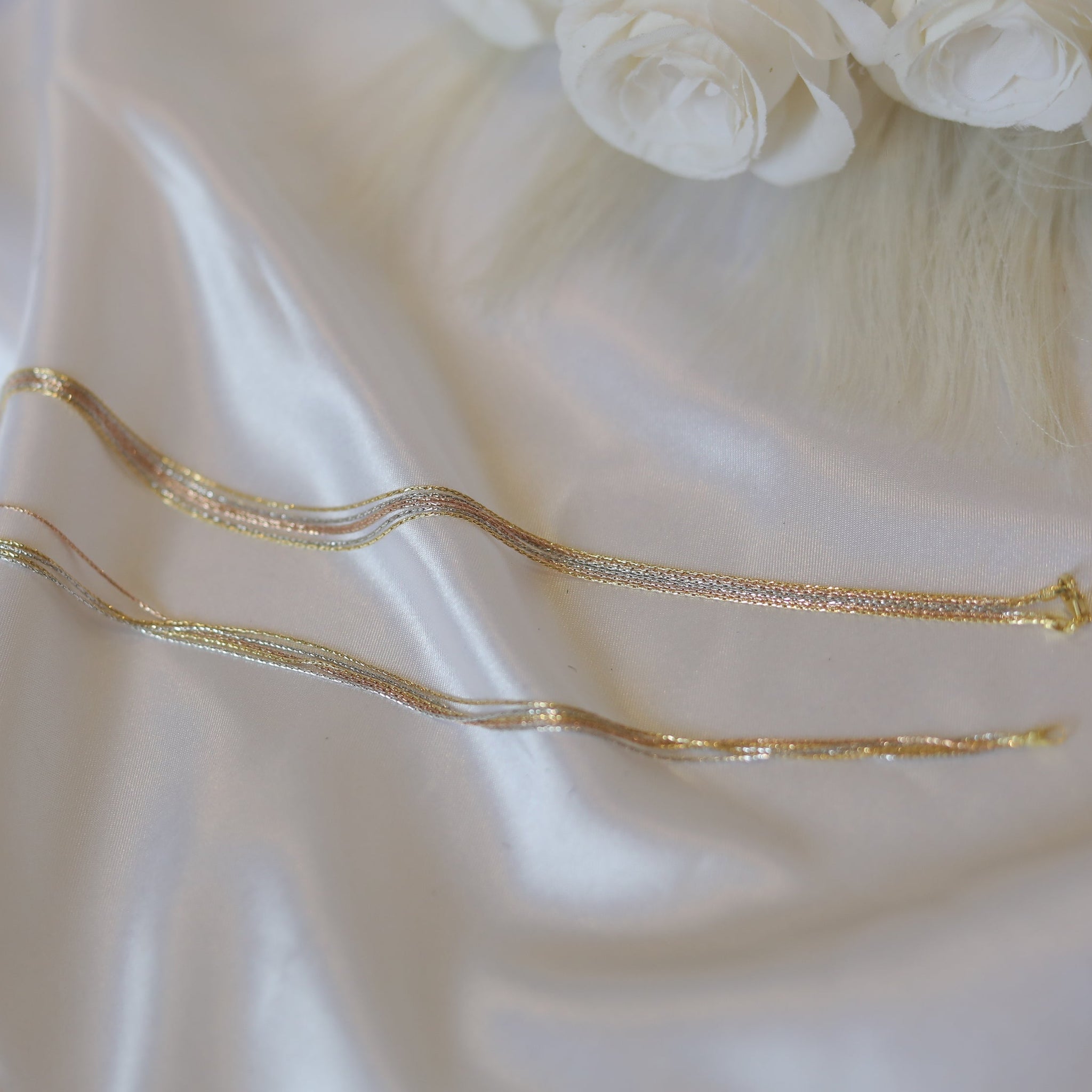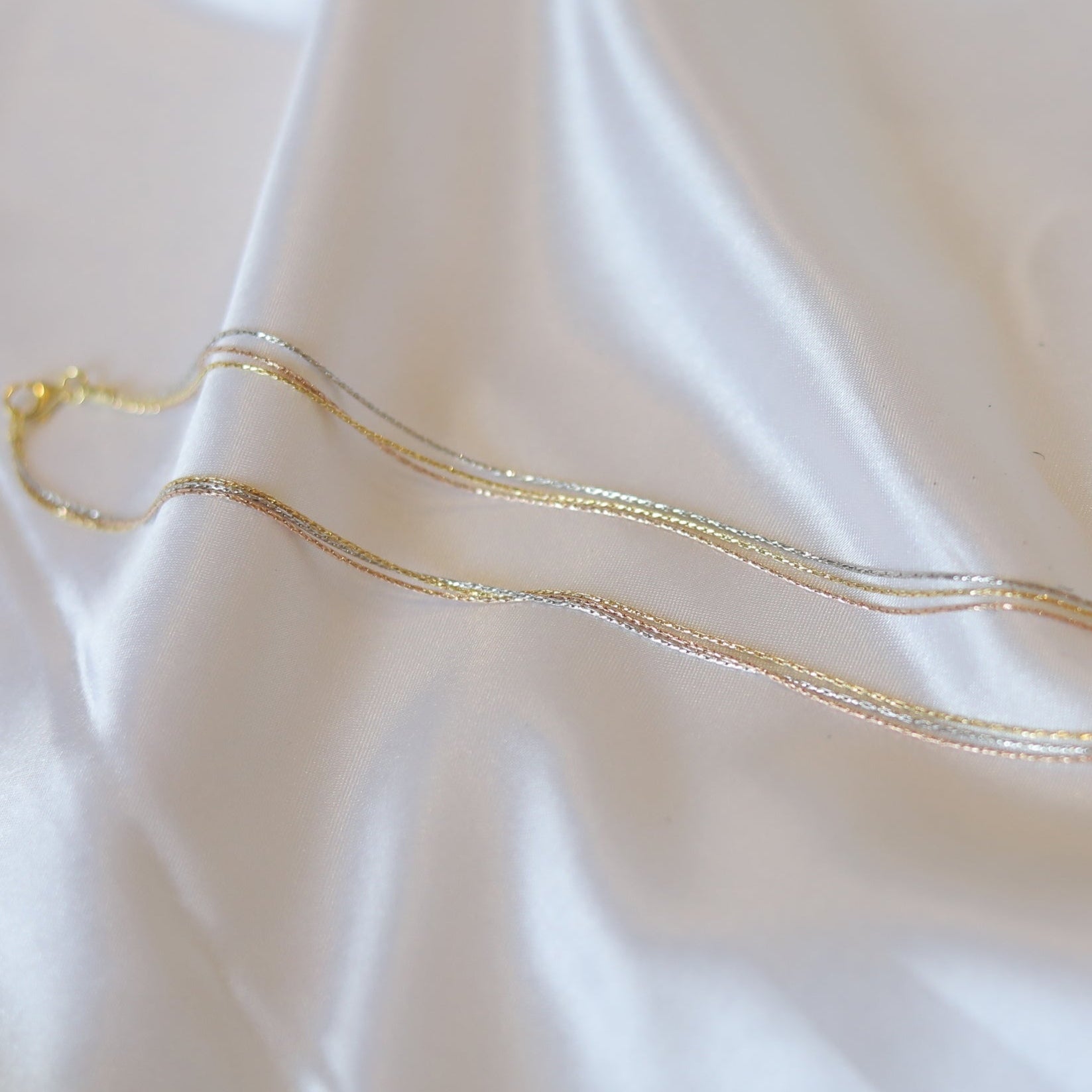The TriLina Anklet is a masterpiece of elegance, featuring five sleek strands of 92.5 sterling silver, beautifully plated in a harmonious trio of silver, gold, and rose gold. This exquisite design creates a layered yet lightweight look, adding depth and dimension to your style.