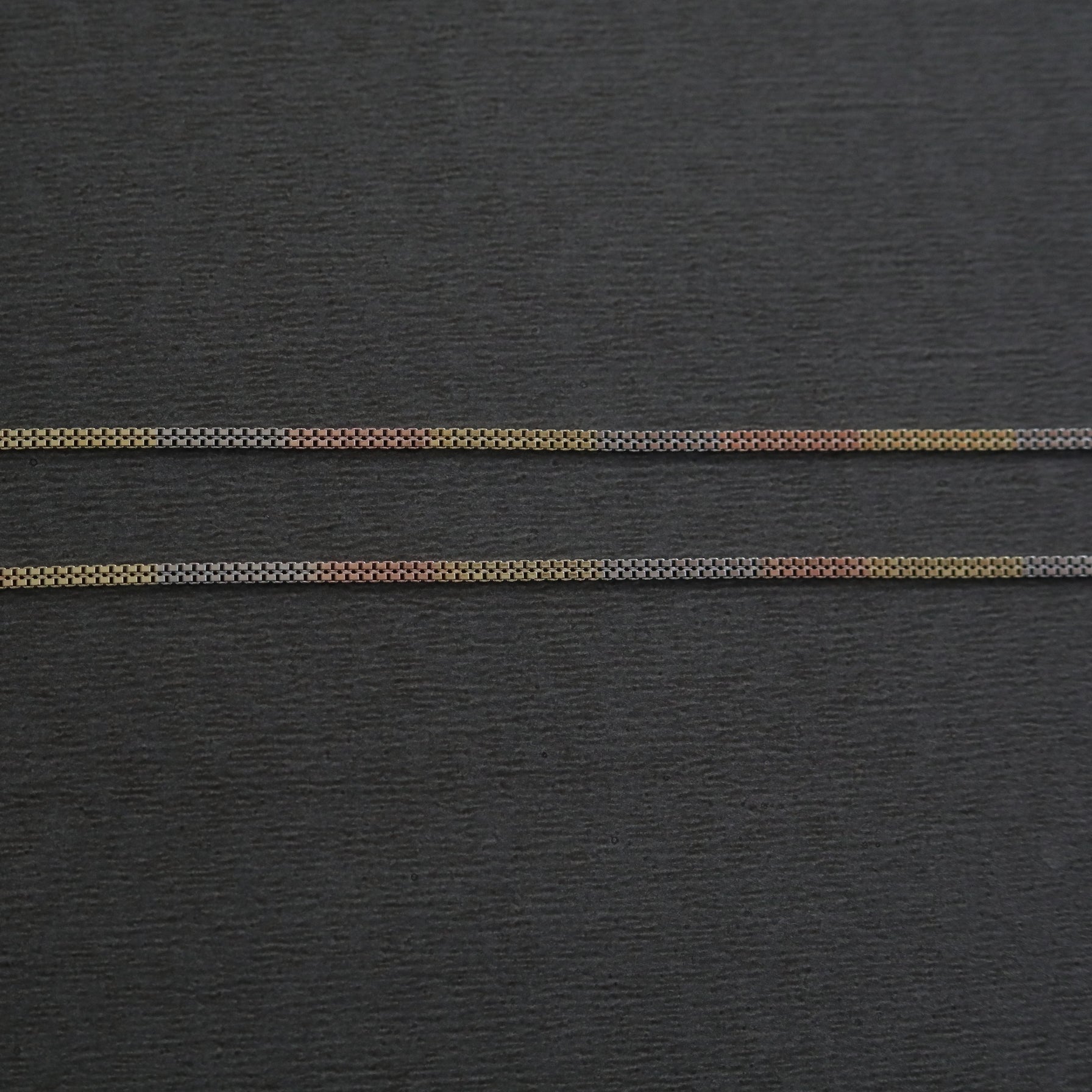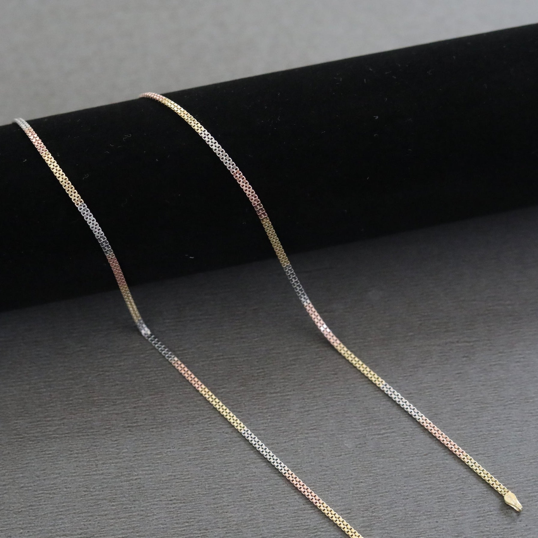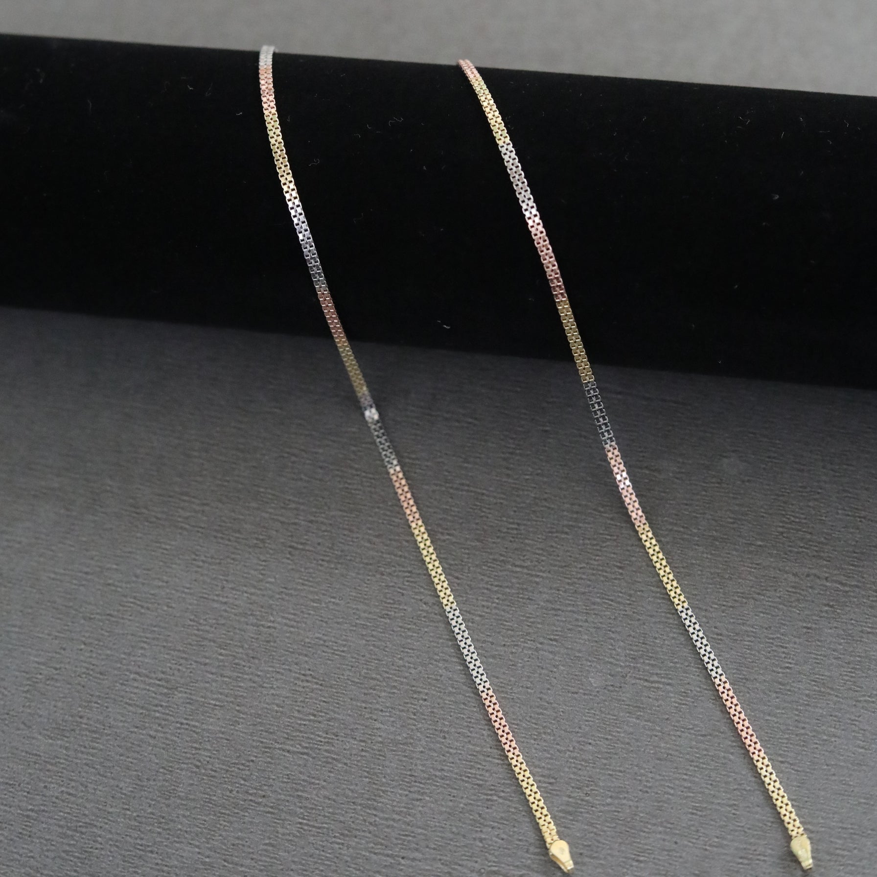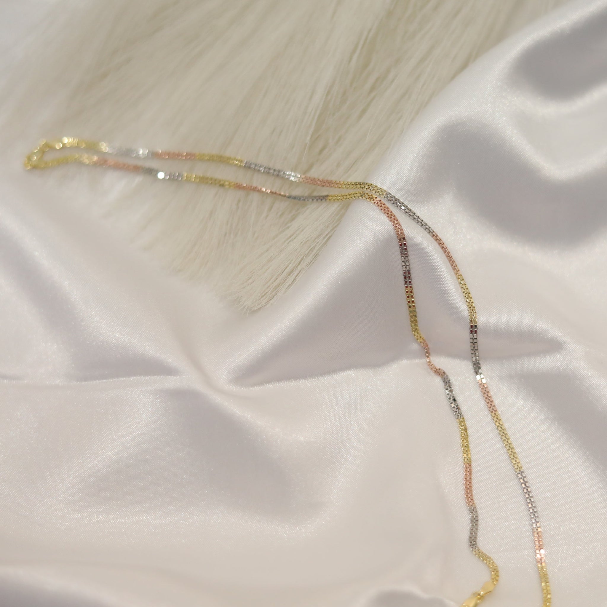 The Zara Anklet is a perfect blend of strength and elegance, featuring a box-style chain crafted from 92.5 sterling silver with a striking three-tone finish of silver, gold, and rose gold. Its sleek, structured links create a modern yet timeless look, making it an essential piece for any jewelry collection.