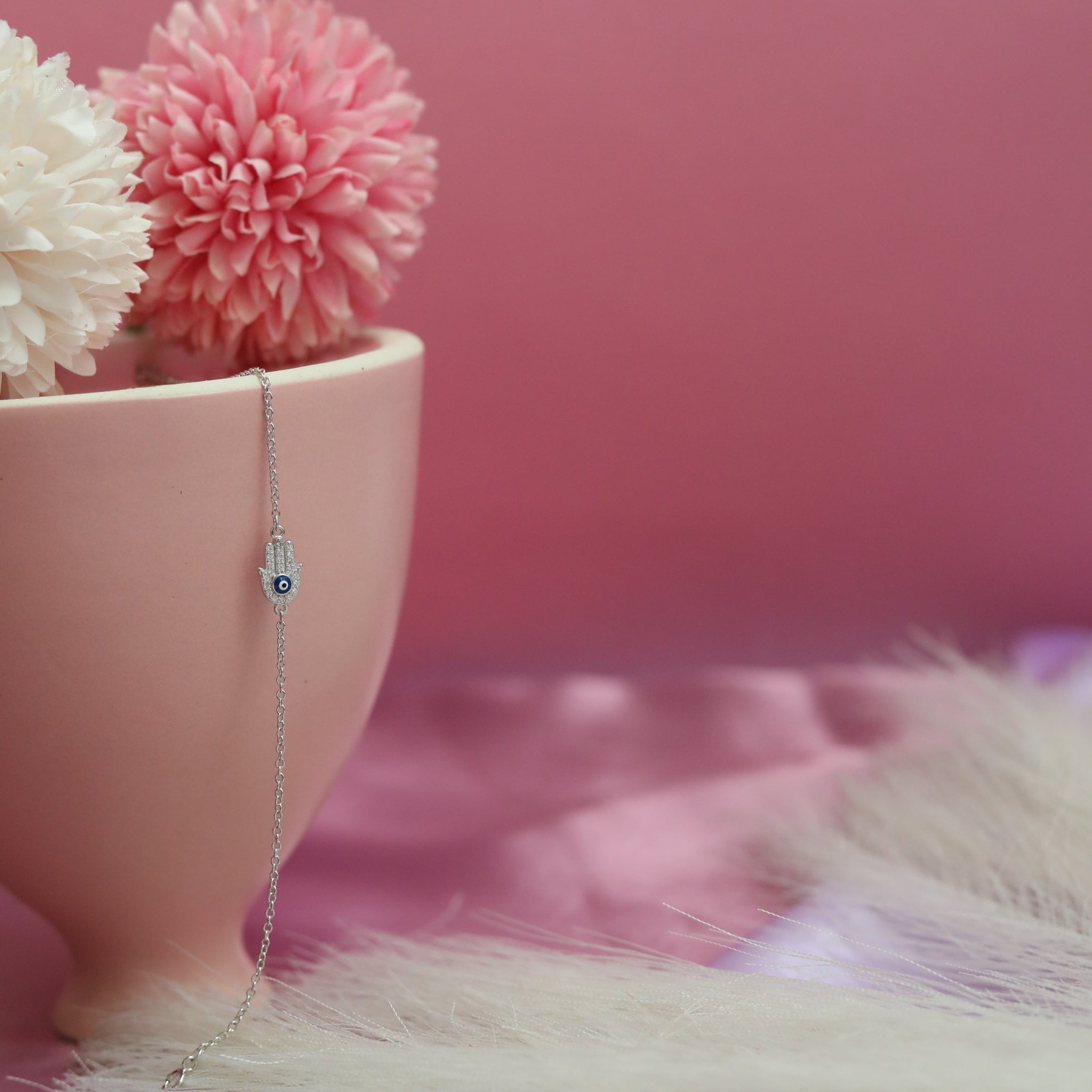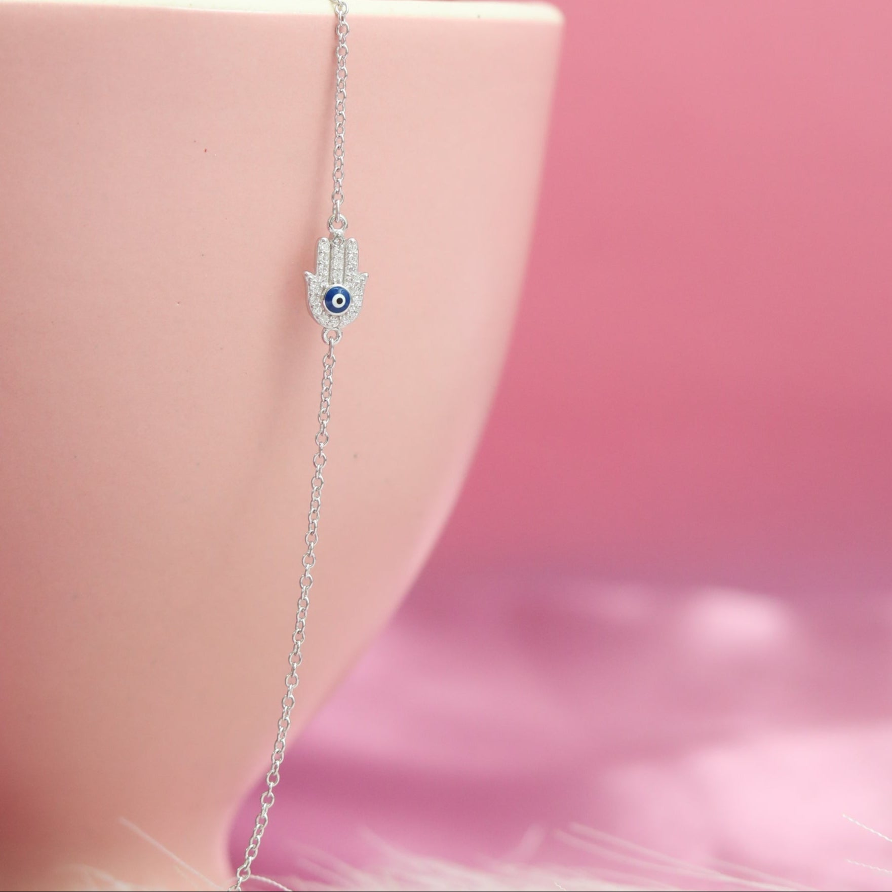 Introducing our Hamsa Evil Eye Bracelet, Crafted in 925 sterling silver, this delicate yet powerful piece shields you from negativity while adding a touch of timeless elegance to your wrist.