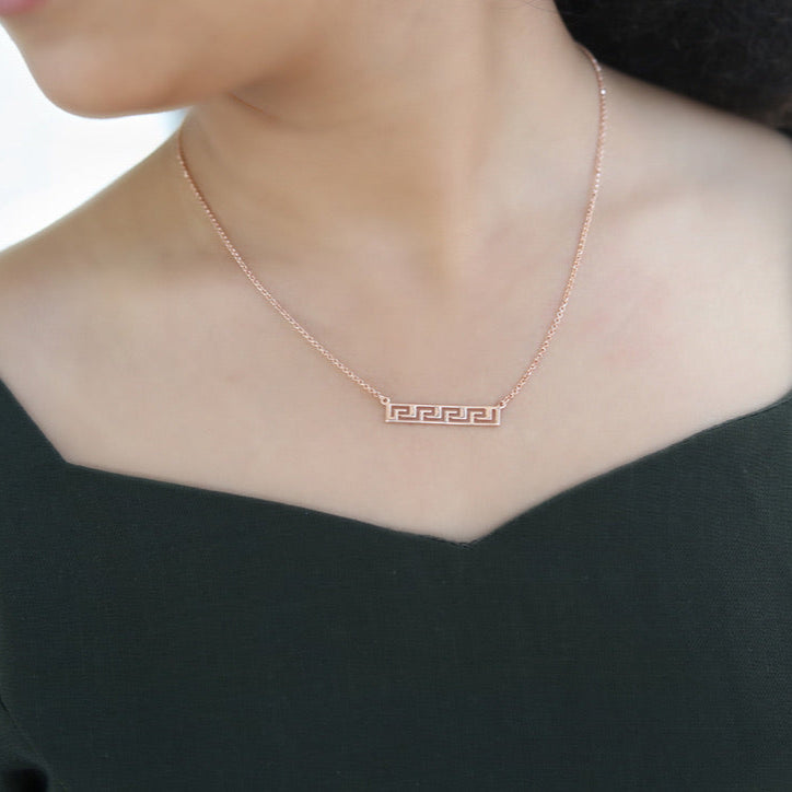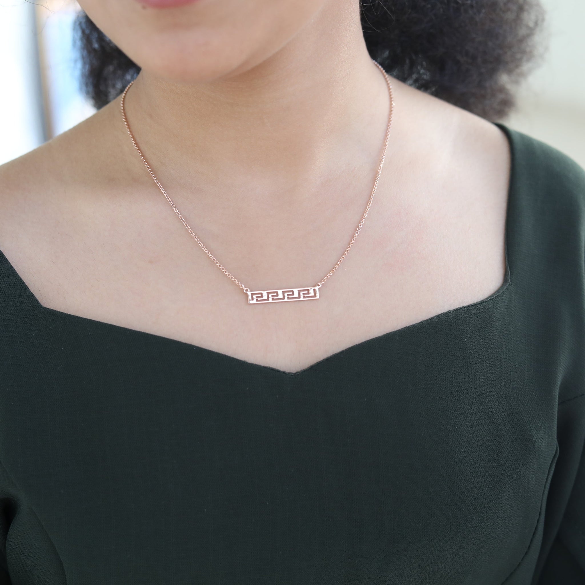 Get lost in the charm of Maze Craze, a necklace that turns minimalism into a statement. With its Greek key-inspired geometric design in stunning rose gold, this piece is a playful blend of symmetry and sophistication.