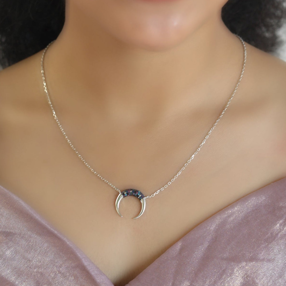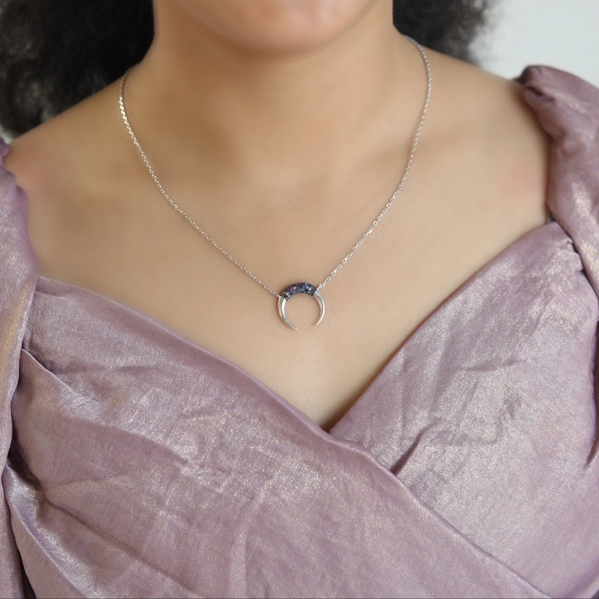 Meet Midnight Muse, the ultimate ode to the night sky. A delicate crescent moon pendant, kissed with deep sapphire-hued stones, this piece is designed for the dreamers, the thinkers, and the ones who find their magic after dark. Whether you're manifesting under the stars or simply adding a touch of celestial elegance to your outfit, this necklace is your perfect muse.