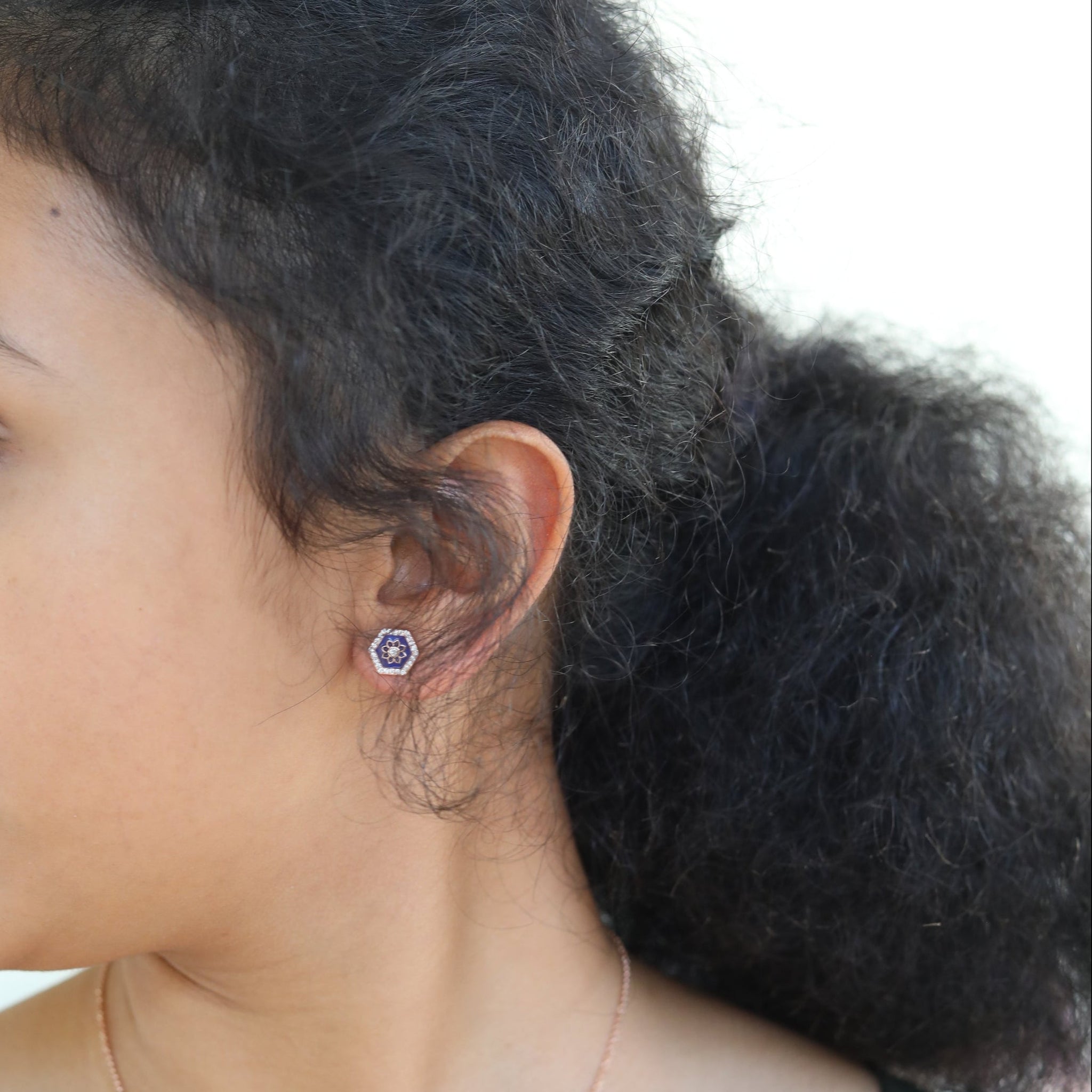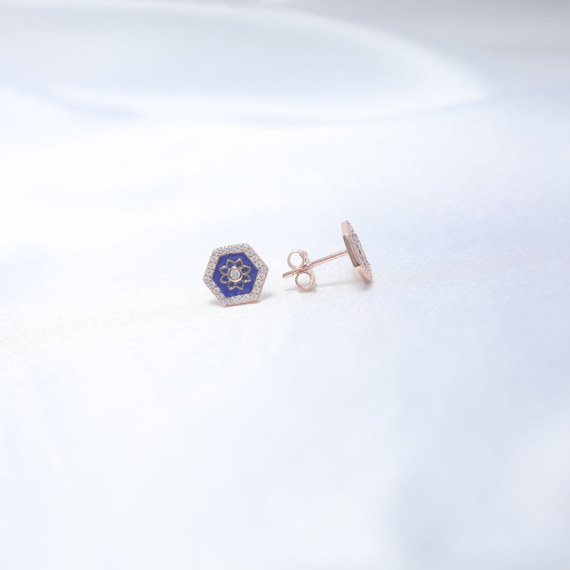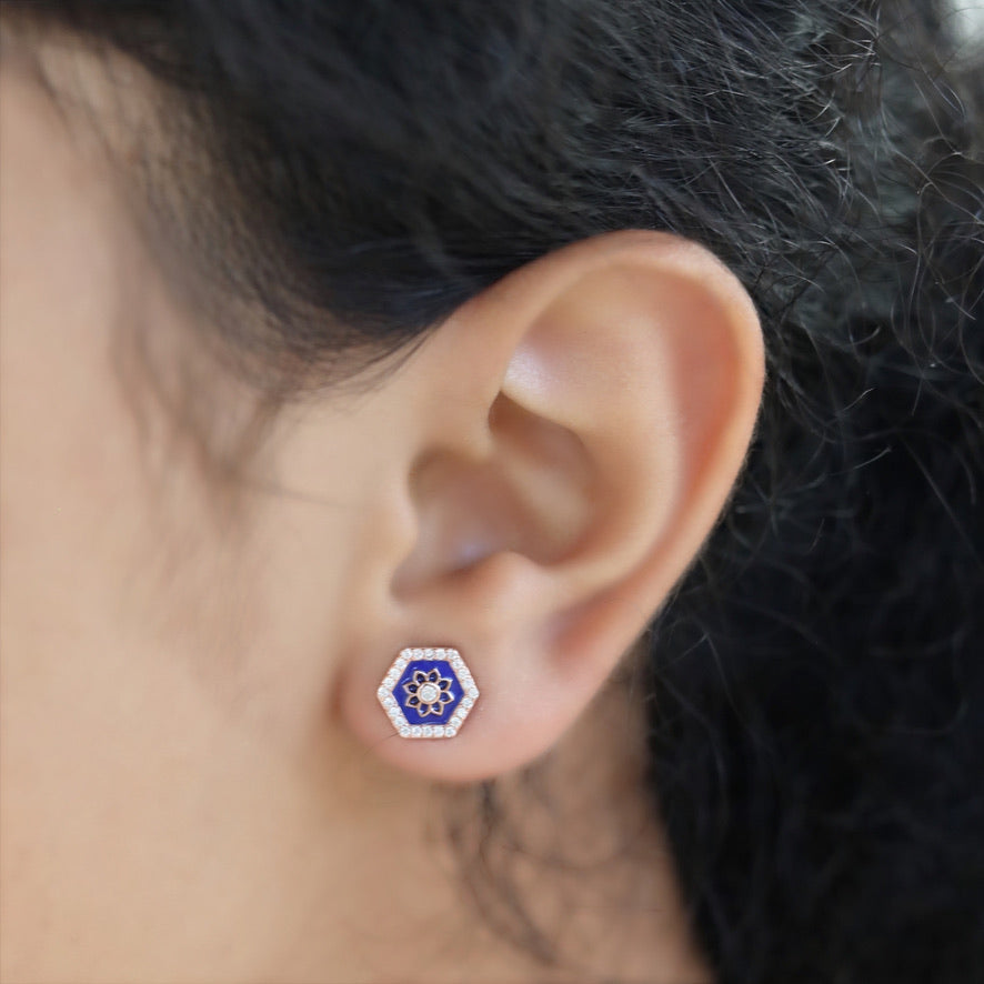 Design: A captivating hexagonal stud earring featuring a beautiful floral motif at the center. The deep indigo enamel base highlights the delicate flower, which is surrounded by a dazzling border of cubic zirconia stones for added sparkle.