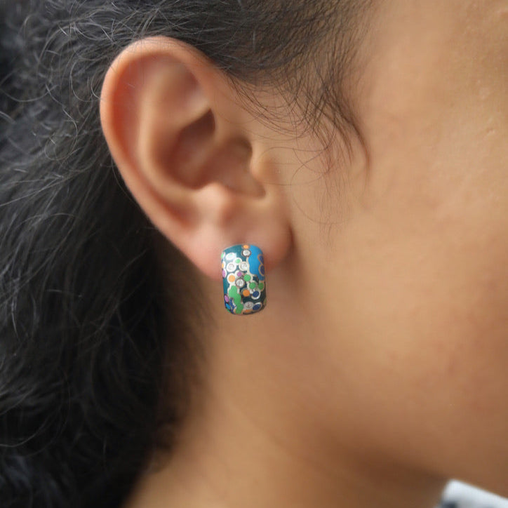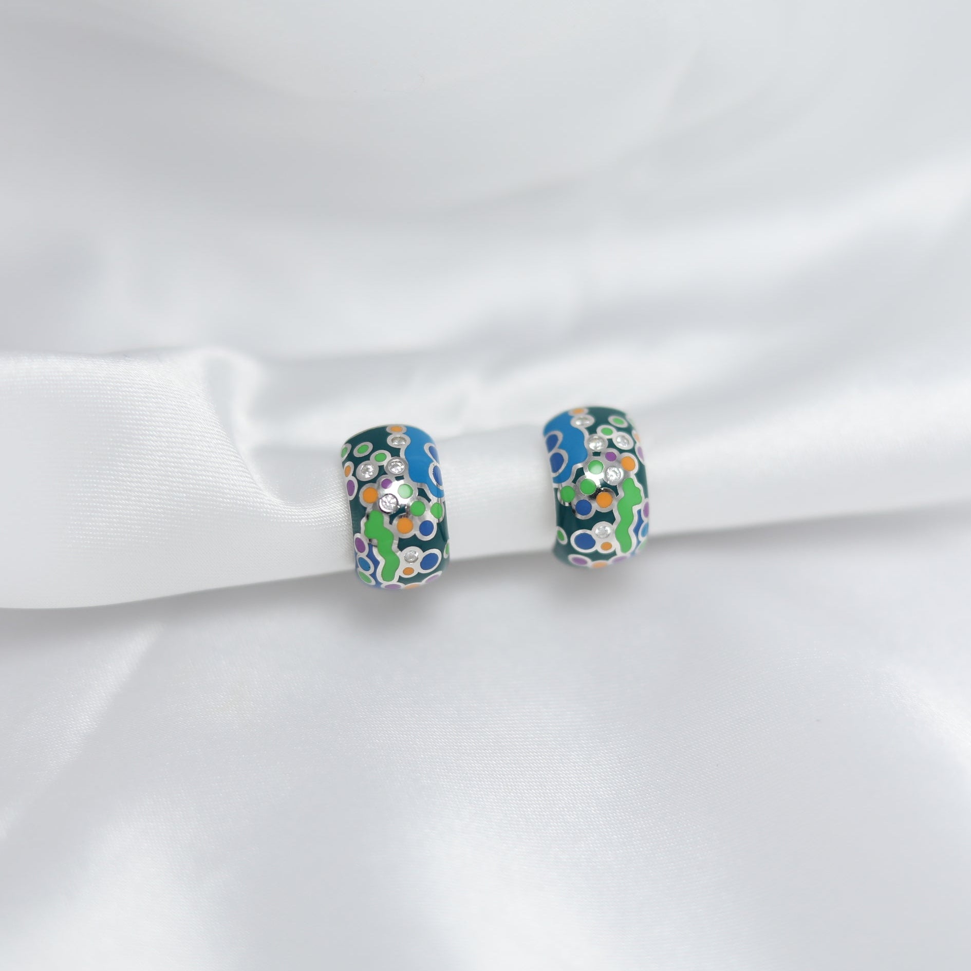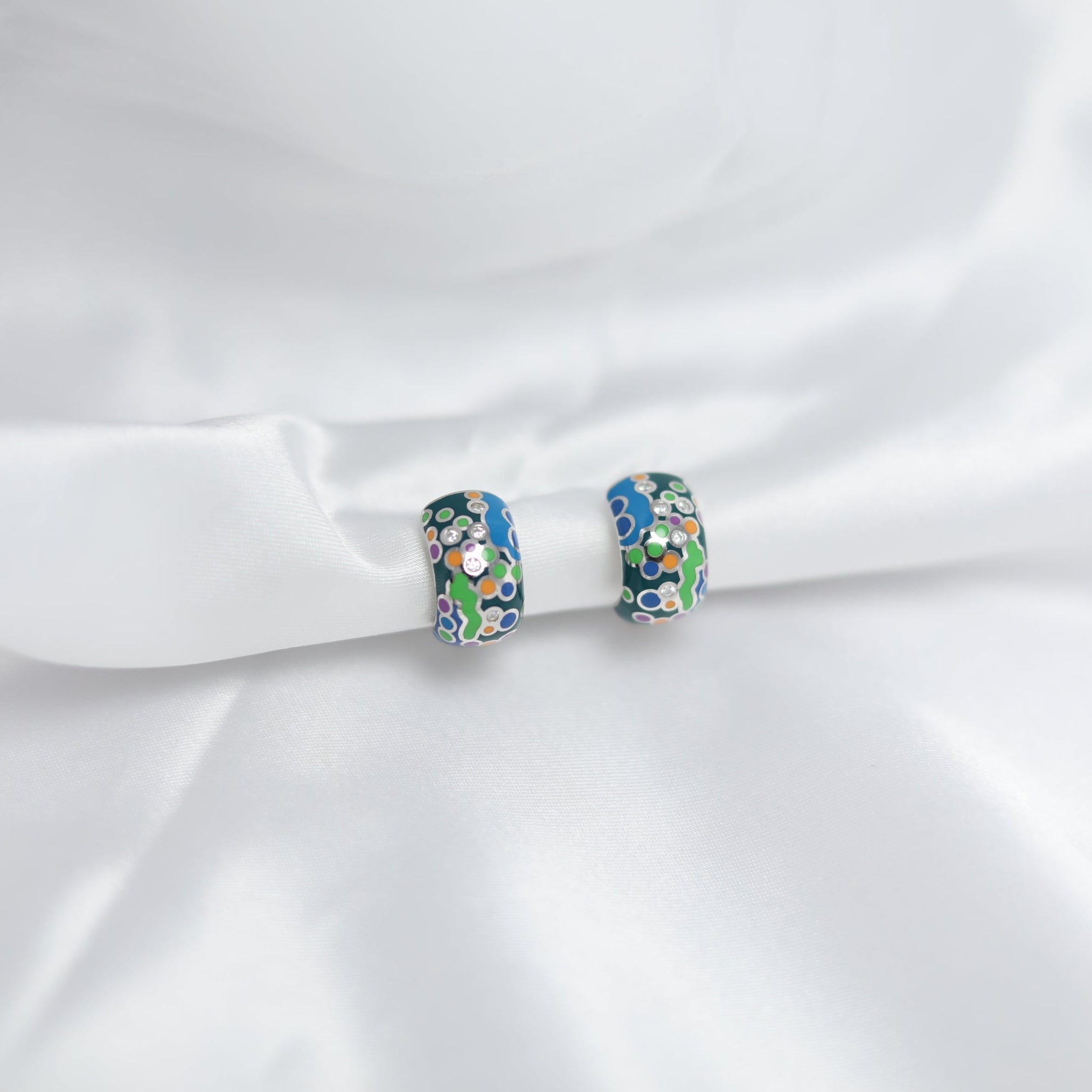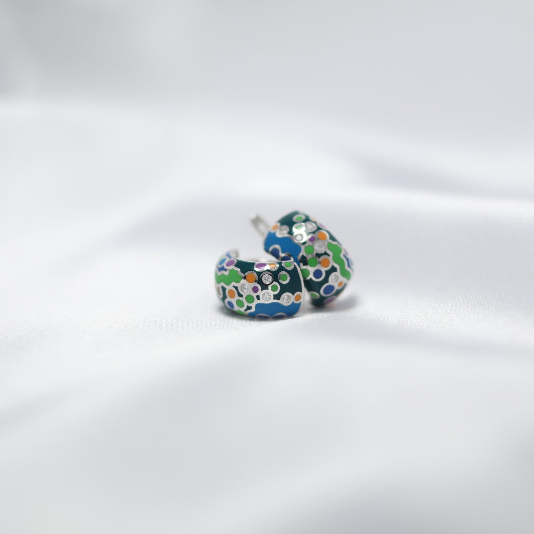 Inspired by the endless beauty of a starry night, the Starlit Hoops are a true testament to celestial elegance. Crafted from premium sterling silver, these exquisite hoops feature intricate hand-painted enamel details in a mesmerizing blend of deep blues, lush greens, and shimmering accents. Each delicate curve and pattern is reminiscent of twinkling constellations, capturing the magic of the night sky in every glance.