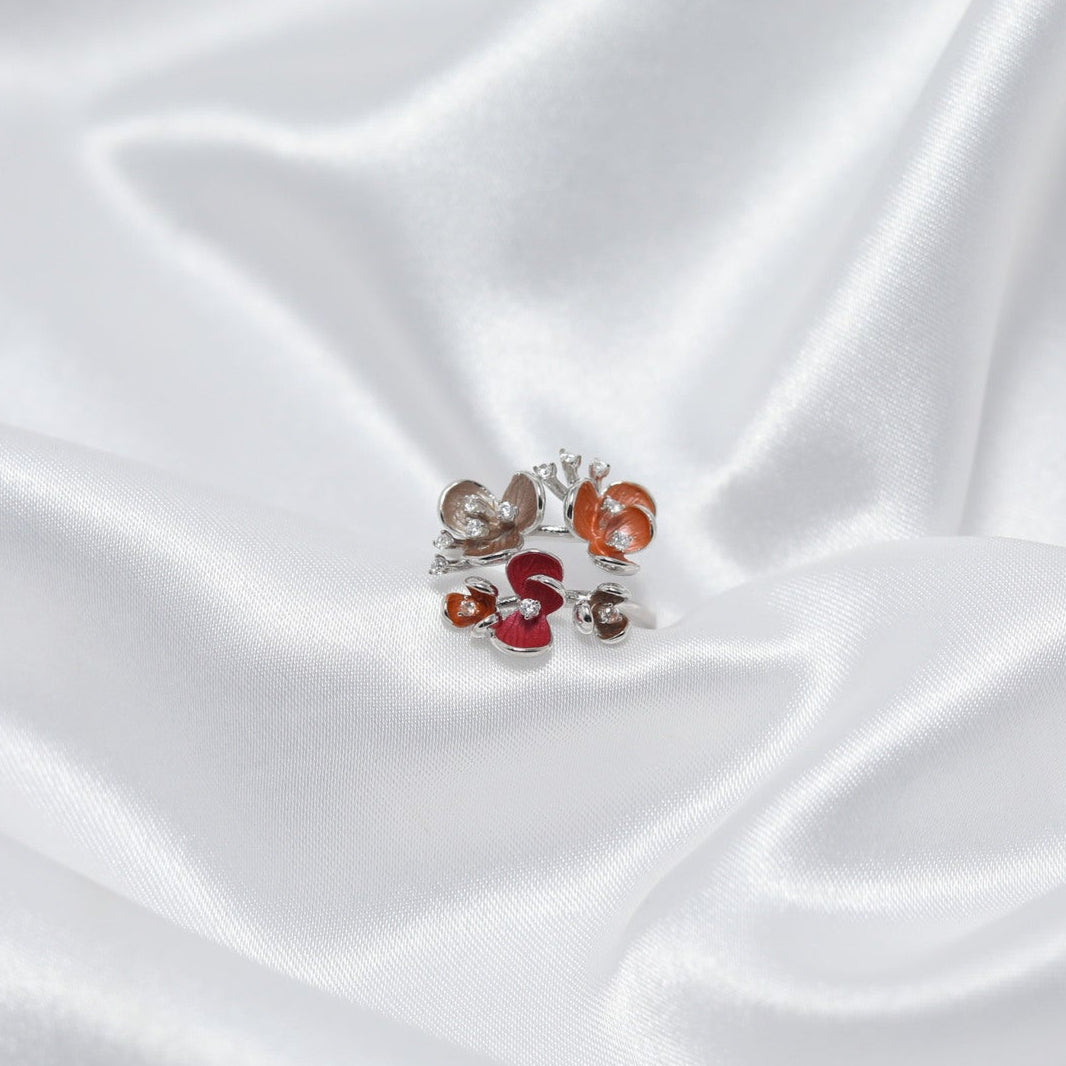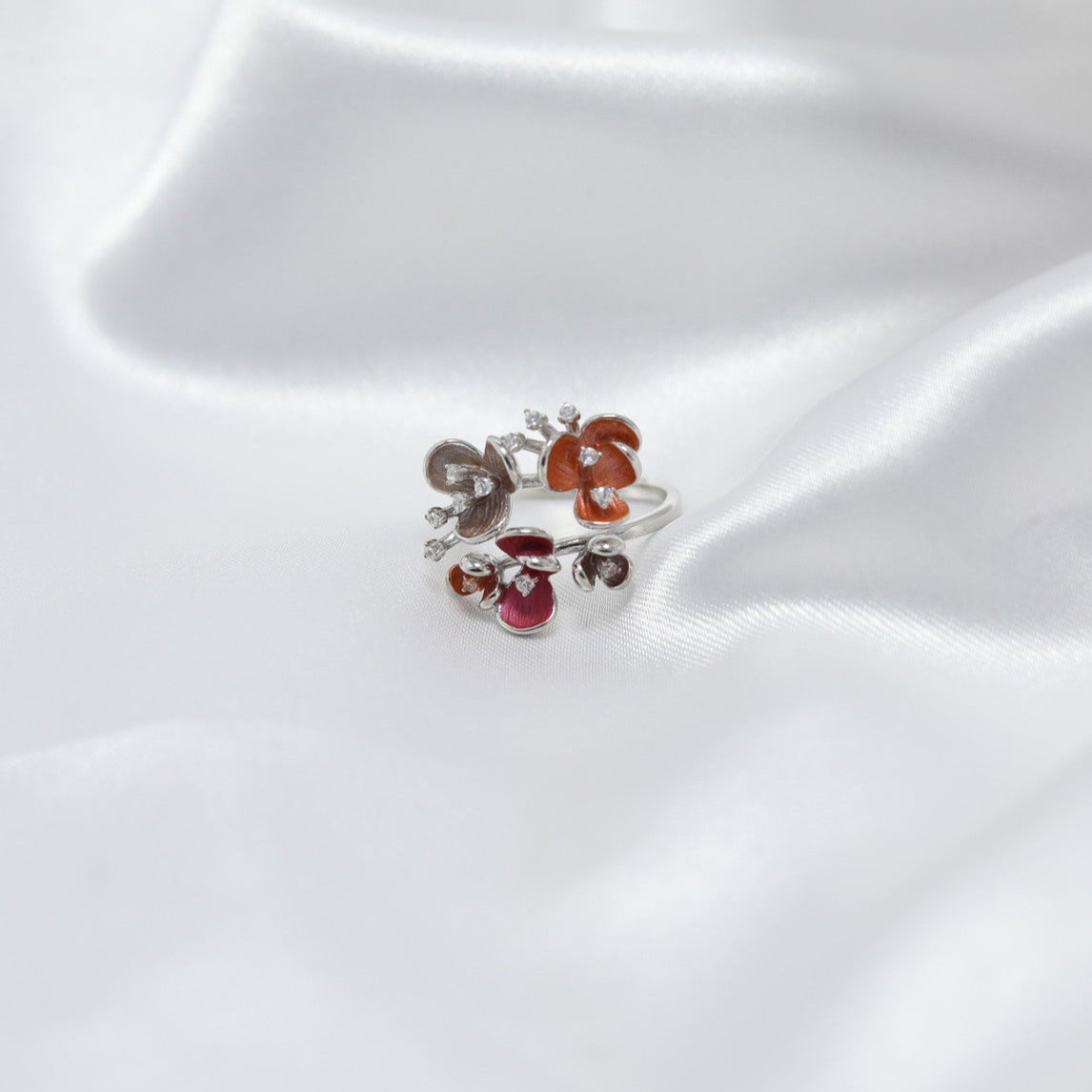 Like leaves swirling in a crisp autumn breeze, Autumn Whirl captures the richness of the season in a delicate floral form. Handcrafted in pure 92.5 sterling silver, this open ring features three beautifully detailed enamel flowers in deep plum, rustic orange, and soft taupe — each centered with a glimmering zircon that adds a subtle sparkle.
