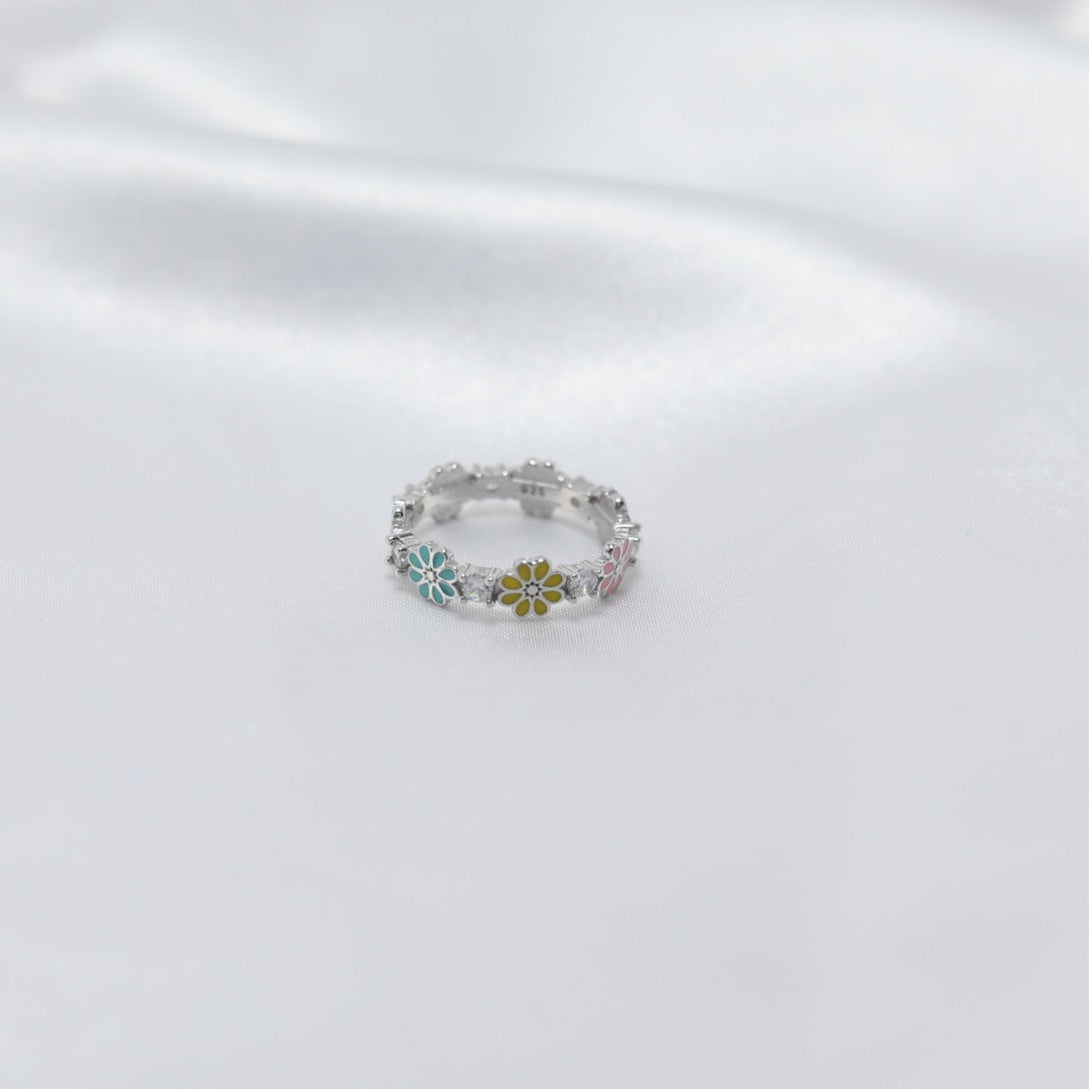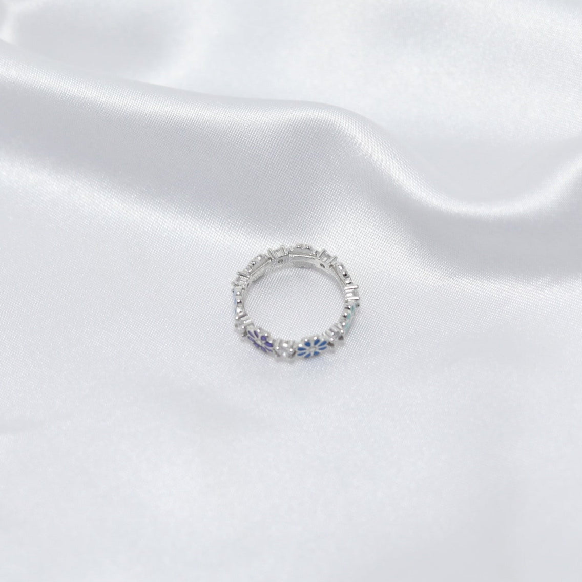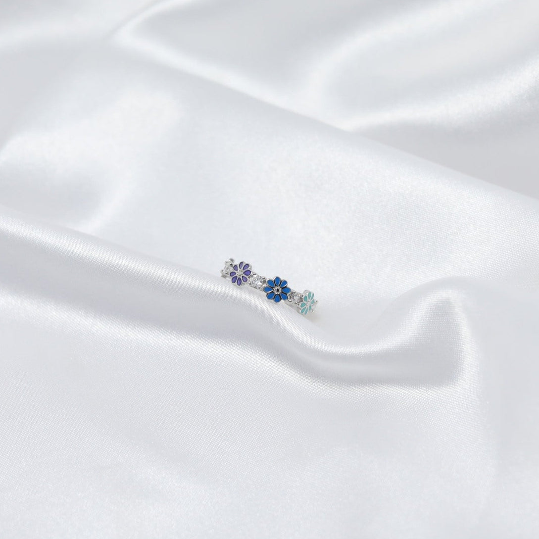 Like a soft breeze through a blooming meadow, Wildflower Whisper brings together delicate beauty and effortless charm. Handcrafted in pure 92.5 sterling silver, this open ring features a trail of tiny wildflowers in dreamy enamel hues — lilac, sky blue, and soft teal — each bloom touched with a glimmering white zircon at its heart.