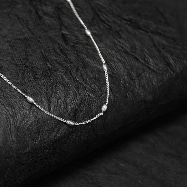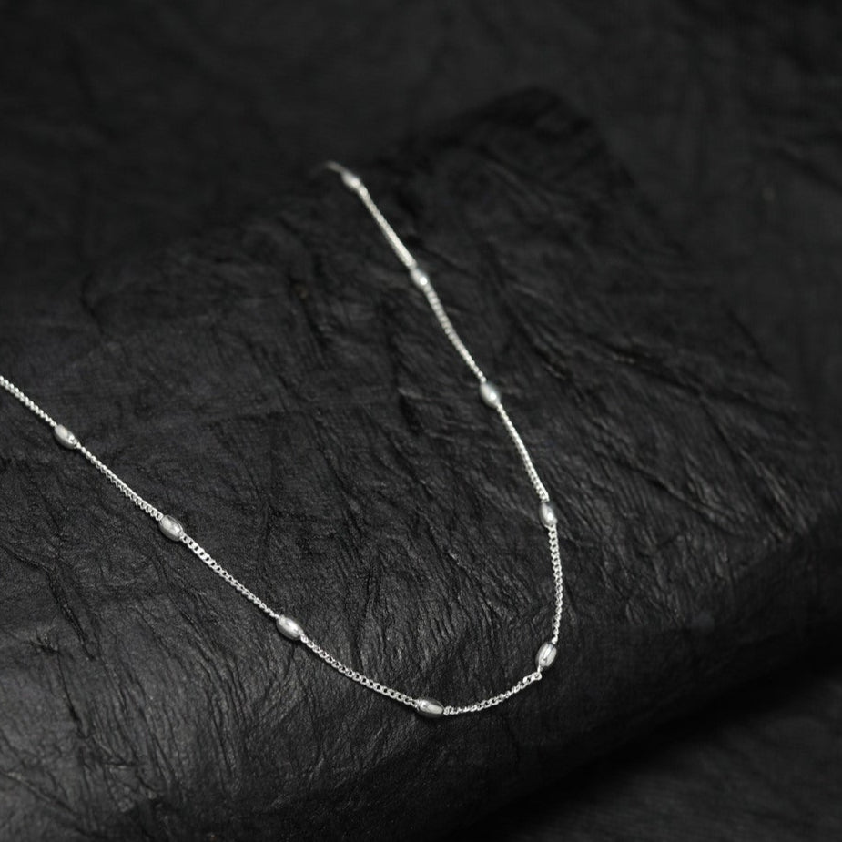 Elevate your everyday elegance with the Silver Pebble Chain — a delicate fusion of minimalist design and timeless charm. Crafted in pure 92.5 sterling silver, this chain features evenly spaced, pebble-like bead accents that add a subtle texture and shine. Lightweight, versatile, and effortlessly chic — perfect for solo styling or layering.