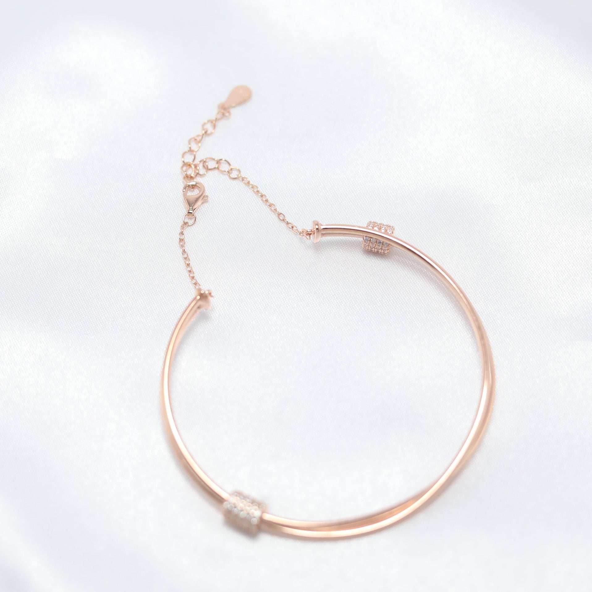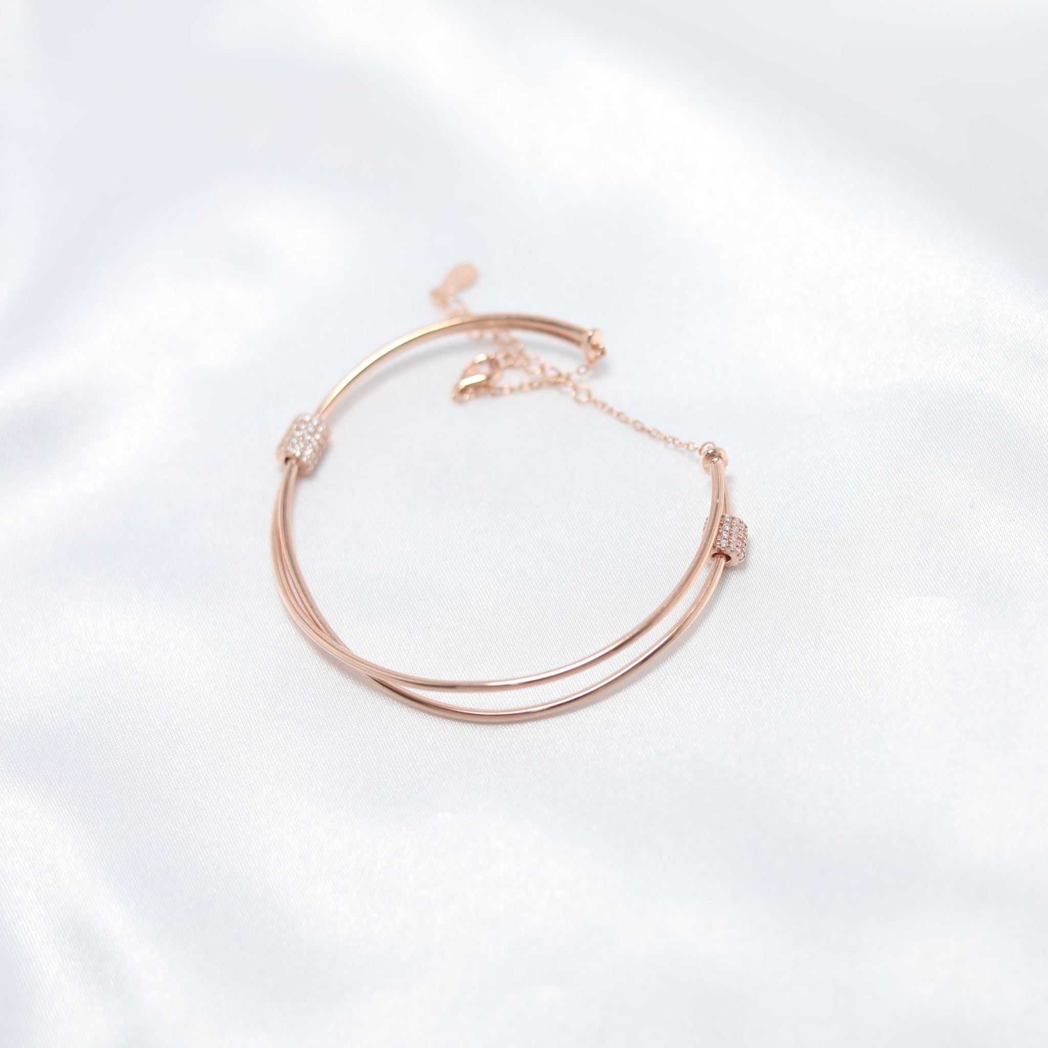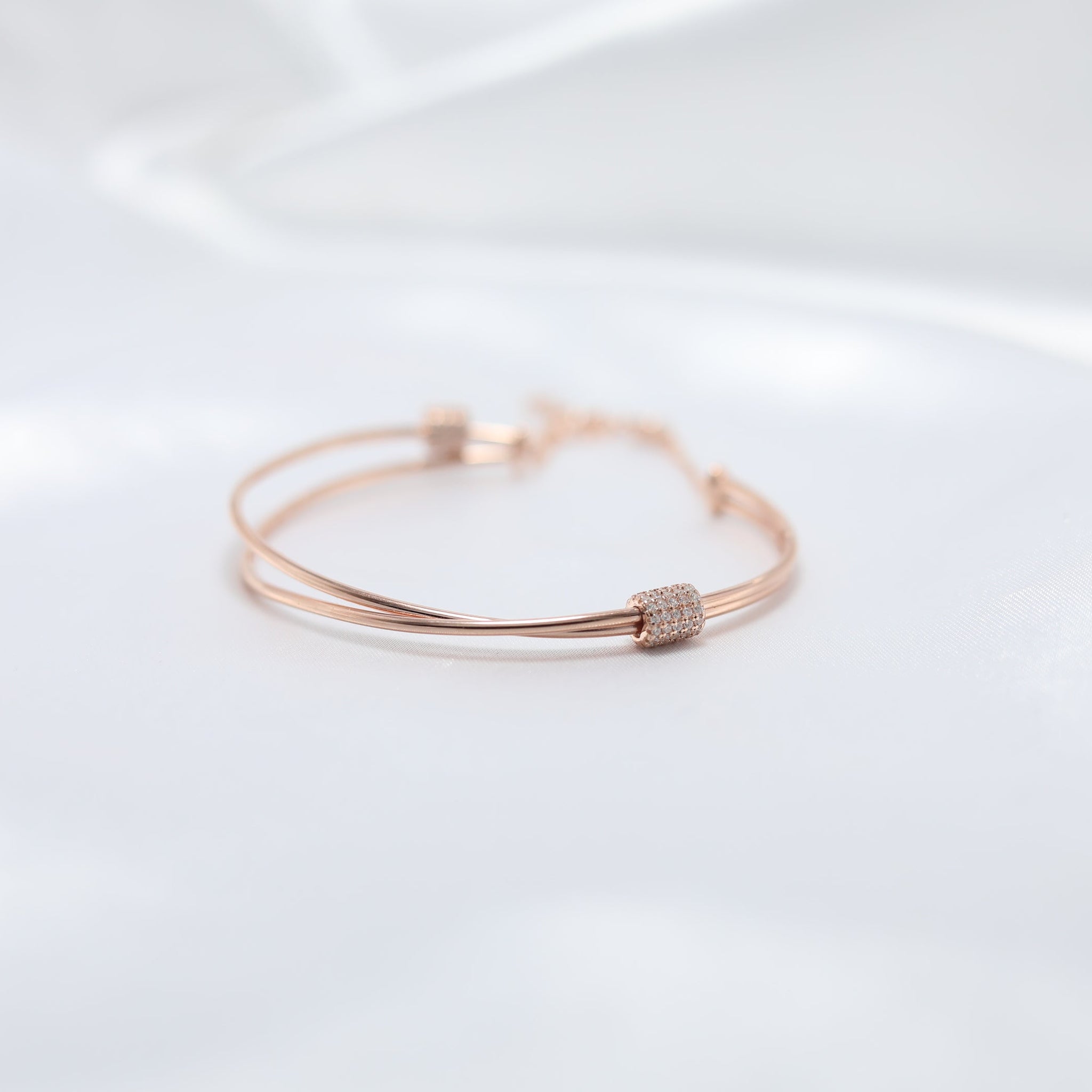 A symbol of elegance and strength, the Aurora Knot Kada is designed for the modern woman who appreciates timeless beauty with a contemporary twist. Crafted in 925 sterling silver with a luxurious rose gold finish, this kada features an intricate double-band design, gracefully intertwined with shimmering zircon-studded knots.