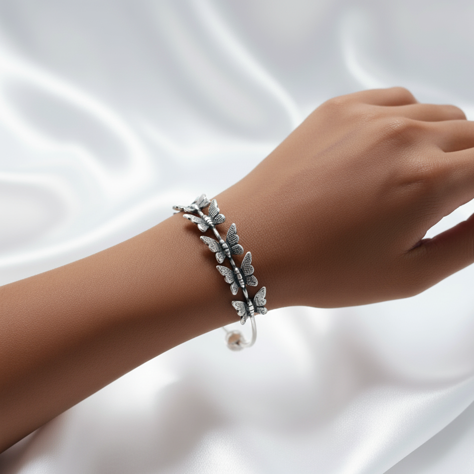 Delicate, elegant, and full of charm, the Flutter Kada is designed for those who embrace transformation and beauty. Crafted in premium 925 silver, this kada features a stunning row of intricately detailed butterflies, symbolizing freedom, growth, and new beginnings.