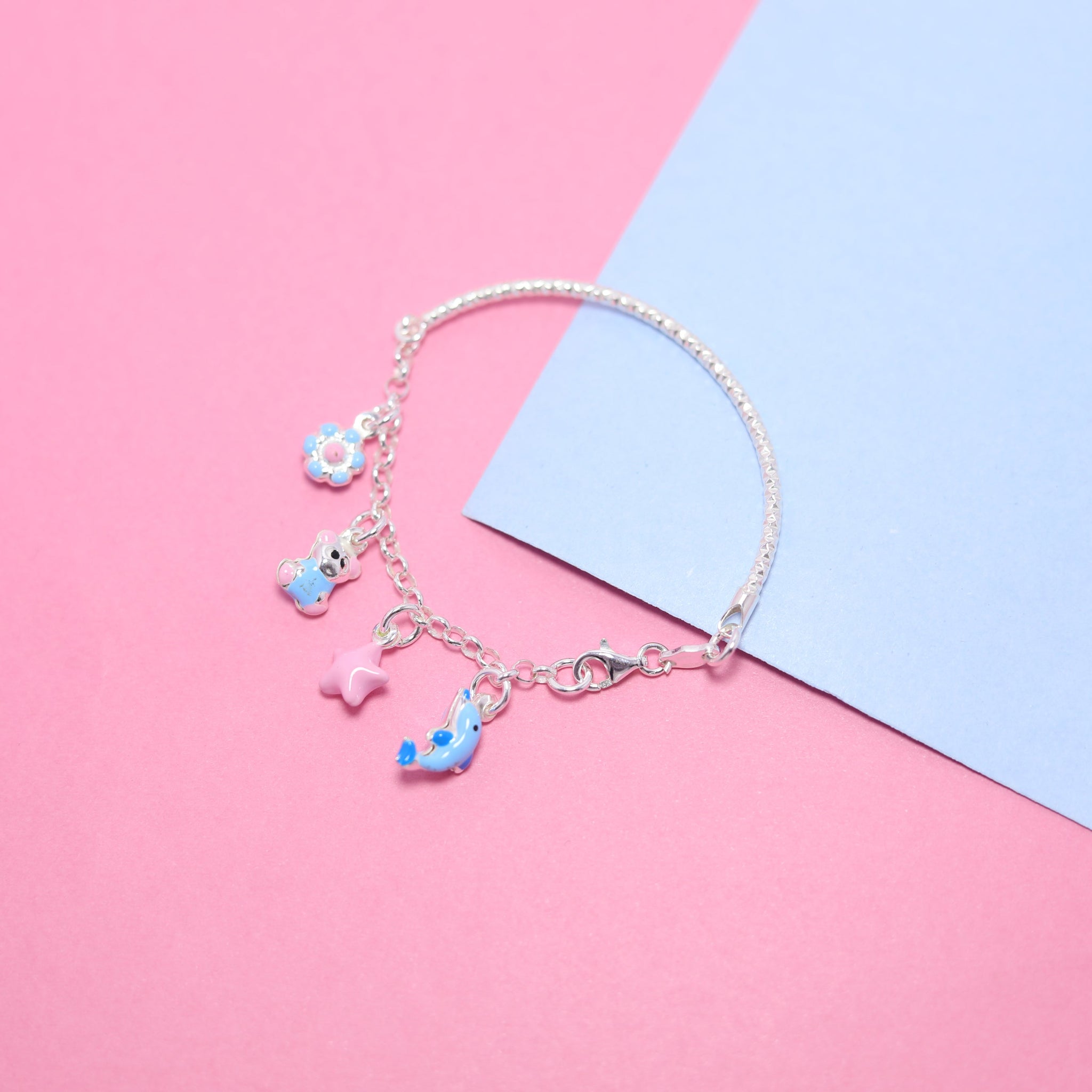 Add a touch of whimsy and wonder to your little one’s jewelry collection with our Dreamy Charms Baby Bracelet. Crafted in 925 sterling silver, this adorable bracelet features delicate pastel enamel charms, including a teddy bear, moon, star, dolphin, and flower, making it a playful yet elegant piece for tiny wrists.
