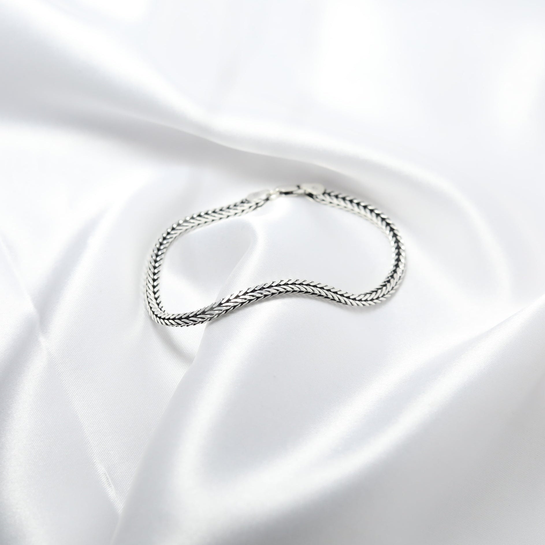 A bold yet refined statement of craftsmanship, the Wheat Chain Bracelet is designed for those who appreciate both strength and sophistication. Crafted from 925 sterling silver, its intricate interwoven links create a luxurious texture that catches the light beautifully.