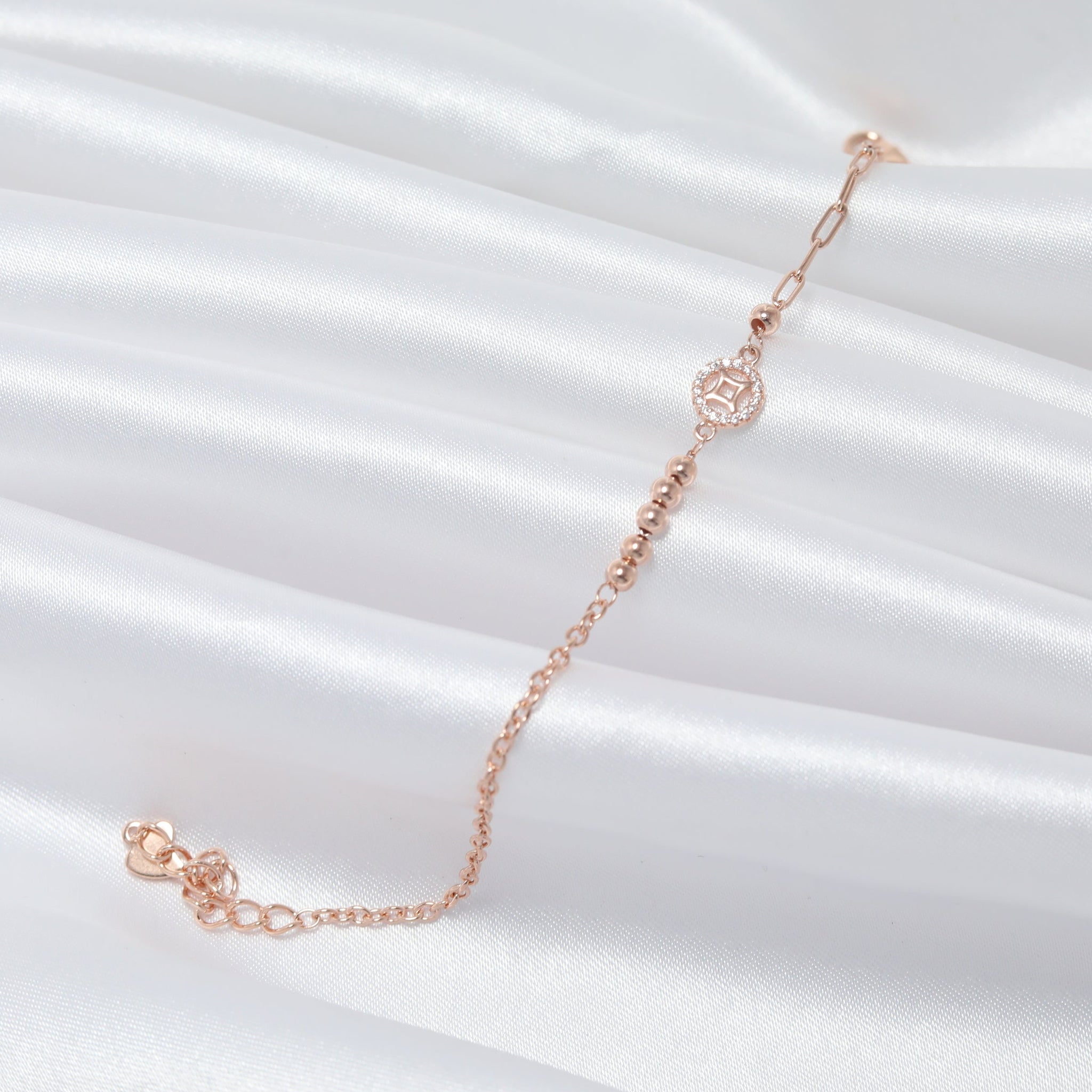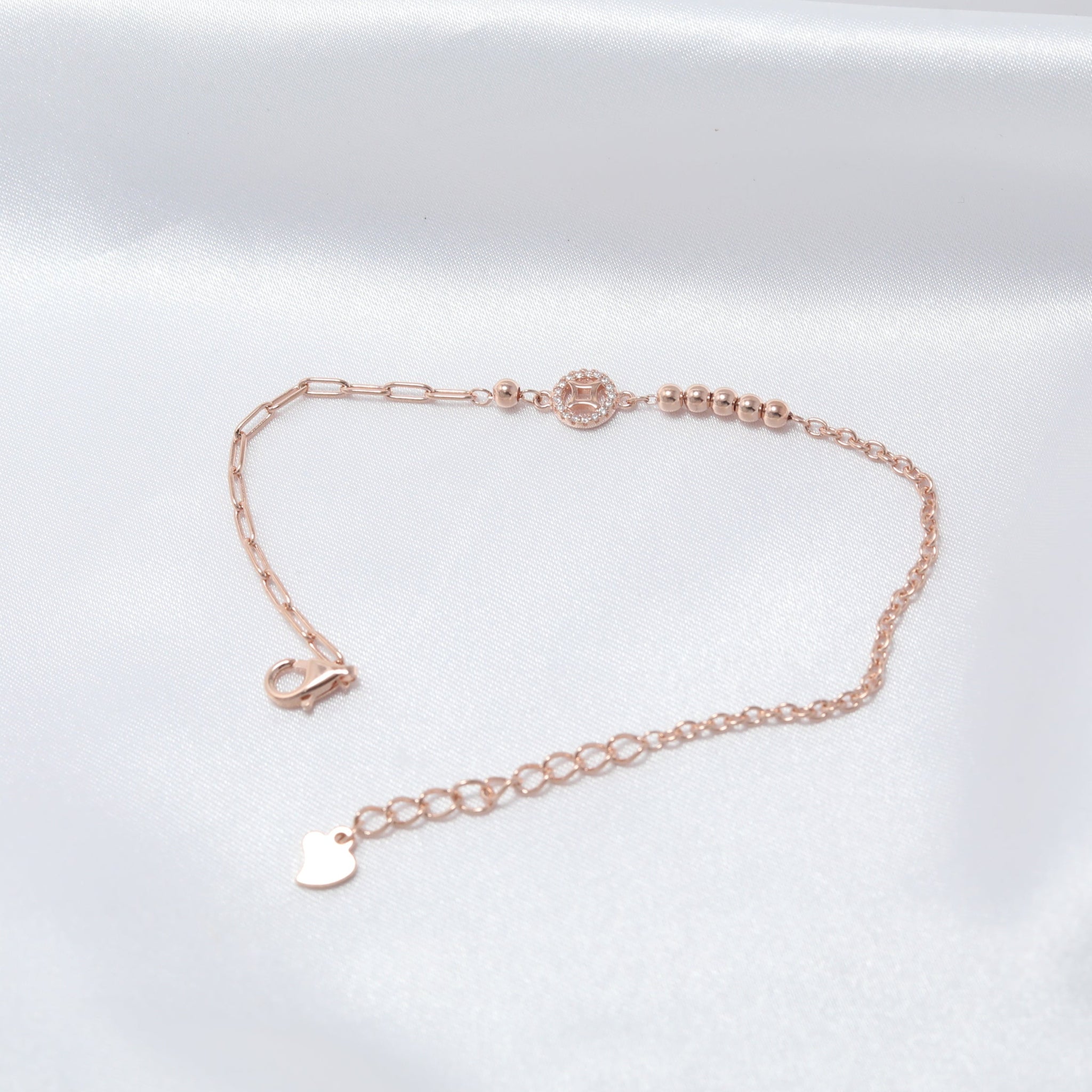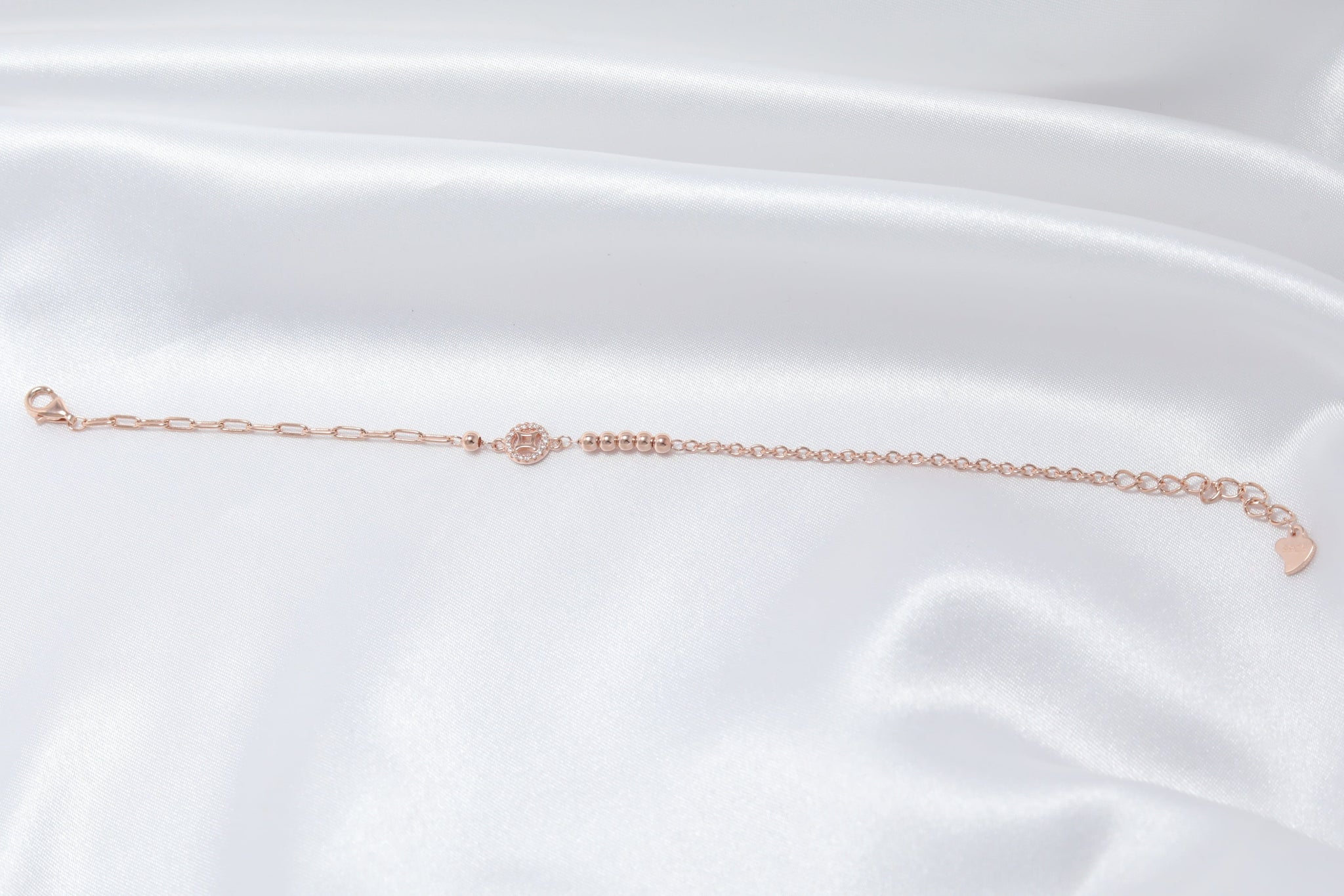 Introducing the Ishara Bracelet, a piece that embodies grace and elegance with every subtle detail. Crafted in gleaming rose gold, this bracelet features an intricate, minimalist charm encrusted with radiant cubic zirconia stones. Its design is inspired by the beauty of simplicity — delicate yet impactful, perfect for those who appreciate the finer things in life.