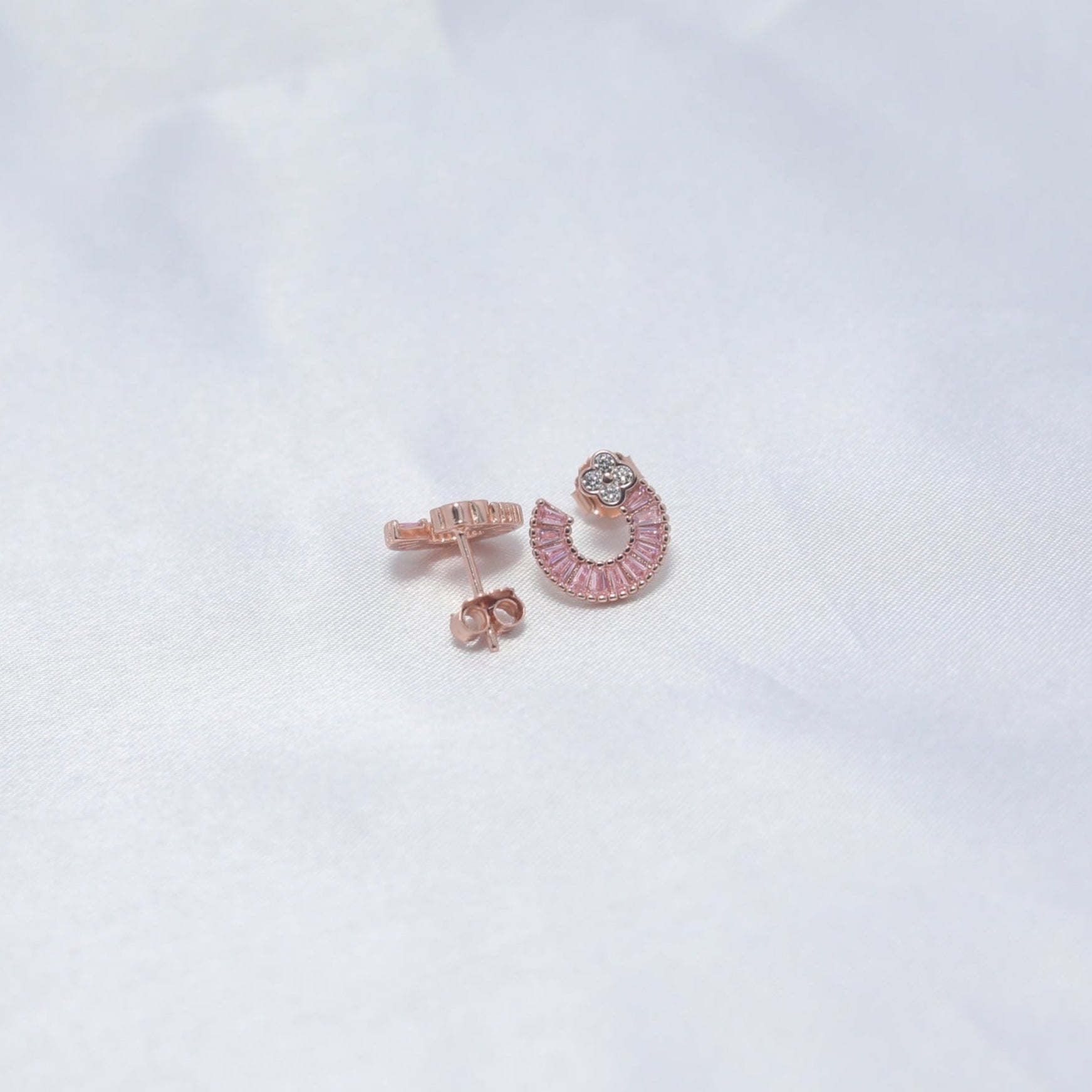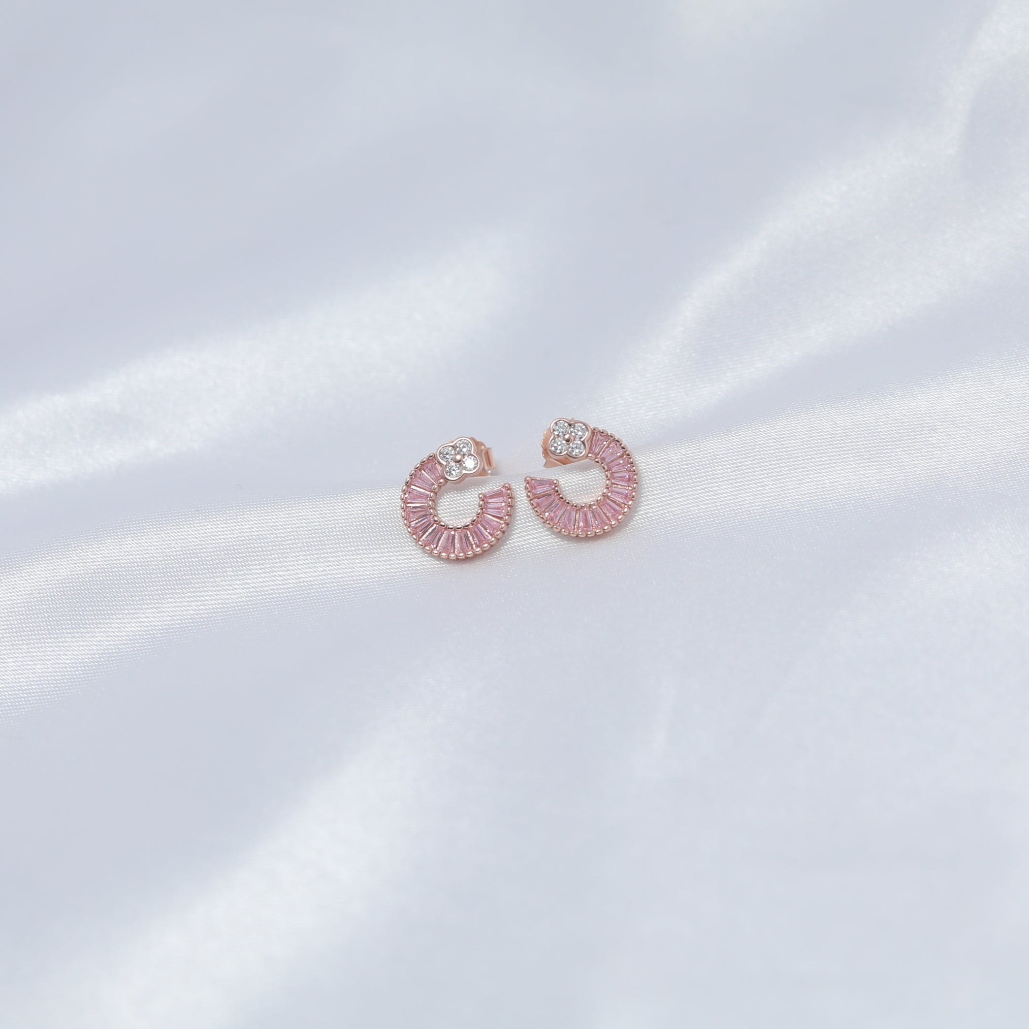 Rosé Raga, your new go-to pair of studs that strike the perfect harmony between tradition and trend. Drenched in soft rose gold tones and accented with radiant pink baguette stones, these semi-circle studs are finished with a dazzling crystal floral top—adding just the right amount of sparkle to your every move.
