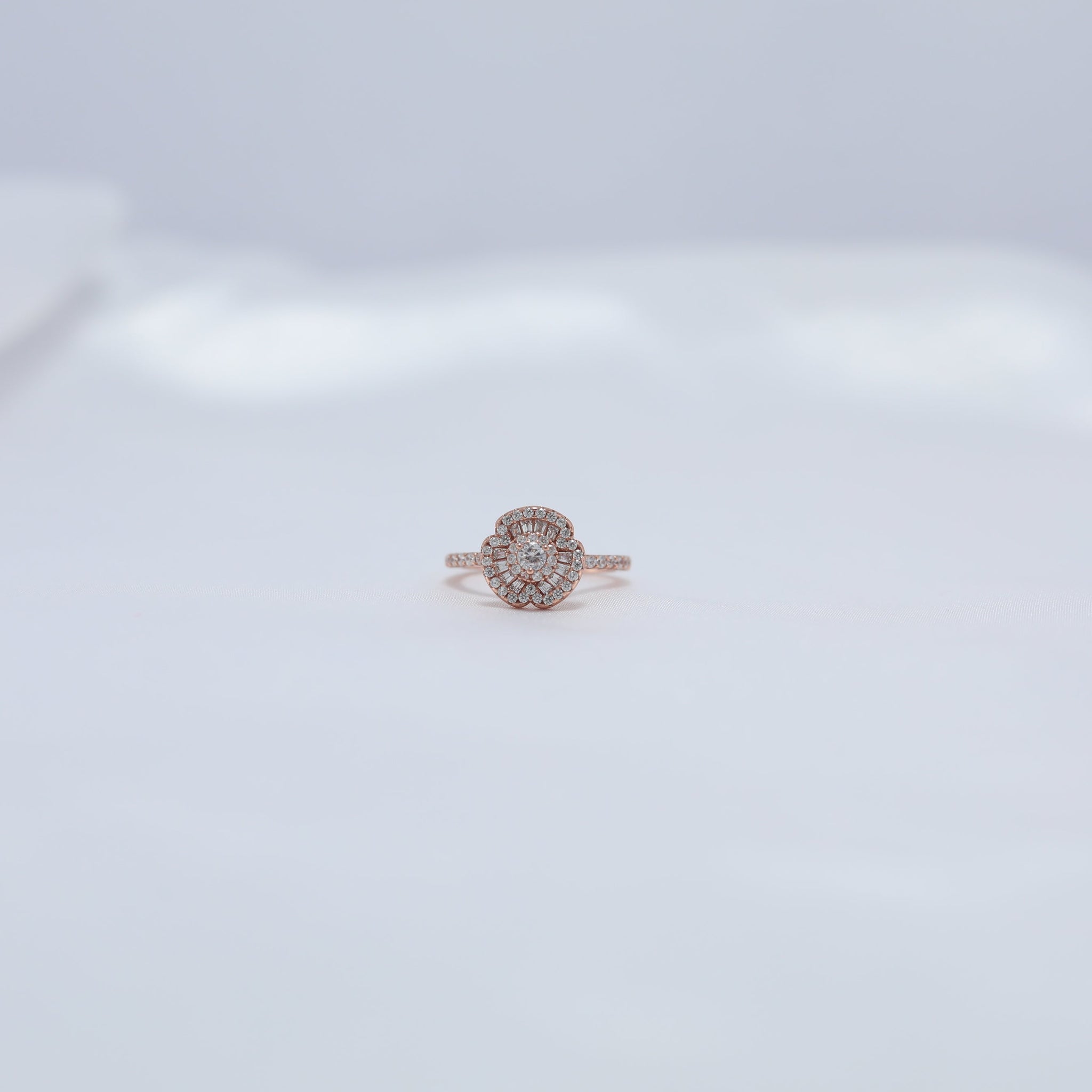 This captivating ring radiates elegance and timeless beauty. Its centerpiece features a stunning cluster of meticulously arranged sparkling stones, forming a dazzling floral-inspired design. Crafted in a luxurious rose gold finish, the band is delicately adorned with smaller stones, creating a harmonious blend of charm and sophistication.