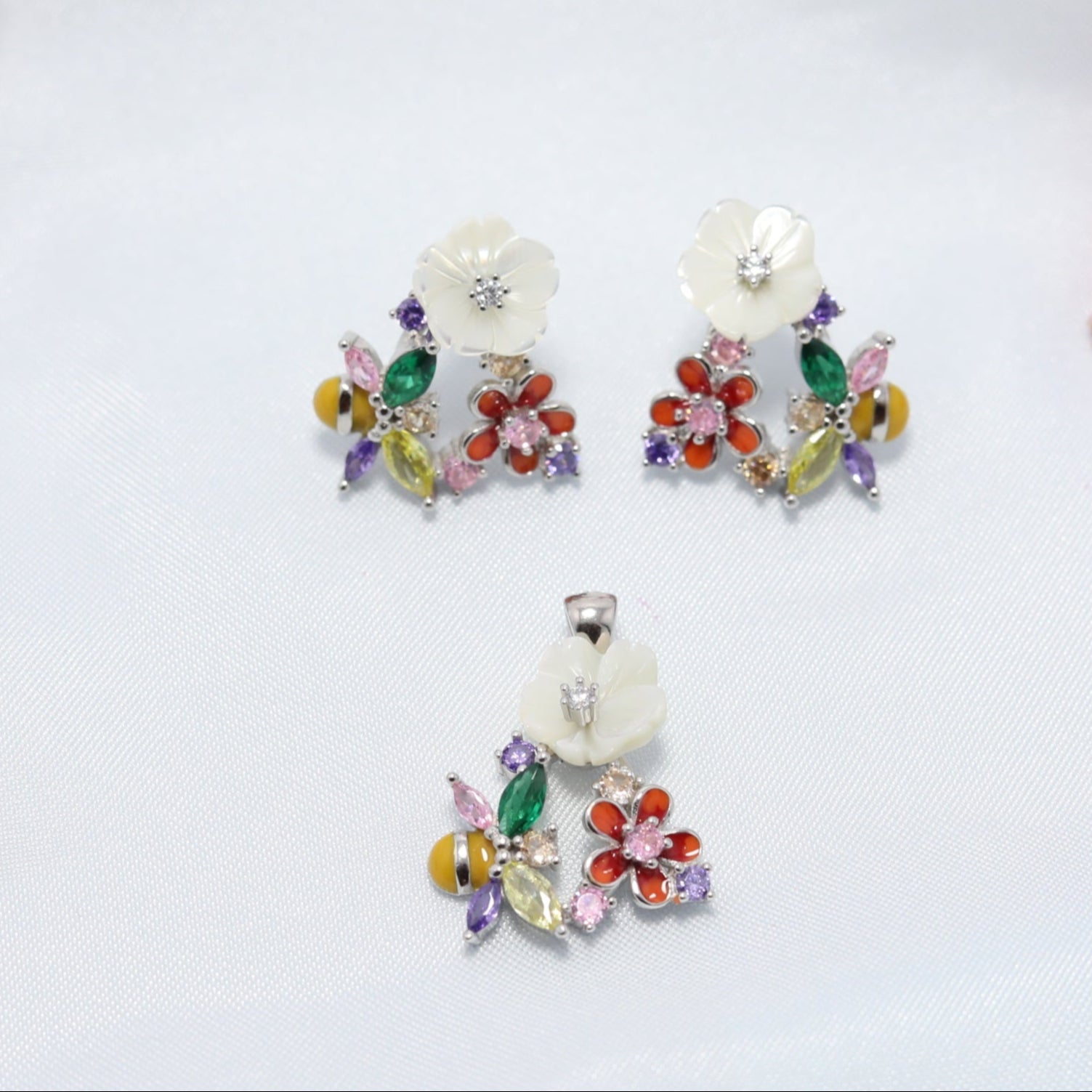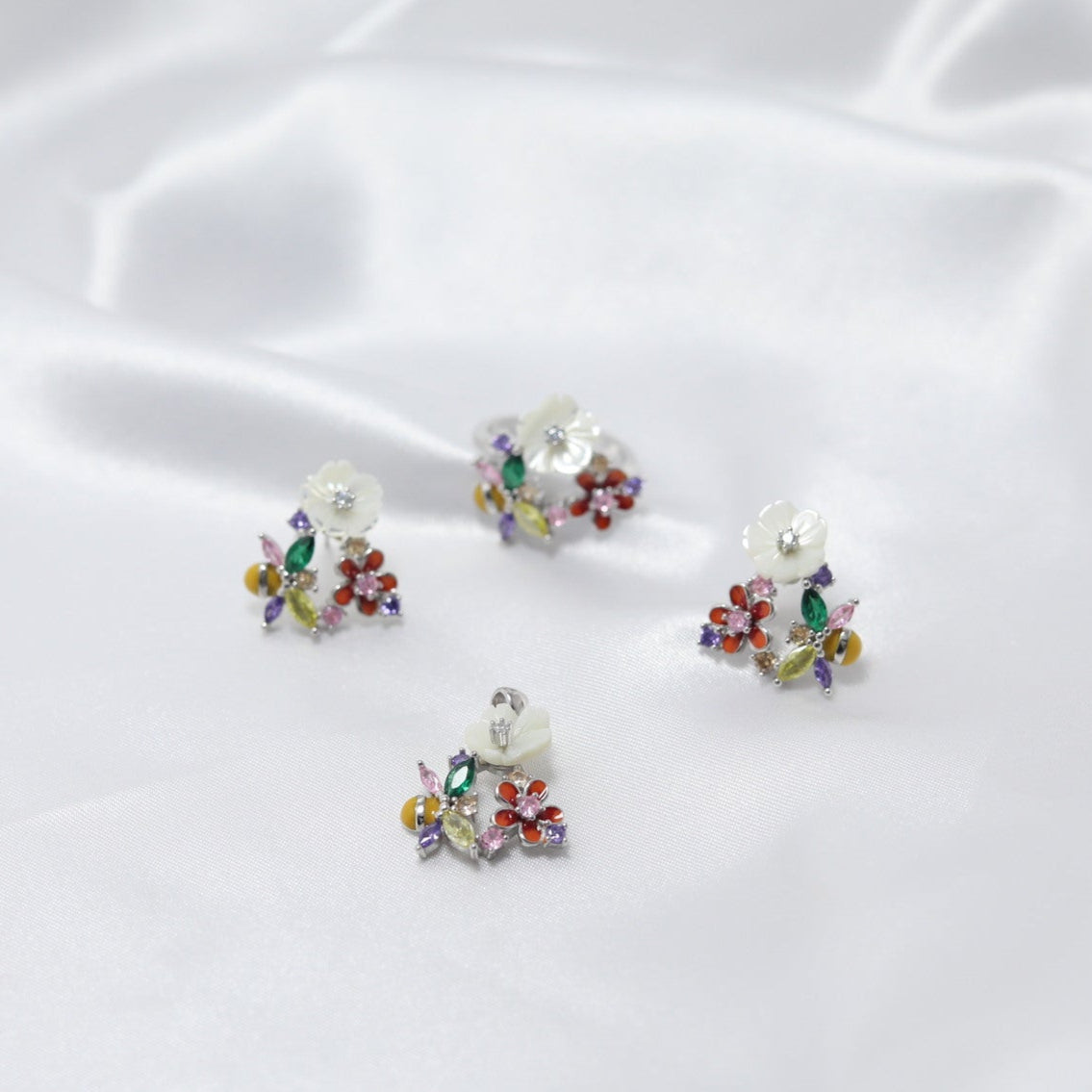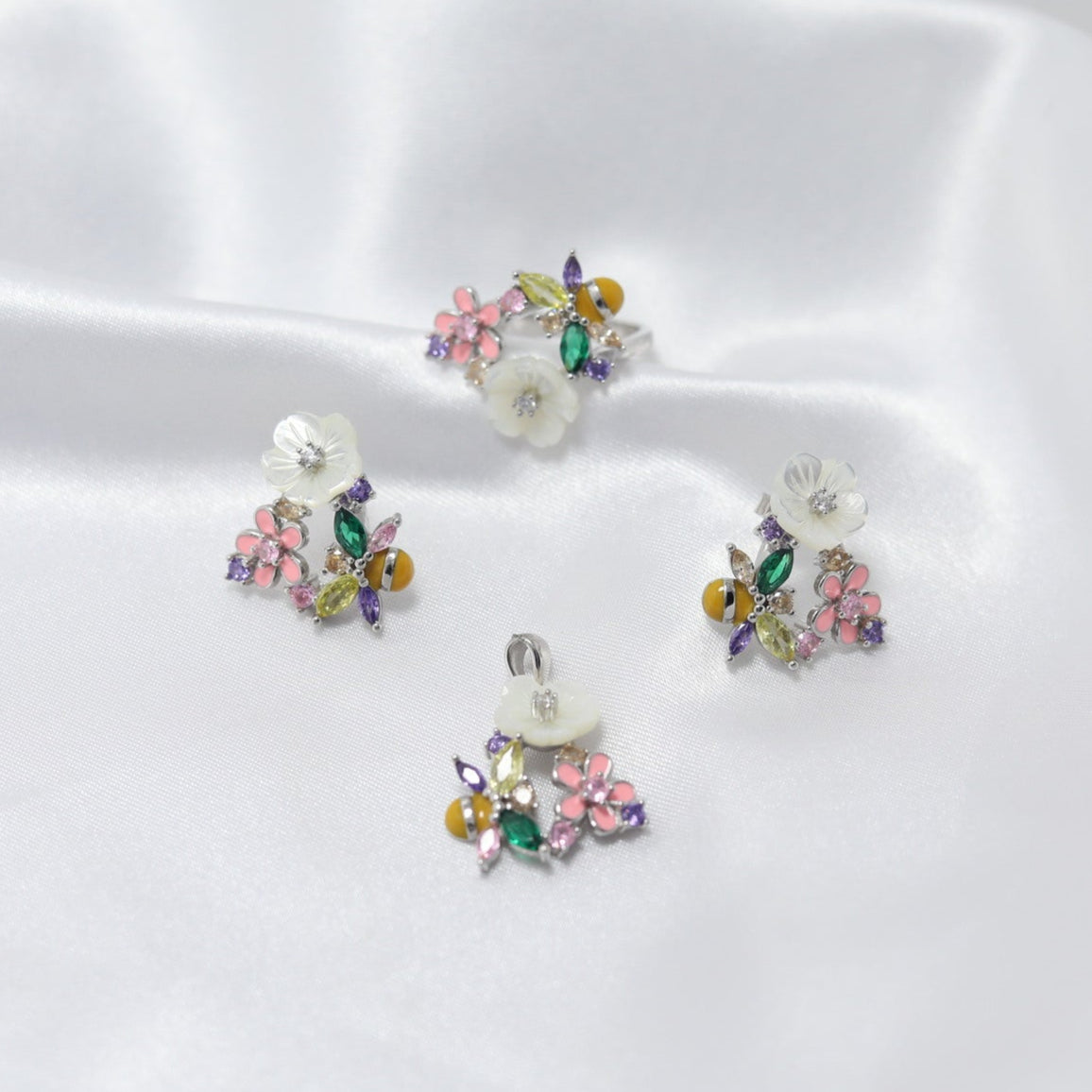 This whimsical set of earrings, pendant, and ring is a vivid celebration of nature. Handcrafted in 925 silver, each piece features intricate floral motifs, vibrant enamel work, and playful bursts of color. Look closely and you’ll even spot a tiny bumblebee buzzing amidst the bloom — because no garden is complete without its charm.