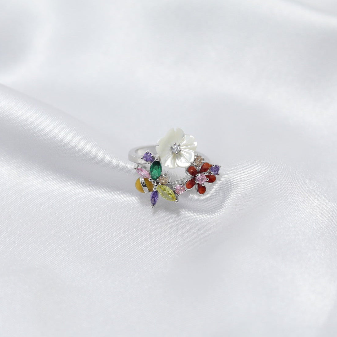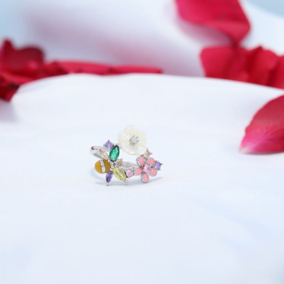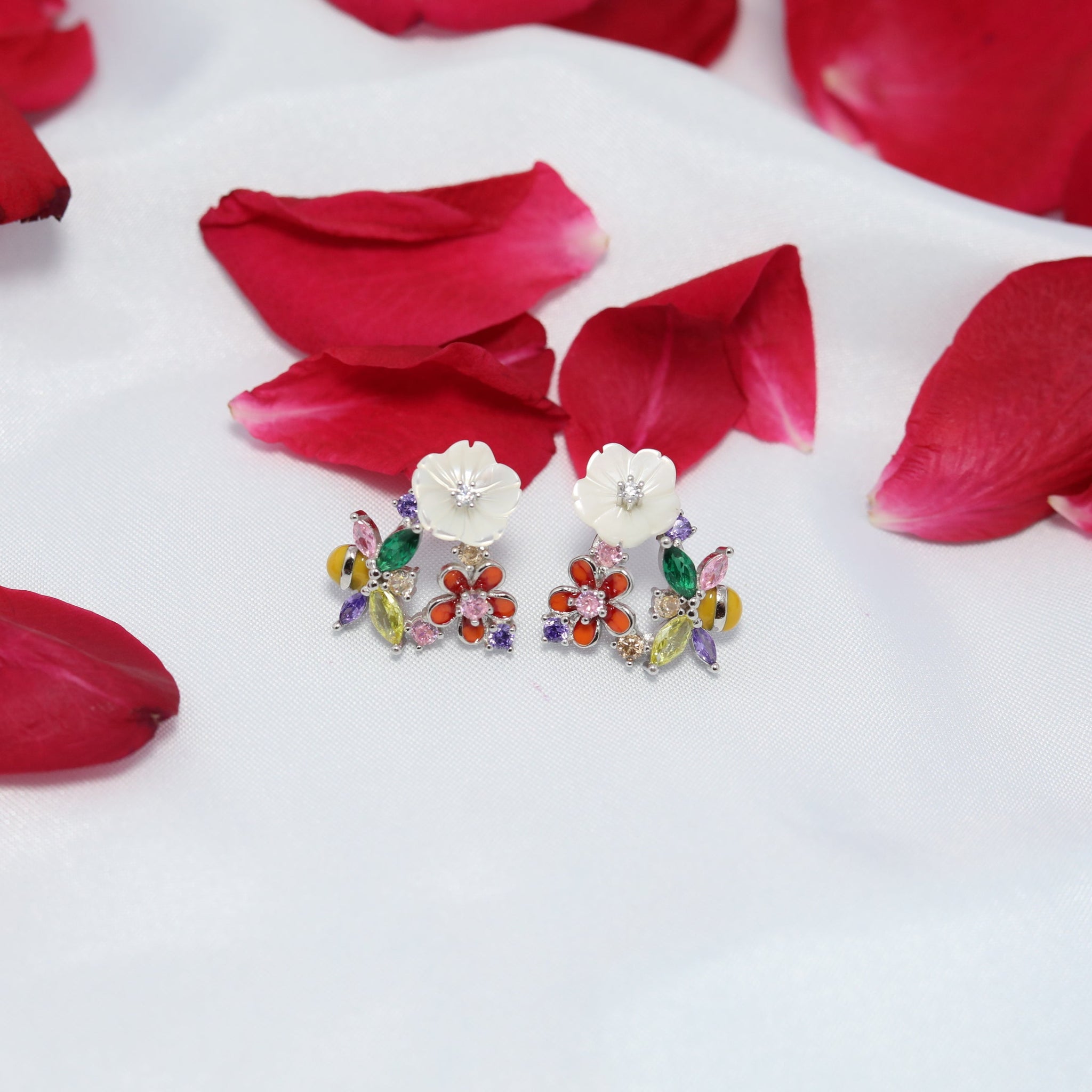 This whimsical set of earrings, pendant, and ring is a vivid celebration of nature. Handcrafted in 925 silver, each piece features intricate floral motifs, vibrant enamel work, and playful bursts of color. Look closely and you’ll even spot a tiny bumblebee buzzing amidst the bloom — because no garden is complete without its charm.