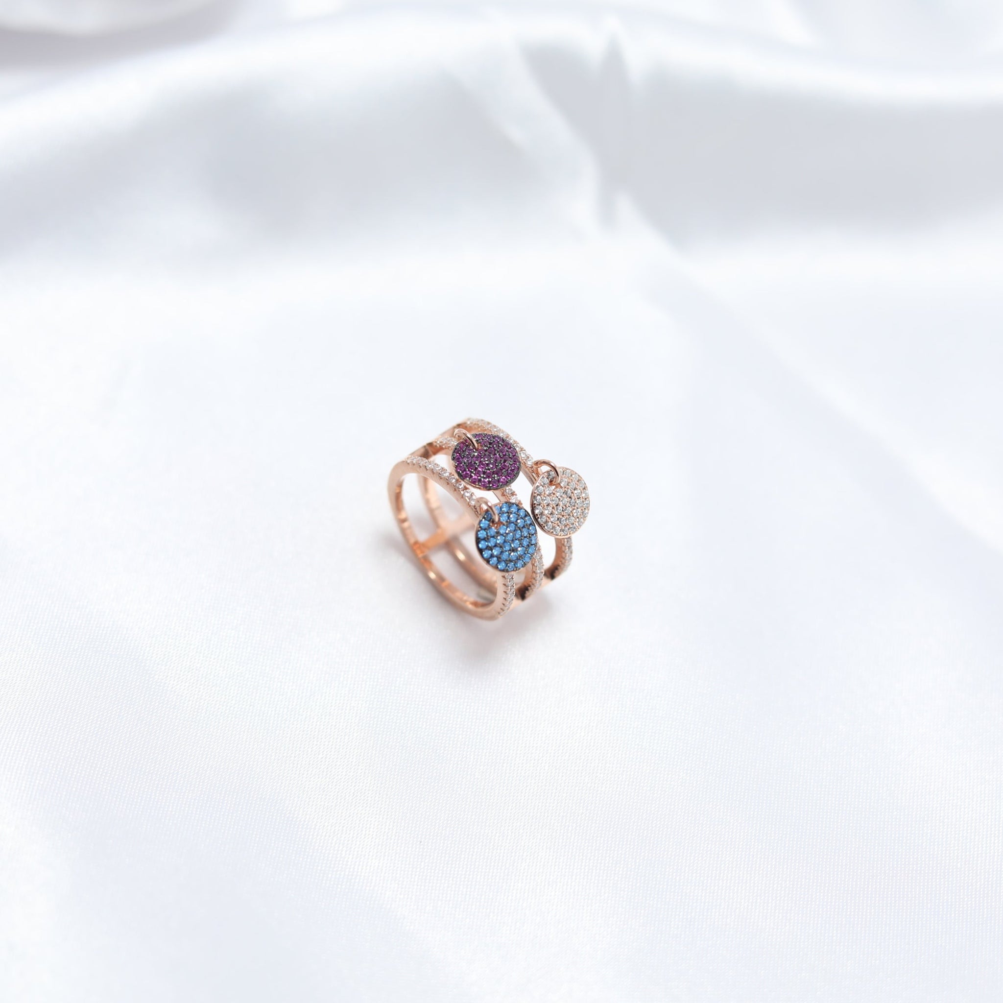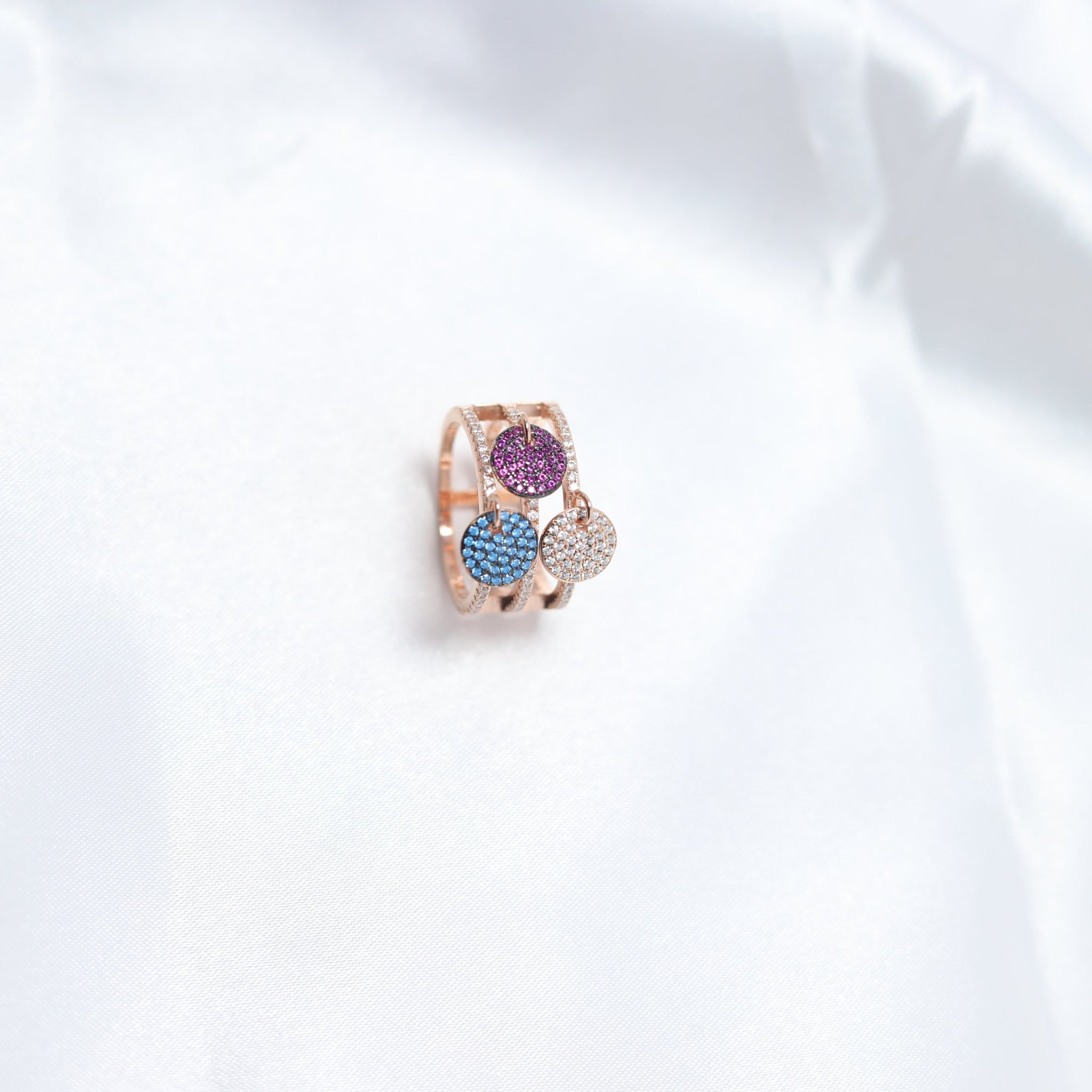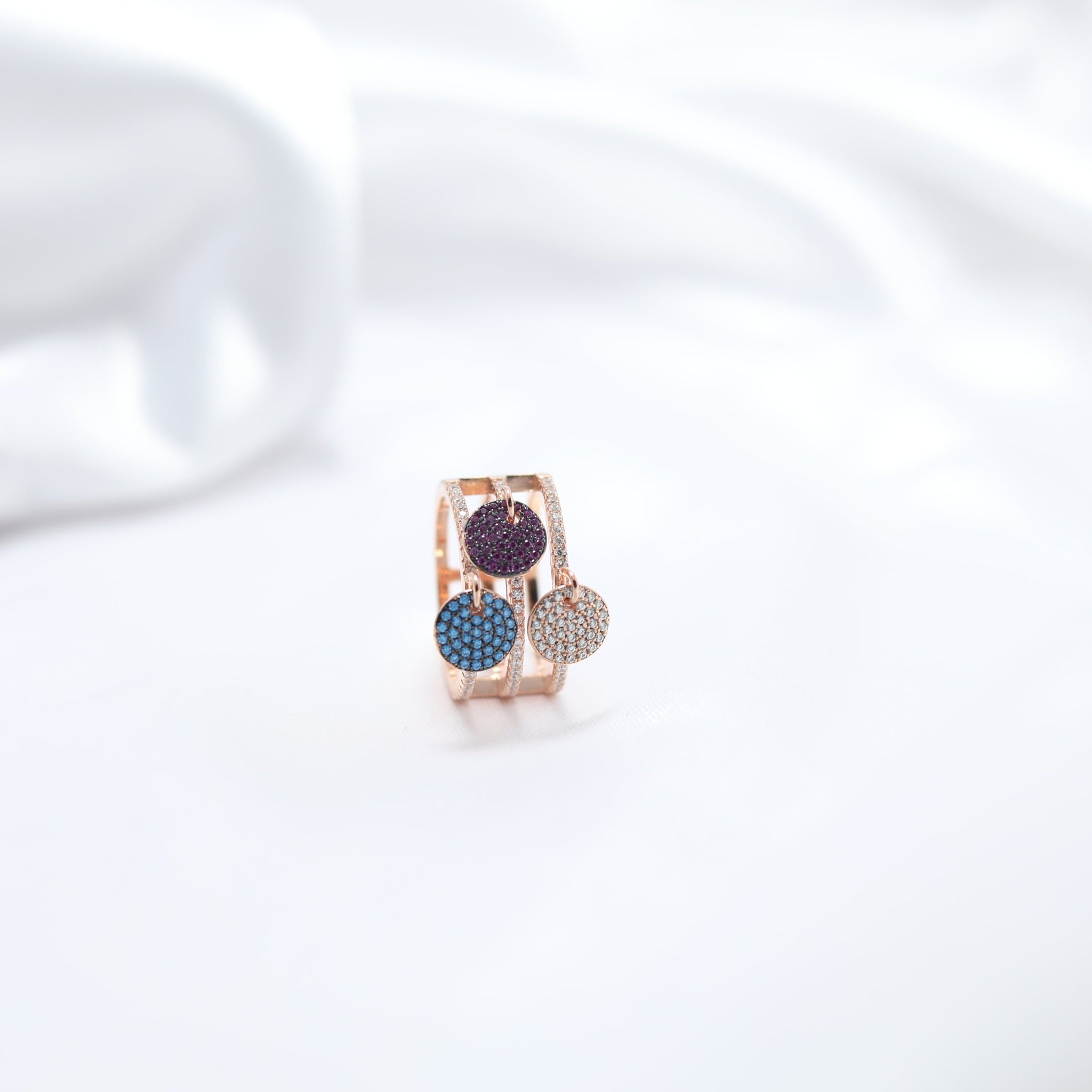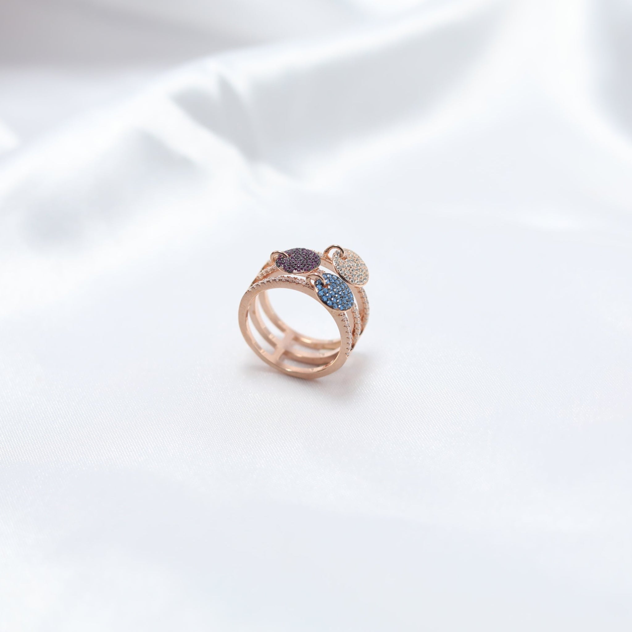 Inspired by the cosmic dance of the stars, the Celestial Ring is a symbol of balance, elegance, and timeless beauty. Crafted in 925 sterling silver with a luxurious rose gold finish, this exquisite piece features a captivating trio of pave-set spheres in deep blue, radiant white, and rich plum, each representing harmony, strength, and grace.