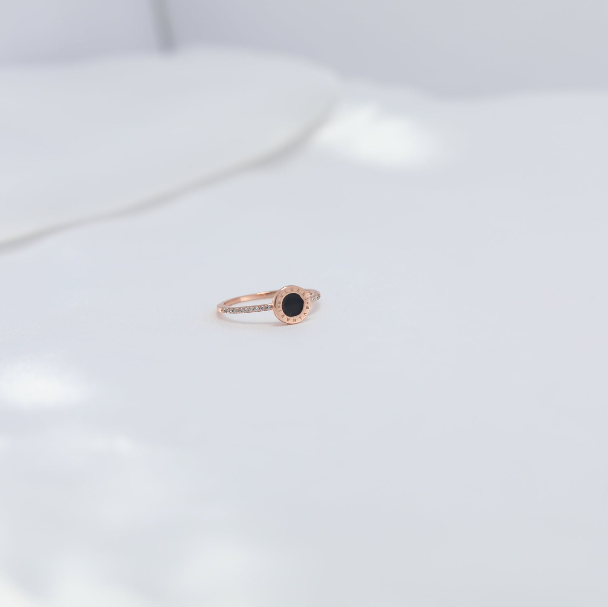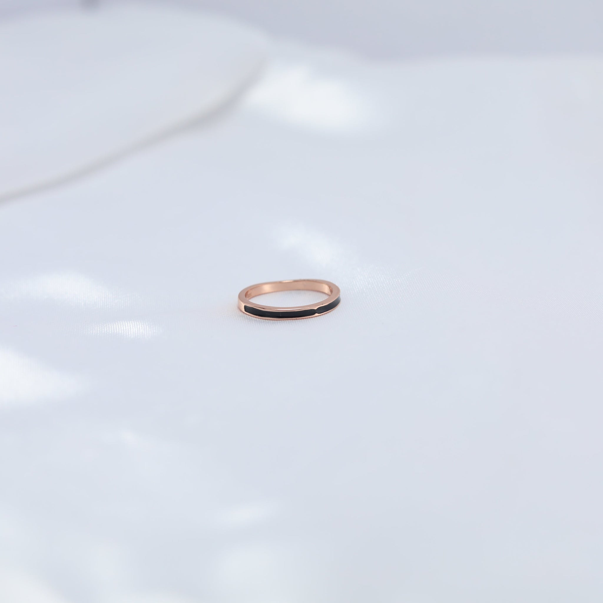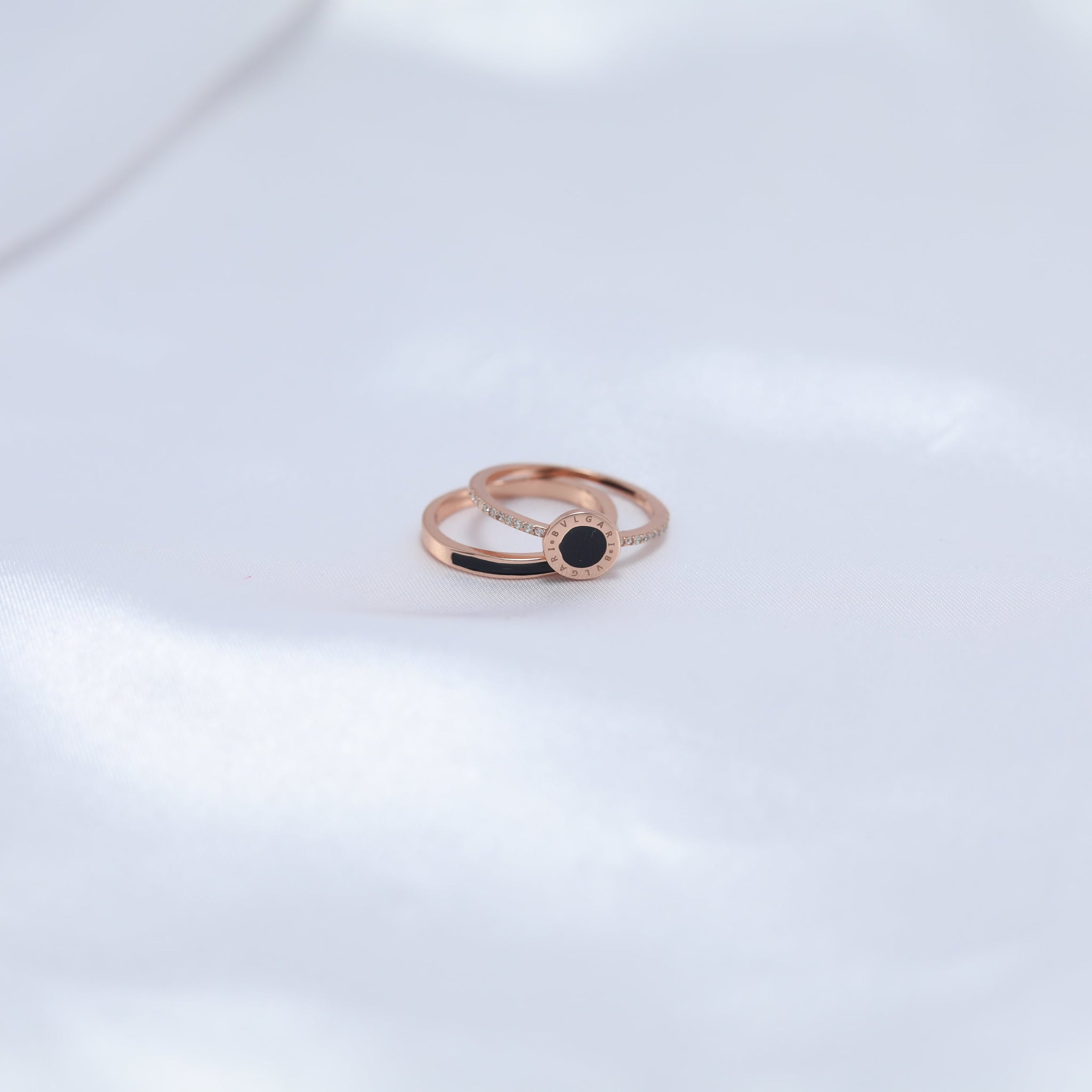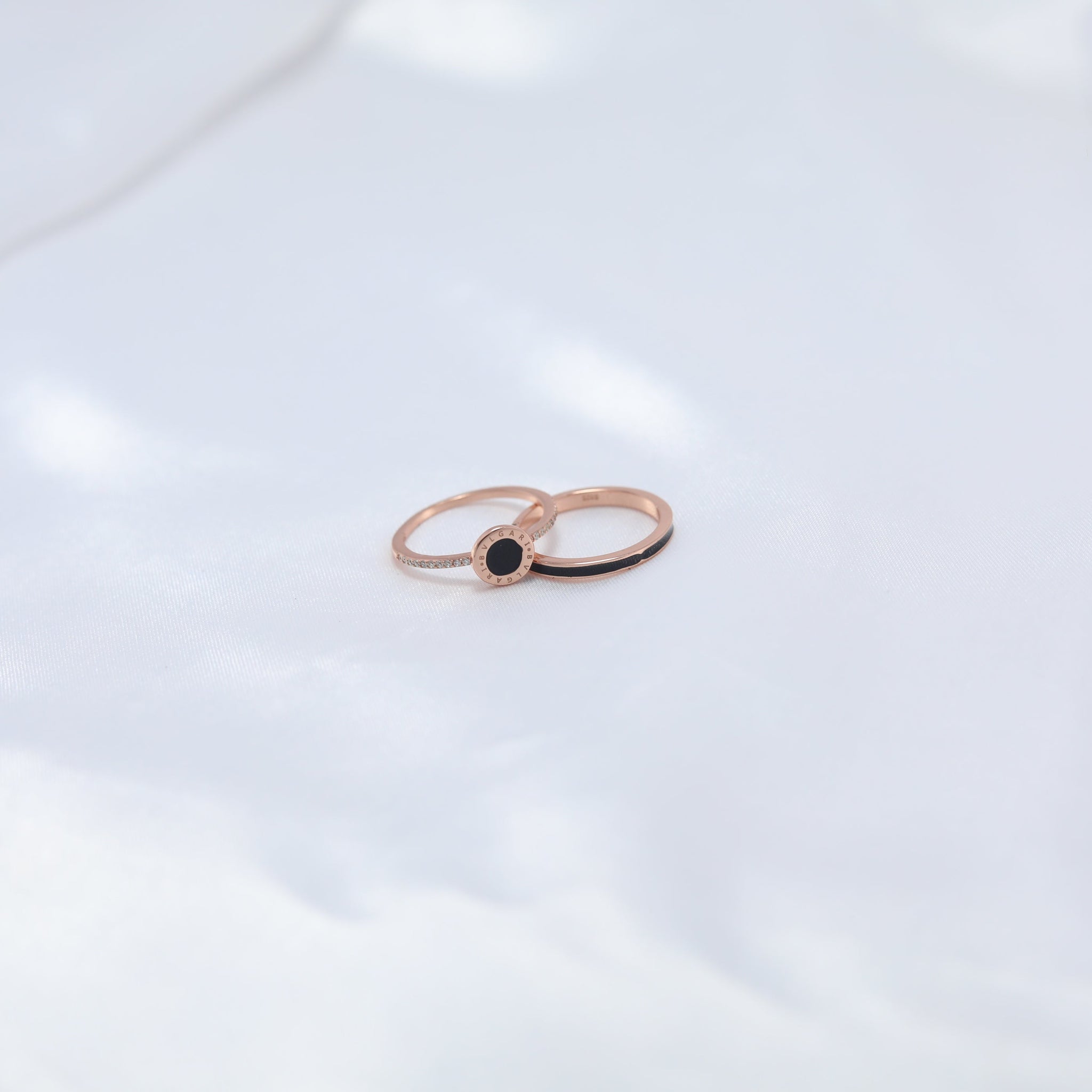 The Eclipse Ring Set is a harmonious blend of modern design and timeless elegance. This duo set features two rings: one with a captivating black enamel centerpiece surrounded by a delicate halo of sparkle, and the other a sleek, minimalist band. The rose-gold finish enhances the bold contrast of the black stone, making it an effortlessly stylish accessory for every occasion.