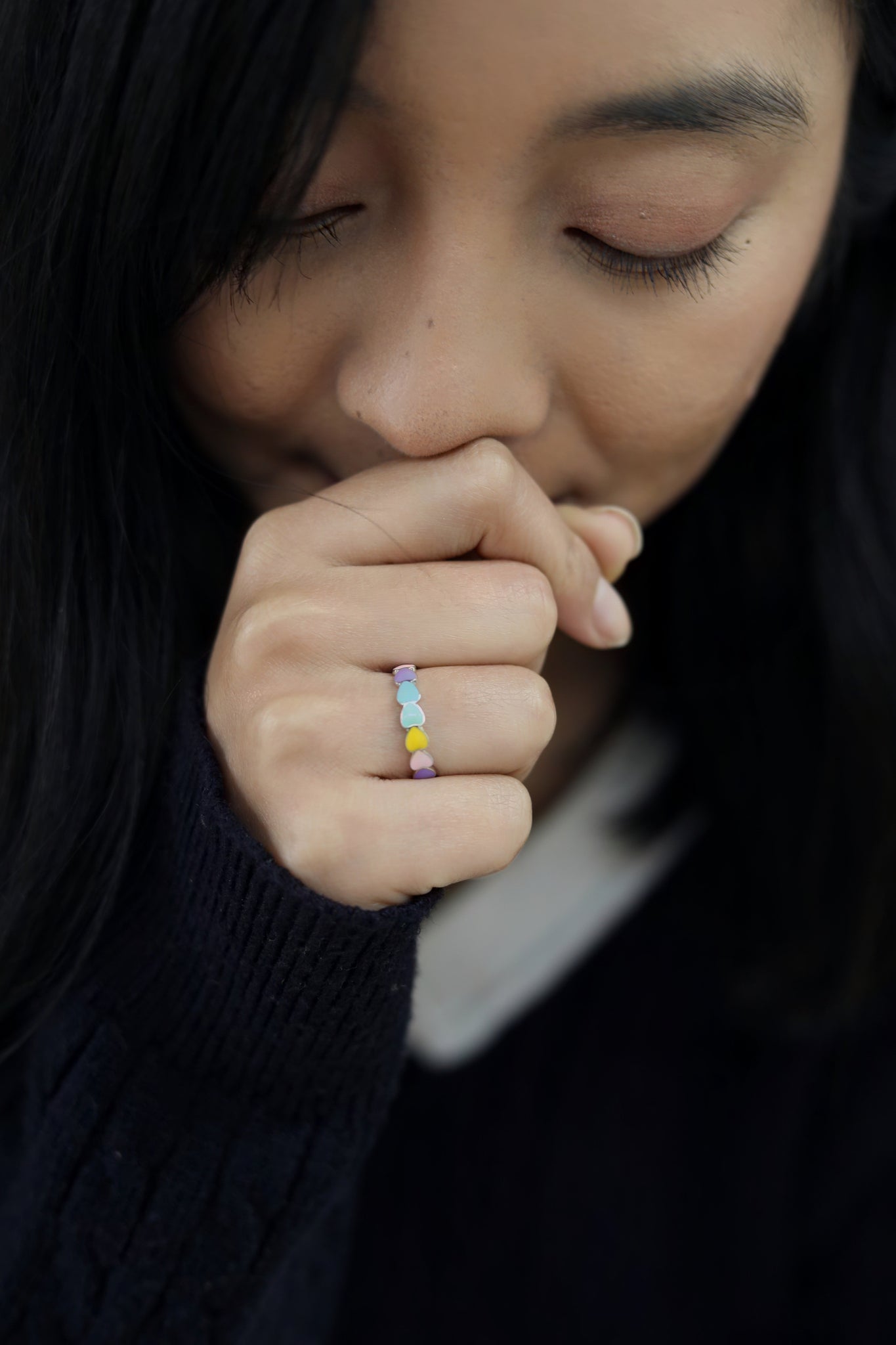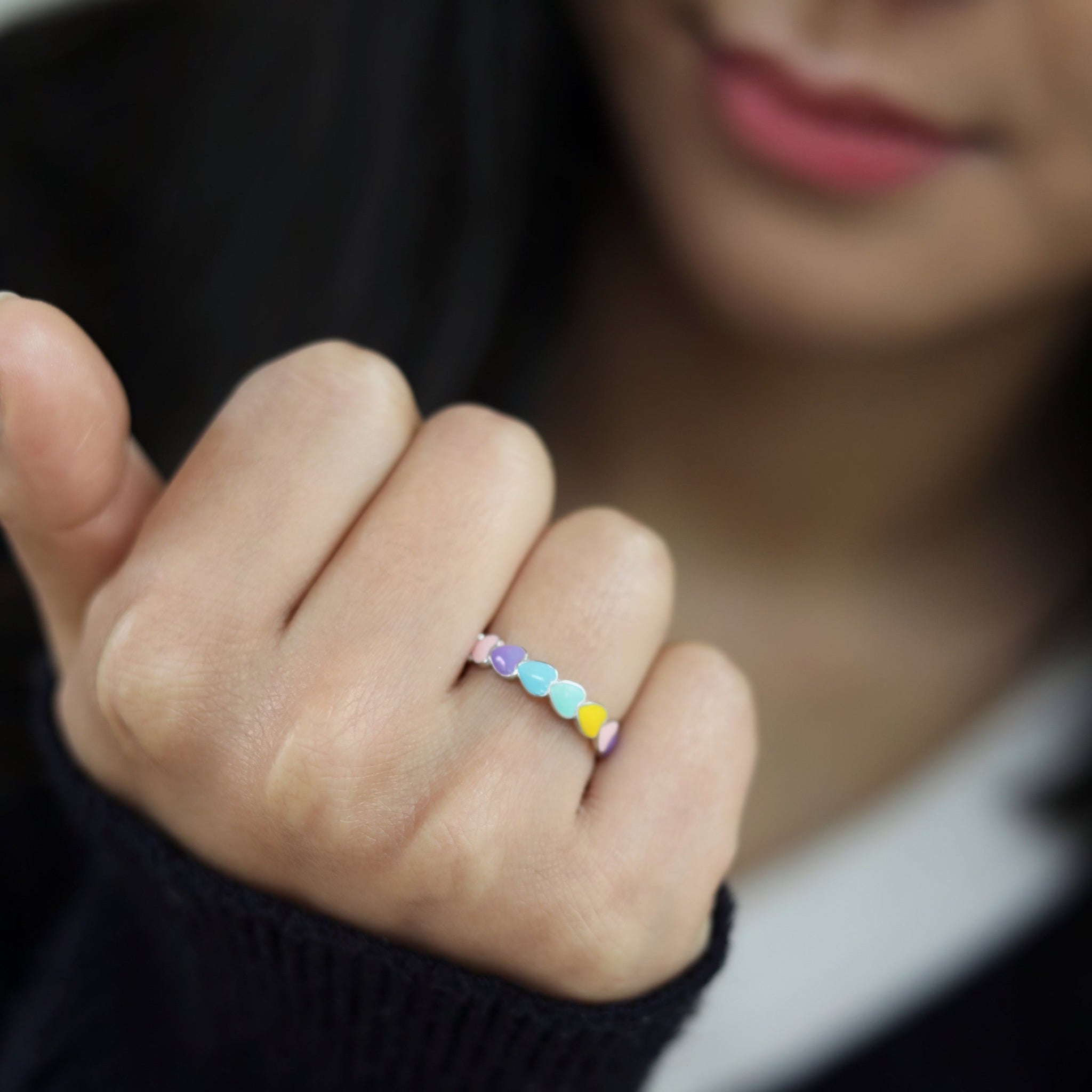Add a pop of color and charm to your jewelry collection with our Pastel Heart Stacking Ring! This adorable ring features a delicate row of tiny enamel hearts in soft, dreamy hues—lavender, blue, pink, and yellow—set on a sleek, dainty band.