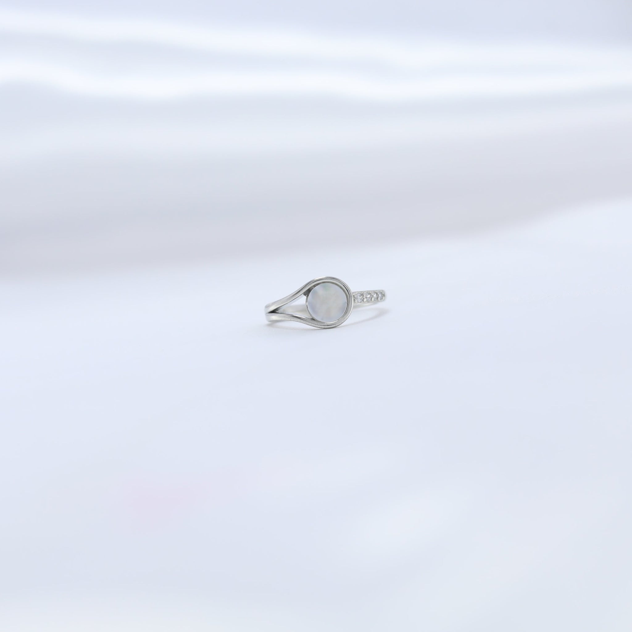 Elegance meets nature in the Lunar Teardrop Ring. Crafted in sterling silver, this ring features a luminous mother-of-pearl teardrop centerpiece, evoking the soft glow of the moon. Its minimalist design is accentuated with a delicate band adorned with sparkling stones, adding a touch of sophistication to any outfit.