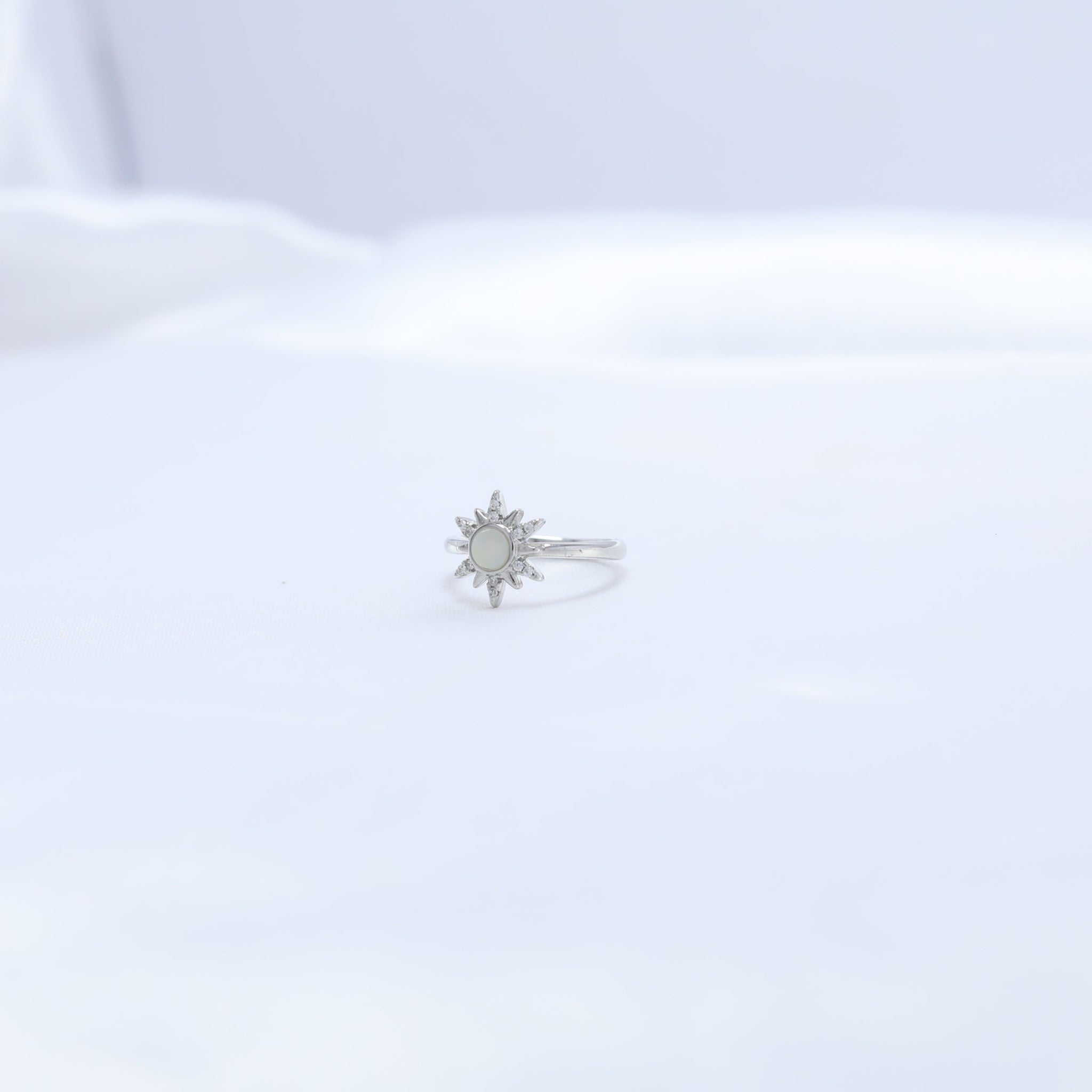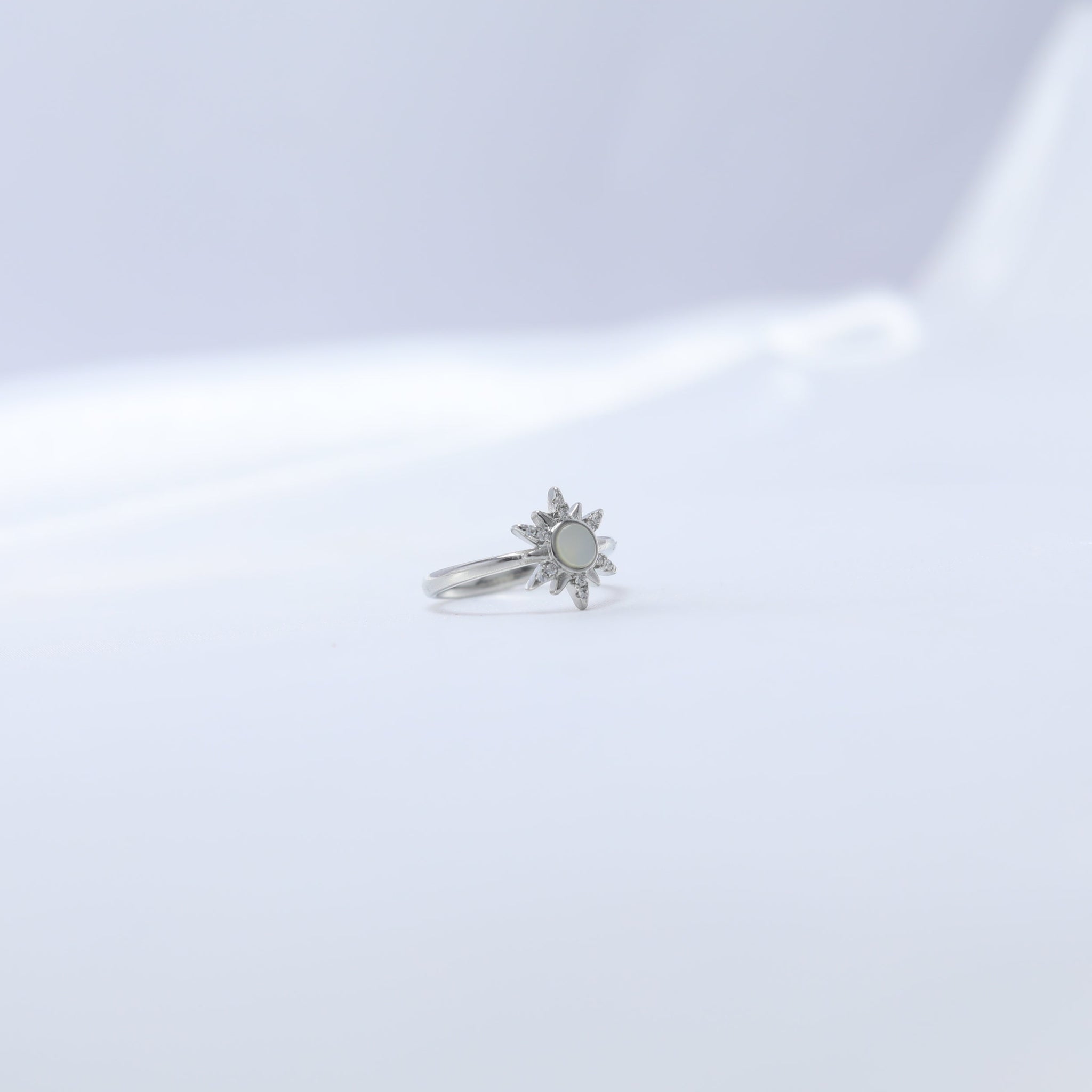 Radiate elegance with the Chandrika Ring, a perfect embodiment of celestial beauty. Inspired by the serene glow of moonlight, this exquisite ring features a mother-of-pearl inlay at its center, surrounded by a dazzling starburst design. Crafted in premium 925 sterling silver, the Chandrika Ring captures the essence of timeless sophistication and divine charm.