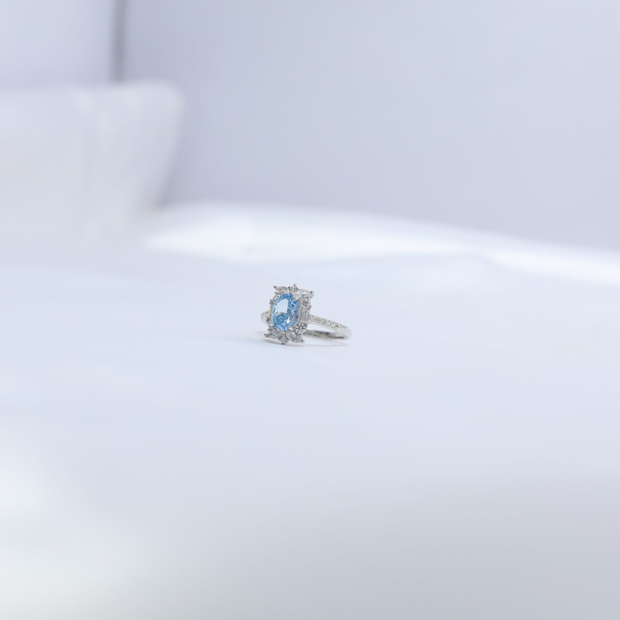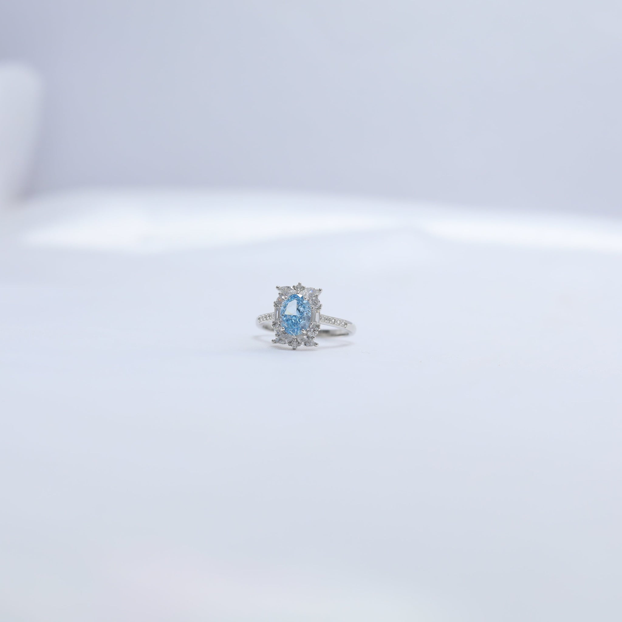 Centerpiece: Oval-shaped Blue Ice cut stone, radiating warm elegance