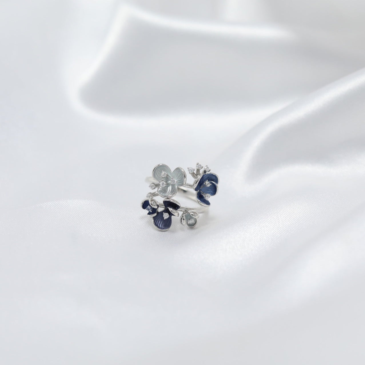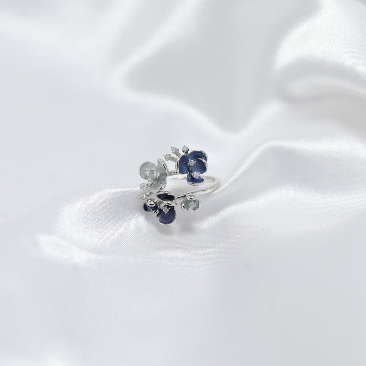 Step into a world of midnight florals with the Eclipse Garden ring. Handcrafted in 92.5 sterling silver, this enchanting piece features deep navy enamel petals and soft icy blue accents, delicately arranged like a secret garden under moonlight. The asymmetrical floral design brings an organic elegance, while the highly polished silver band adds a modern touch.