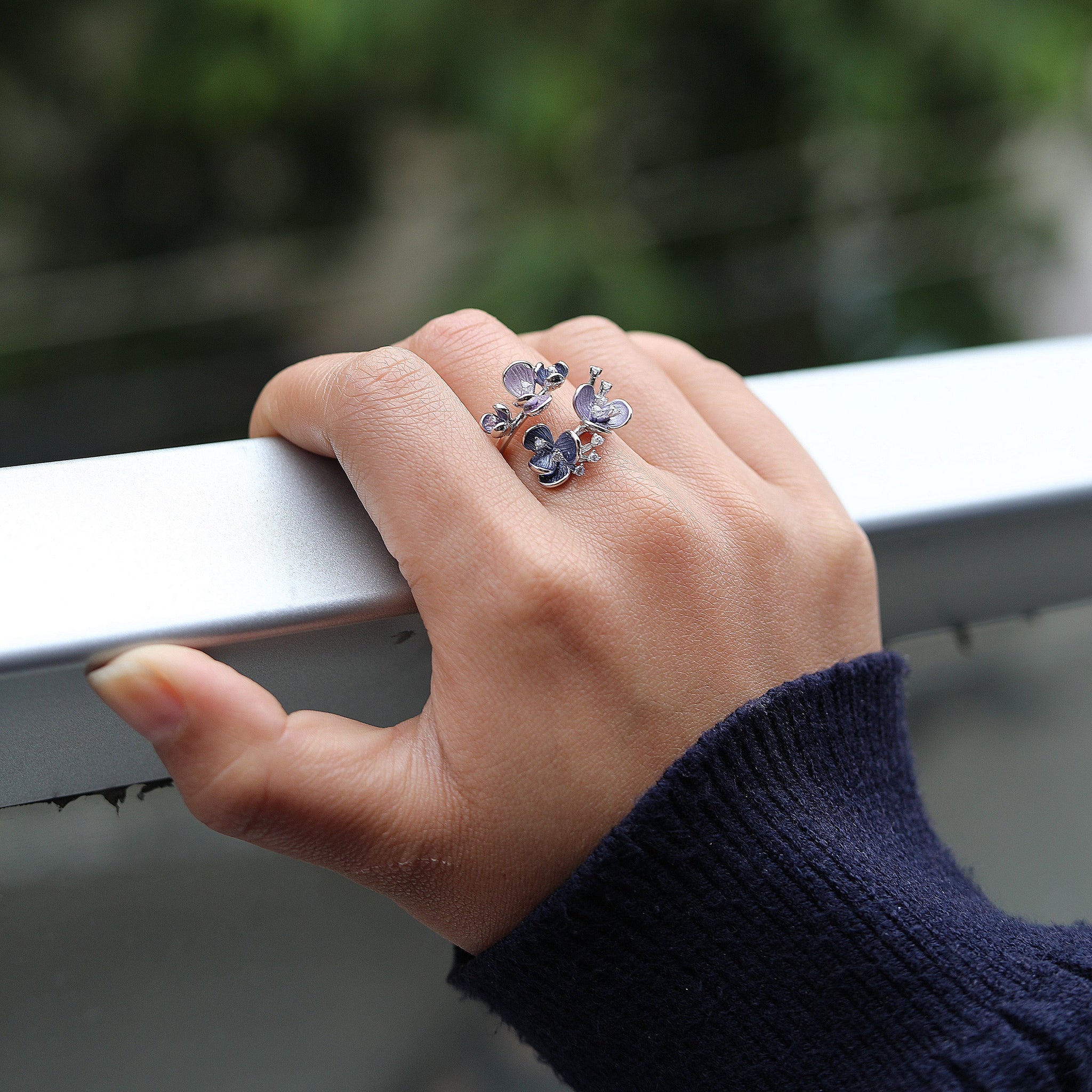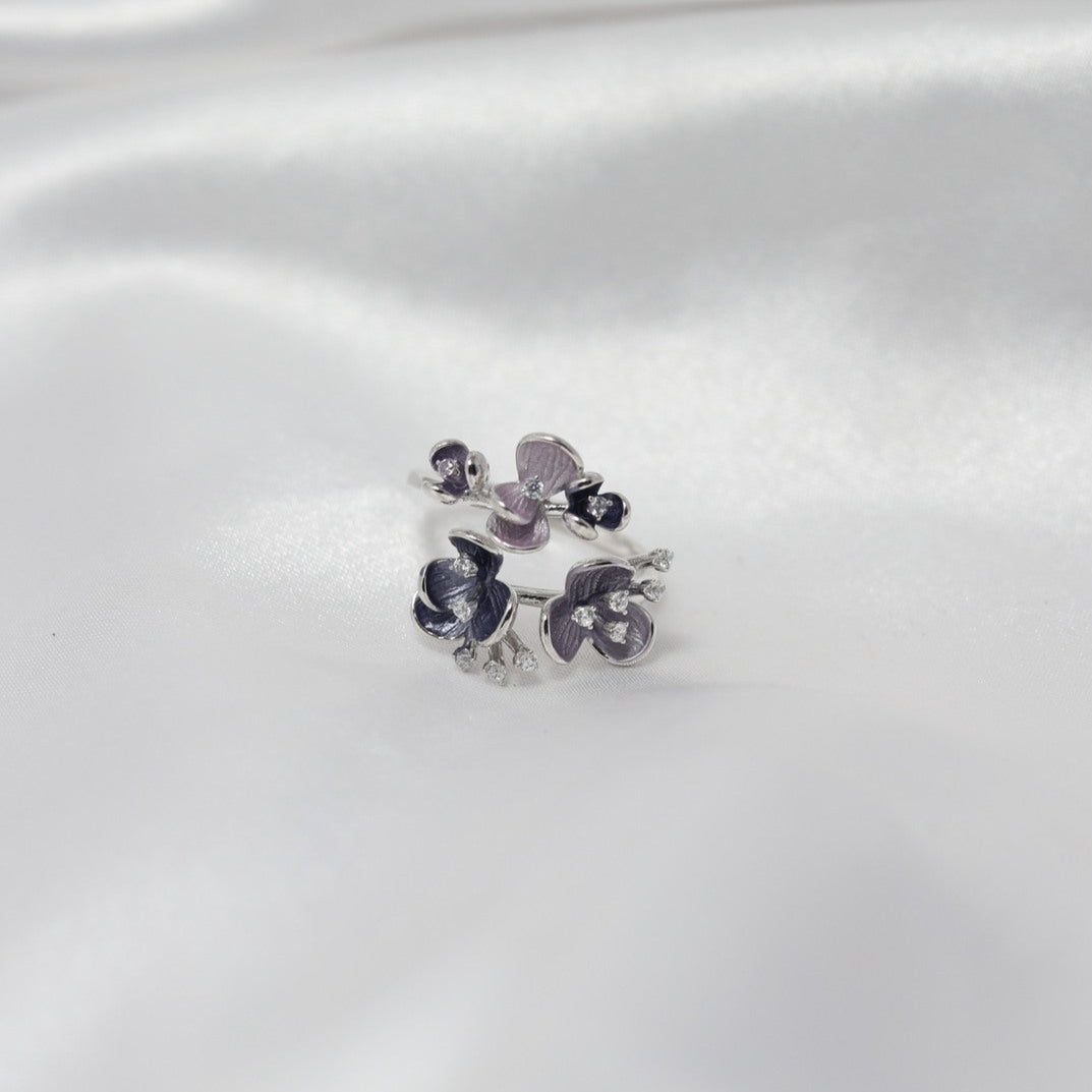 Inspired by the enchanting beauty of twilight, the Midnight Bloom Adjustable Ring is a stunning statement of grace and sophistication. Designed with delicate floral motifs in mesmerizing shades of deep blue and lavender, this open-ended ring evokes the mystery and allure of a moonlit garden.