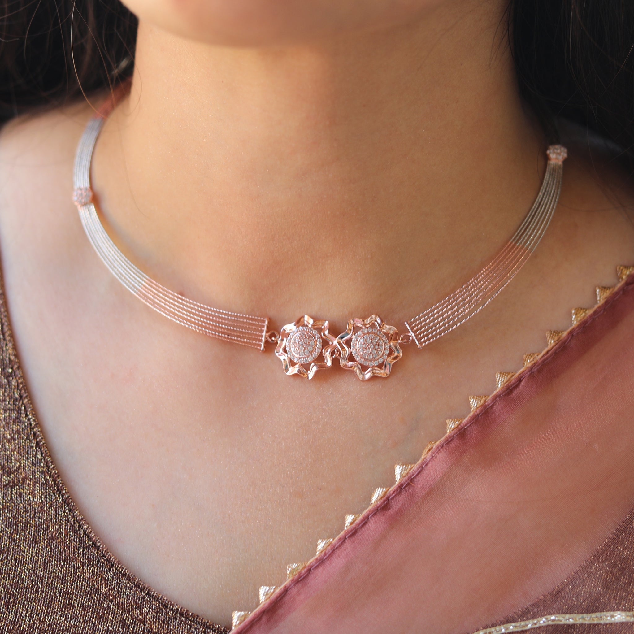Intricately designed to reflect timeless sophistication, the Ziva Choker is a masterpiece that seamlessly blends heritage with contemporary finesse. Crafted with fine sterling silver and adorned with dual-tone silver and rose gold plating, this choker features a delicate multi-strand design that gracefully embraces the neck.