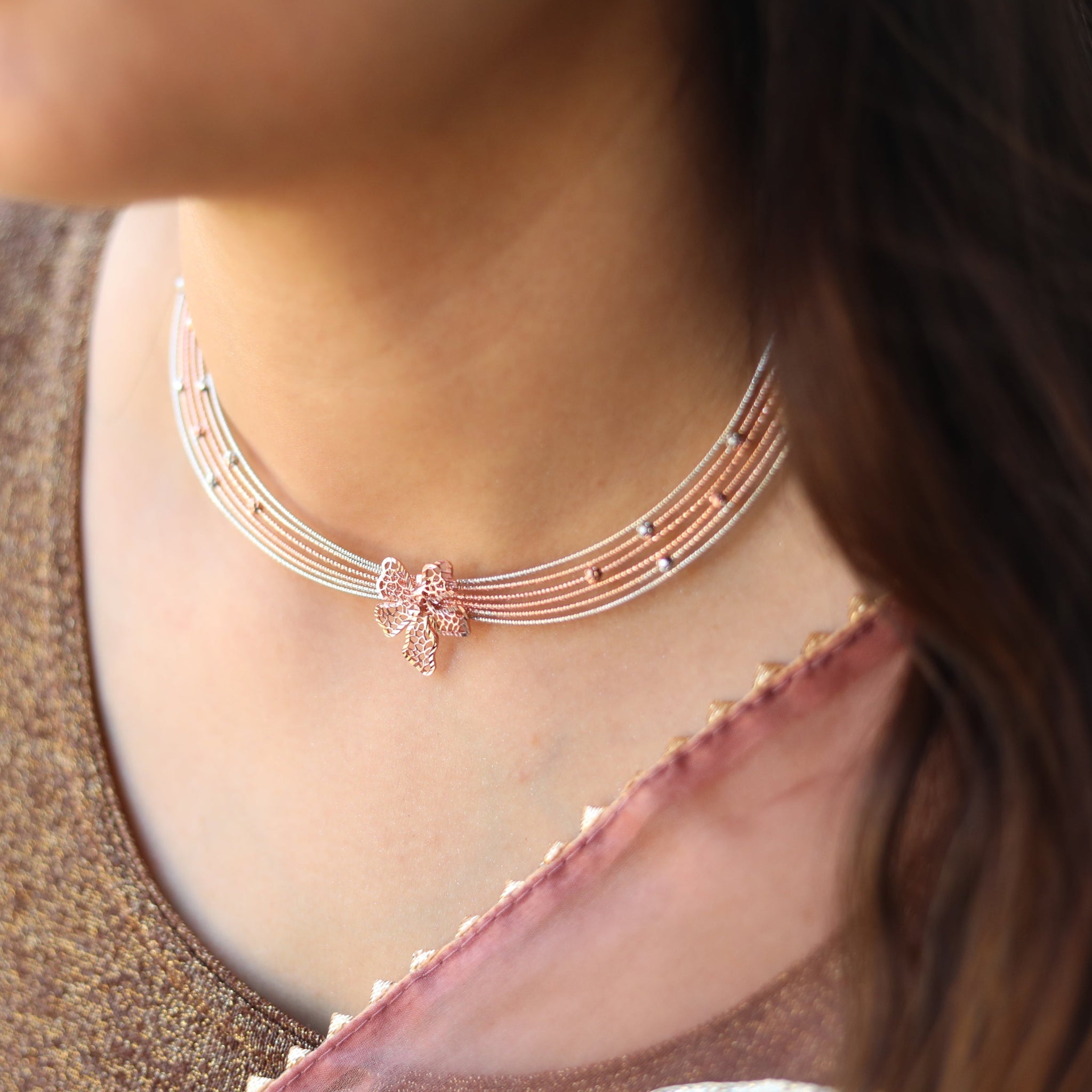 Exuding grace and refinement, the Aadhira Choker Set is designed for the modern woman who embraces tradition with a contemporary touch. This exquisite set features a multi-layered choker crafted with delicate silver and rose gold accents, adorned with dainty embellishments that add a hint of sparkle. At its heart lies a beautifully detailed floral motif, radiating femininity and charm.