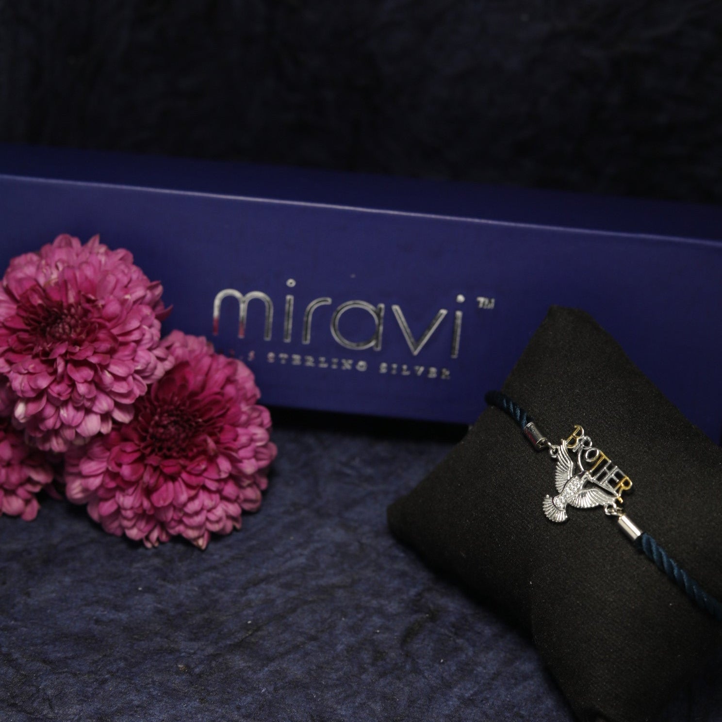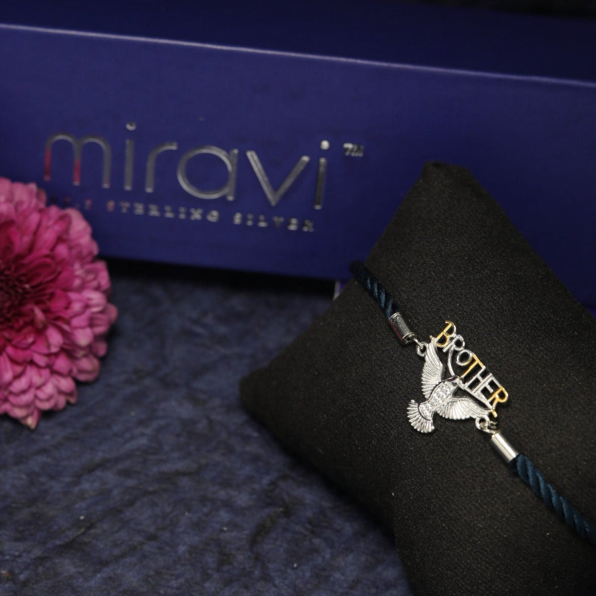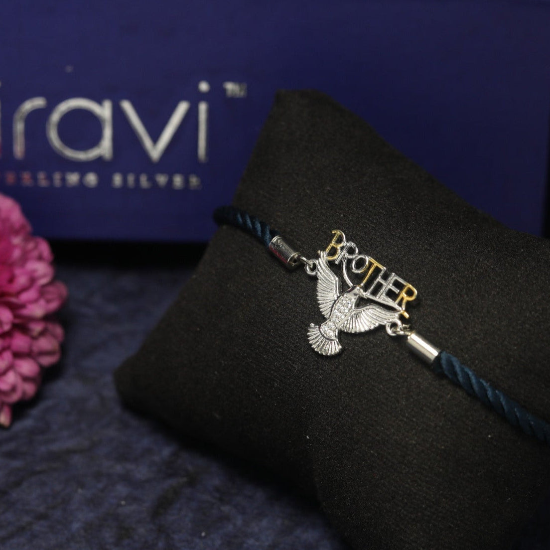 Celebrate your brother’s soaring spirit with the Aakash Rakhi. Adorned with a majestic eagle charm and “BROTHER” engraved in two-tone silver and gold, this rakhi speaks of protection, power, and pride. Tied with a deep navy thread, it’s a striking piece for your protector-in-chief.