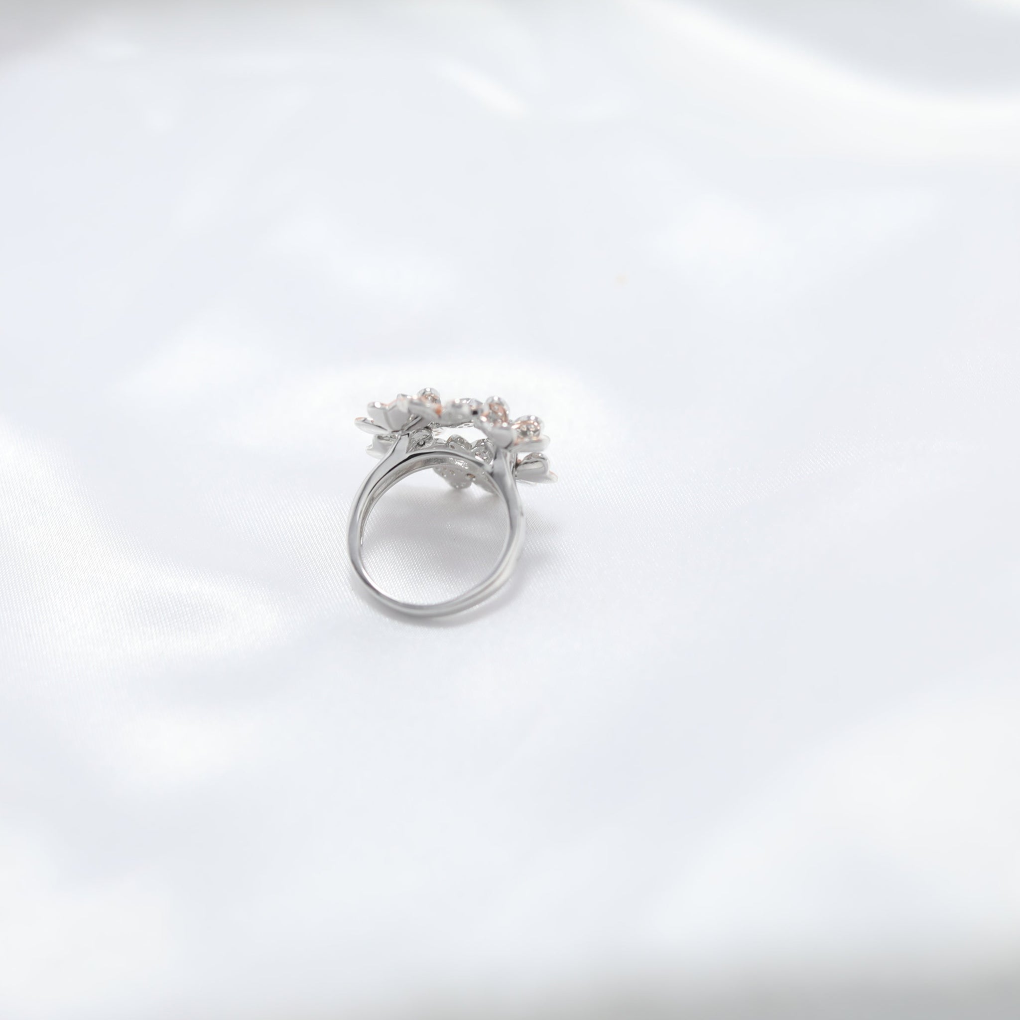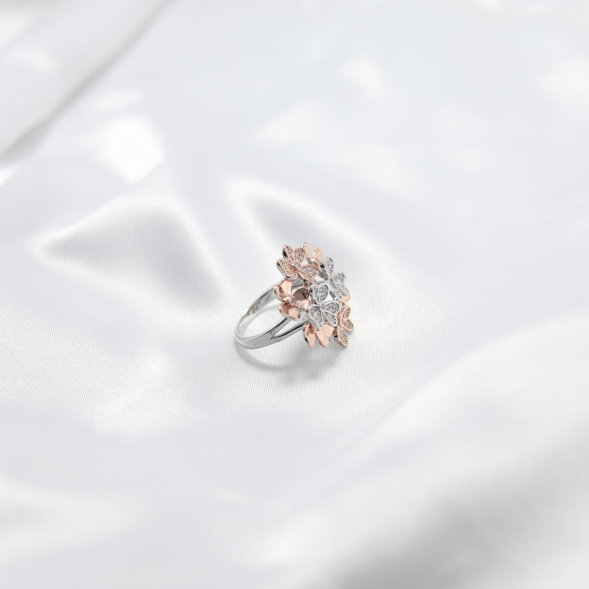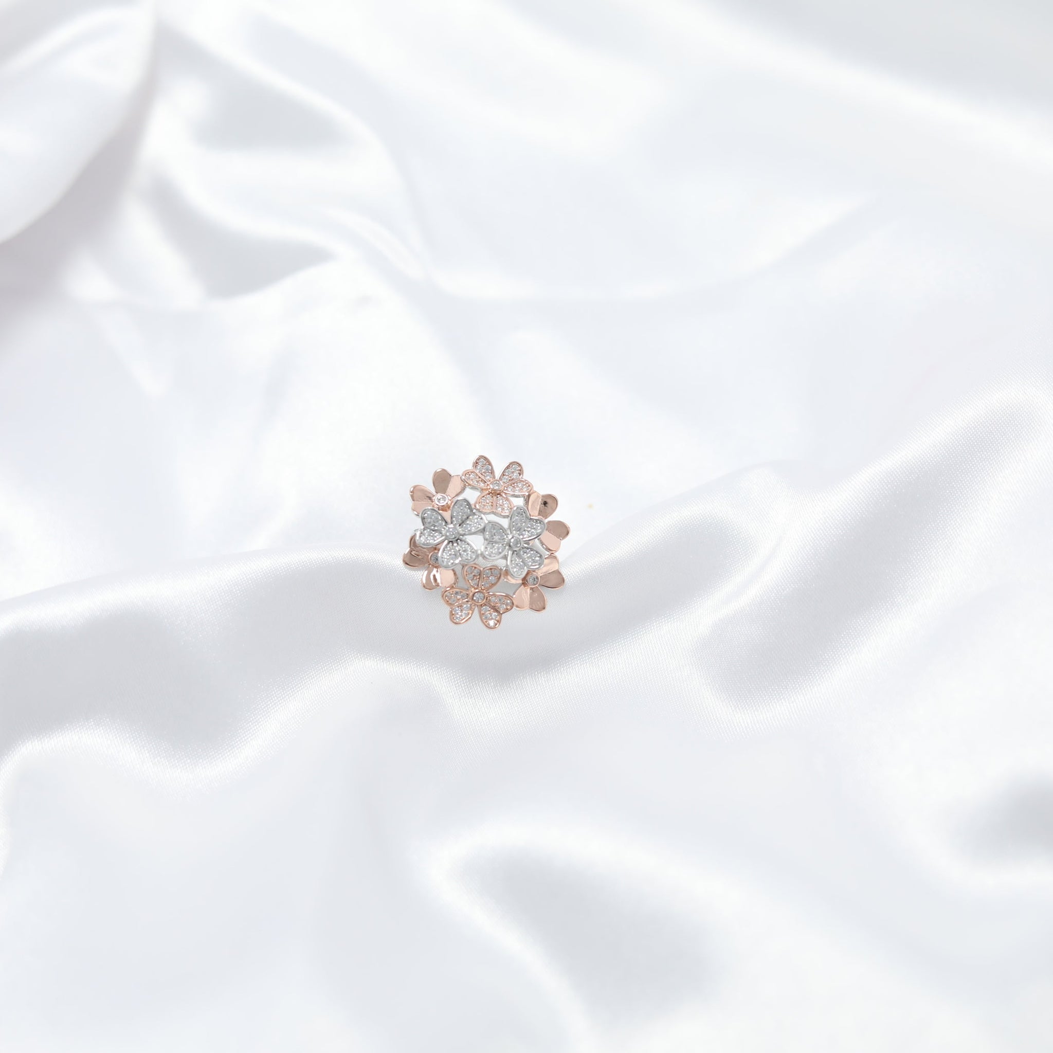 Inspired by the enchanting beauty of nature, the Aranya ring is a celebration of delicate floral elegance. This intricately crafted piece features dual-tone floral motifs—a mesmerizing blend of rose gold and silver, embodying grace and sophistication. The sparkling zircon-studded petals add a touch of brilliance, making it the perfect statement piece for any occasion.