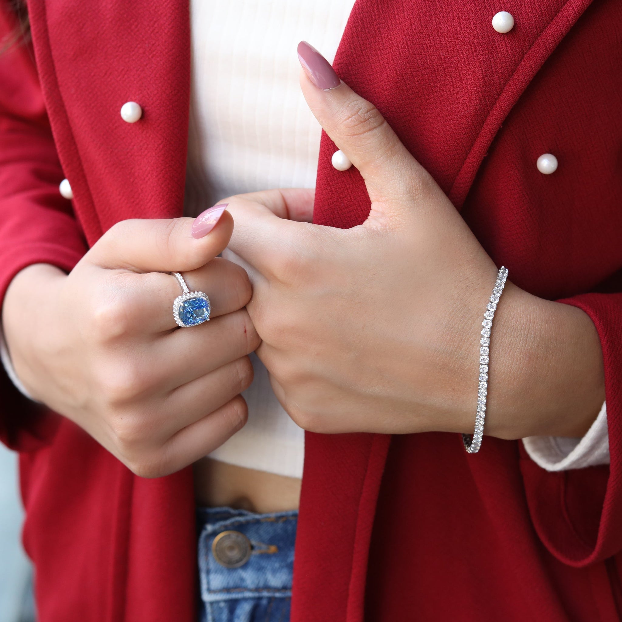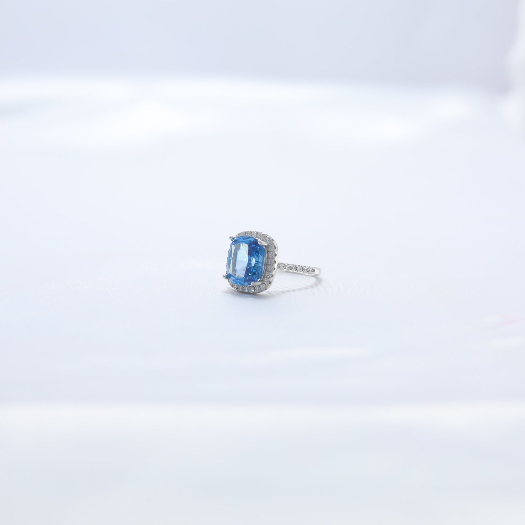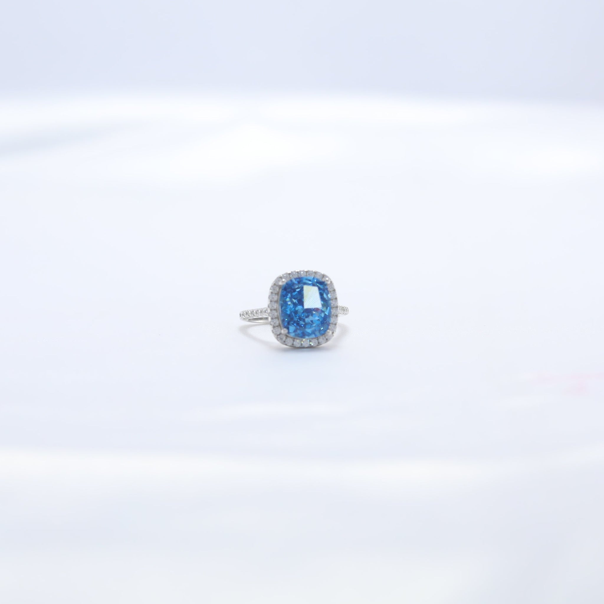 A timeless statement of elegance, the Aurora Blue Halo Ring is a masterpiece of sophistication and charm. Featuring a brilliant ice-cut blue gemstone, surrounded by a dazzling halo of premium zirconia stones, this ring is designed to sparkle from every angle.