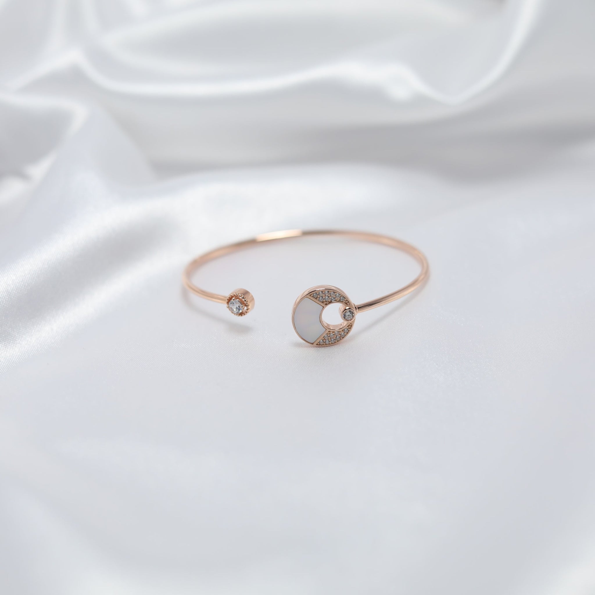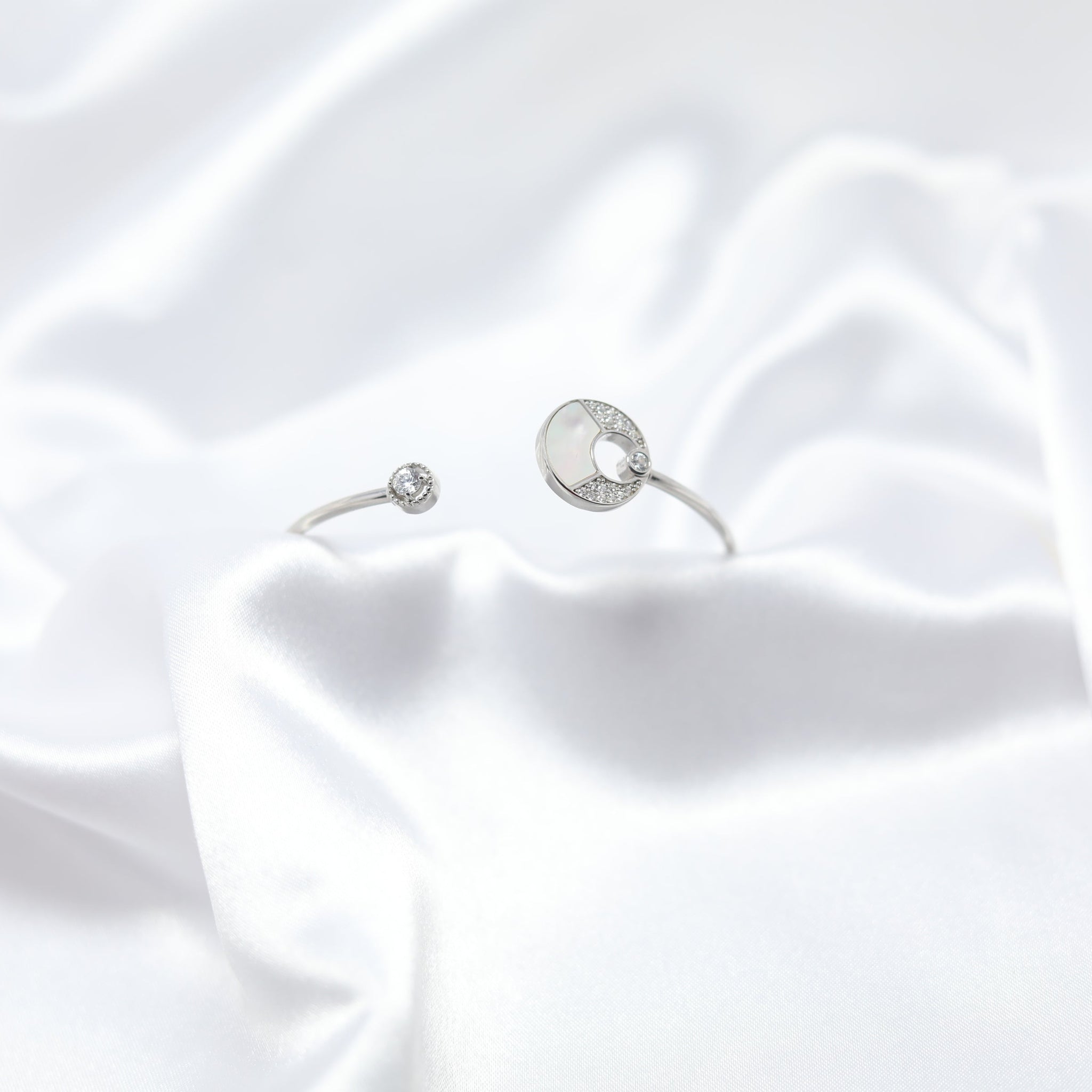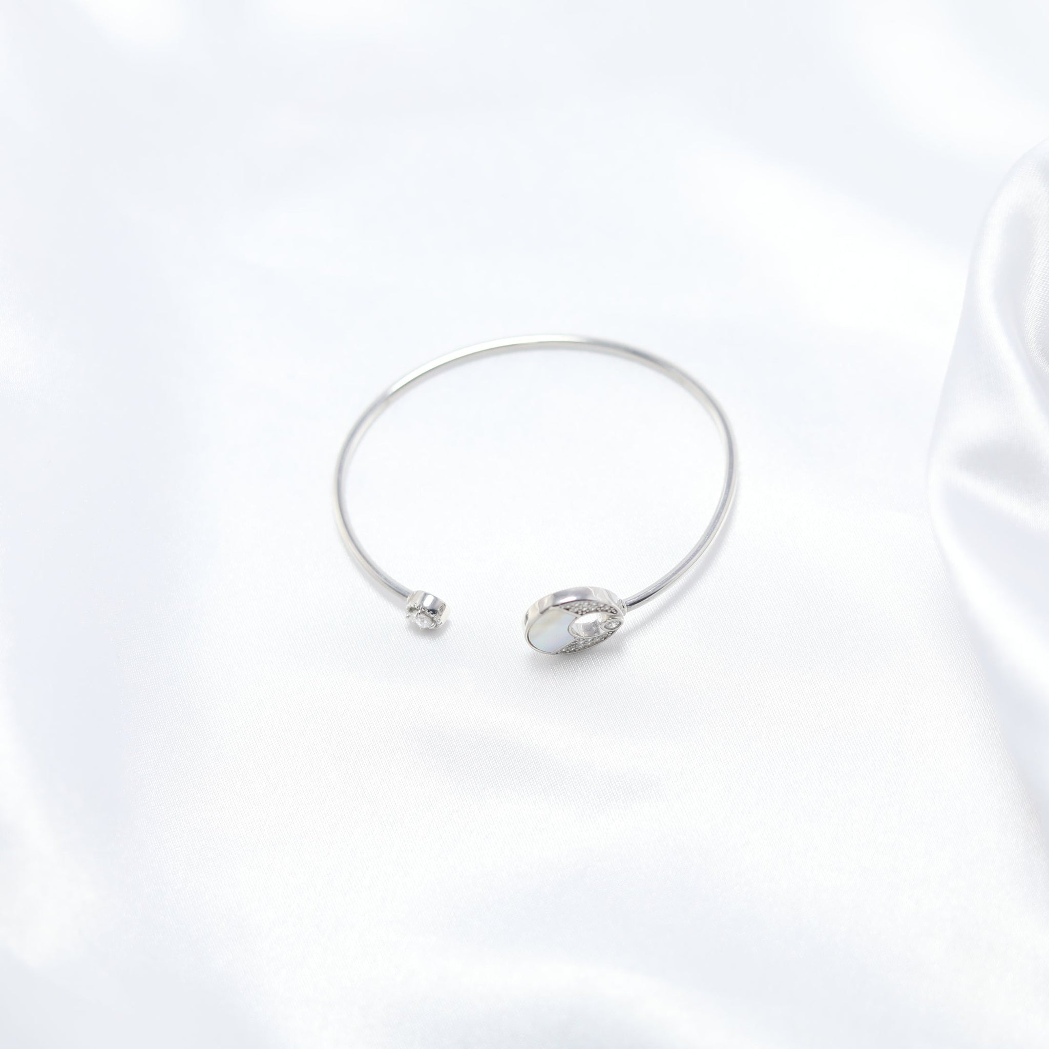 Inspired by the serene glow of the moon, the Luna Glow Kada is a statement of grace and sophistication. Crafted in premium 925 silver, this delicate yet striking piece features a Mother of Pearl inlay at its heart, symbolizing purity and tranquility. Accentuated with sparkling zircon stones, the open-ended design ensures a comfortable fit while adding a touch of celestial charm to your wrist.