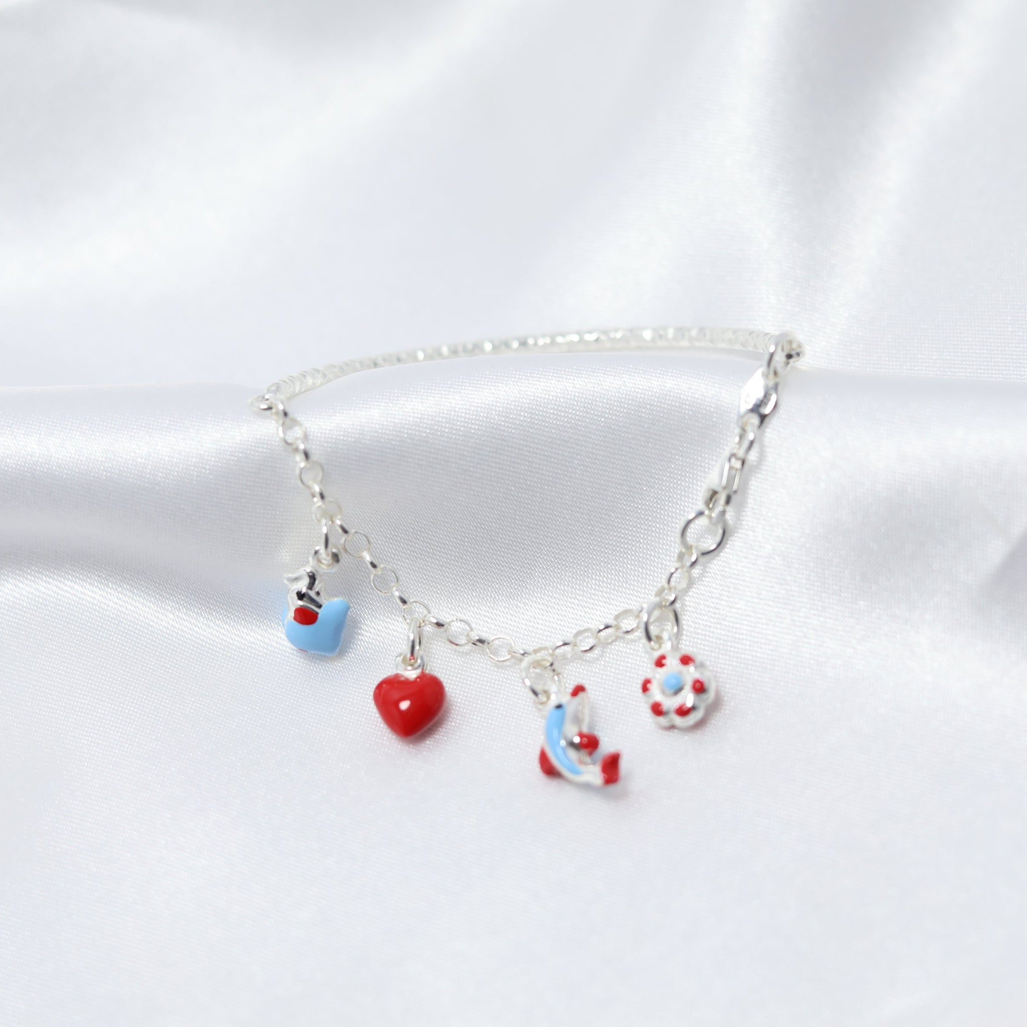 Let your little one carry the charm of the sea with our Ocean Bliss Baby Bracelet! Crafted in 925 sterling silver, this delicate bracelet features adorable nautical-inspired enamel charms, including a whale, heart, dolphin, and lifebuoy, symbolizing love, adventure, and protection.