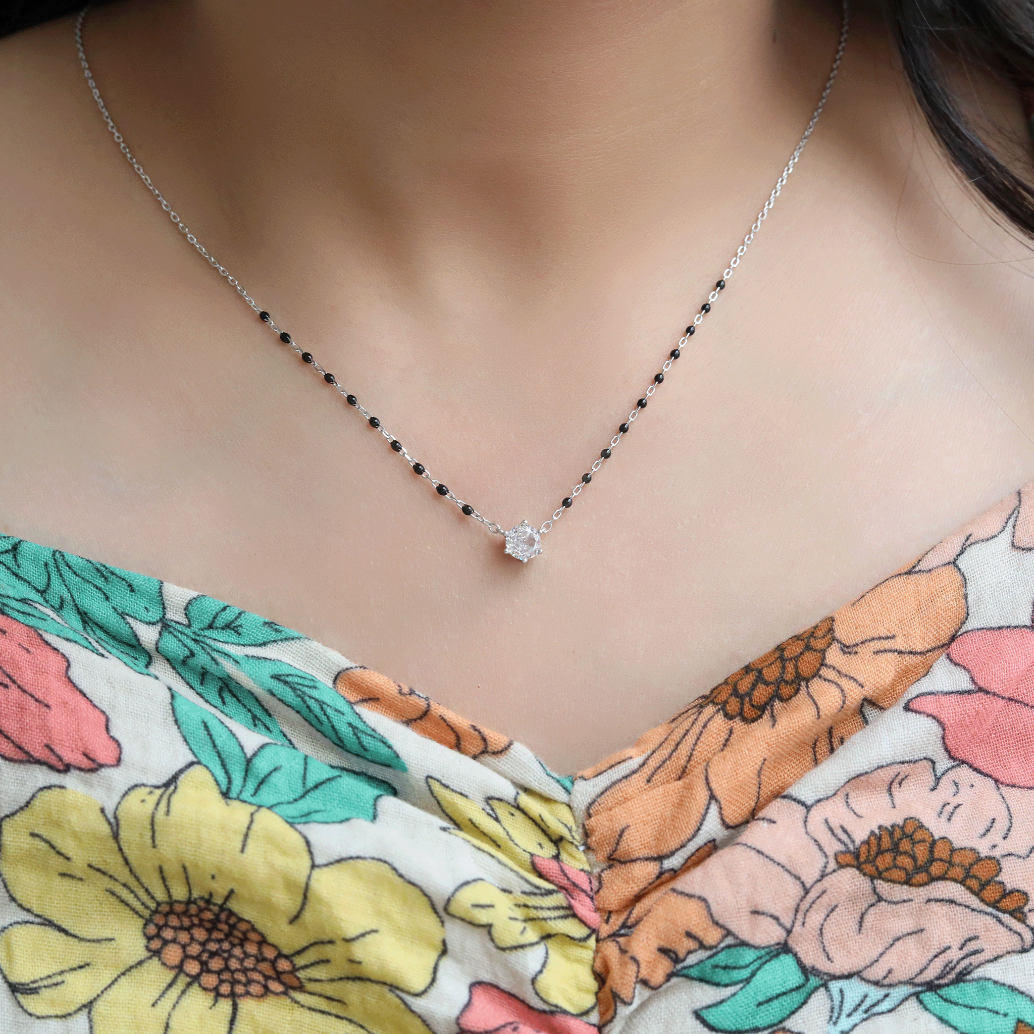 Celebrate timeless elegance with our Roohani Bandhan Mangalsutra, meticulously crafted in premium 925 silver with a soft rose gold polish. This contemporary take on tradition features delicate black beads paired with a brilliant solitaire centerpiece, symbolizing strength and eternal love.
