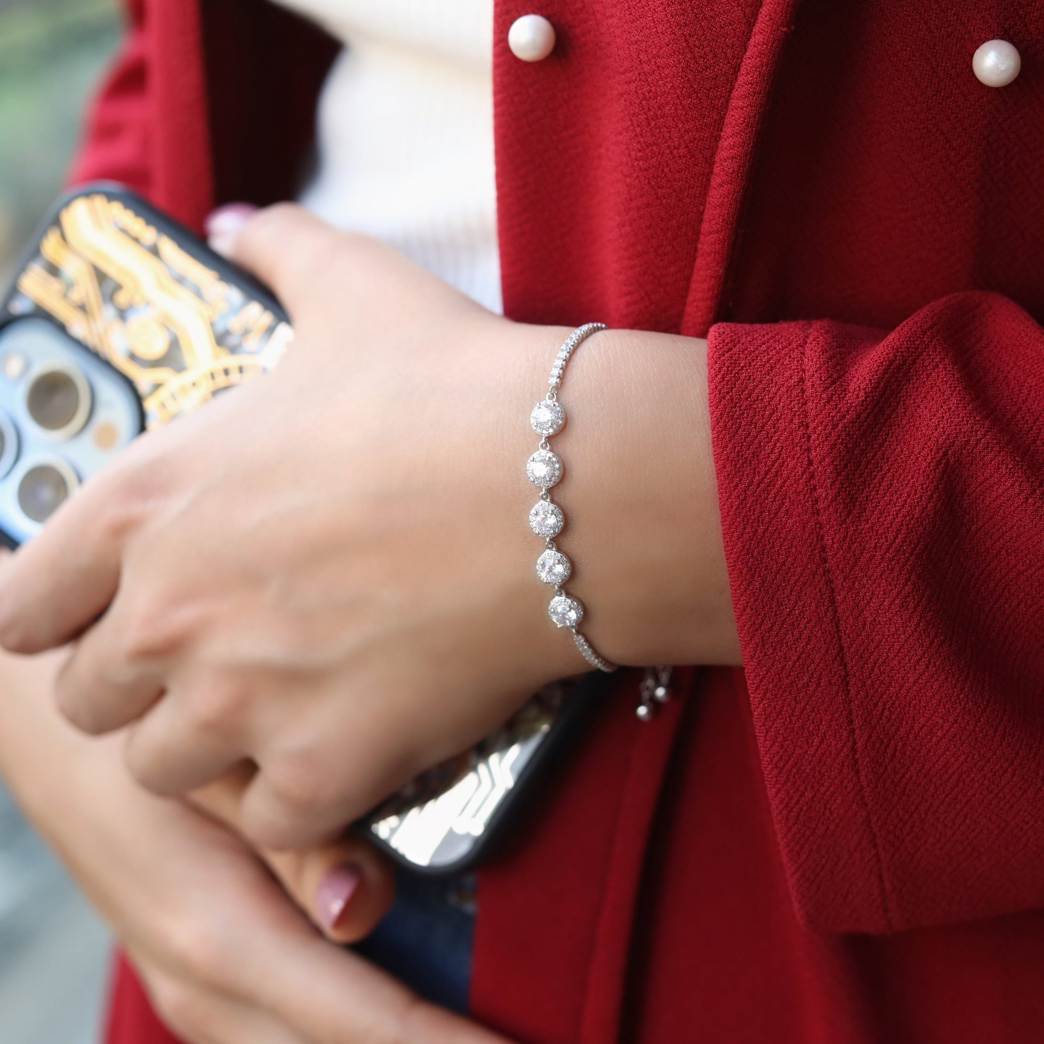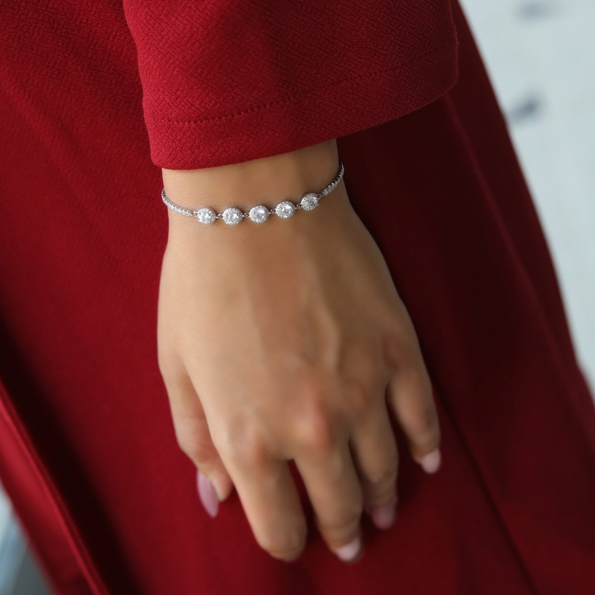 The Zariya Bracelet is a true embodiment of grace and luxury, designed for the modern woman who appreciates understated sophistication. With a delicate sequence of brilliant round-cut stones, each encircled by a halo of smaller crystals, this bracelet sparkles with every movement.