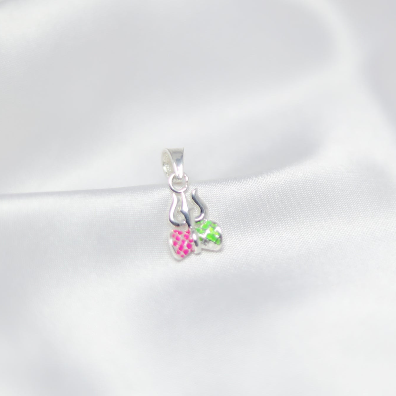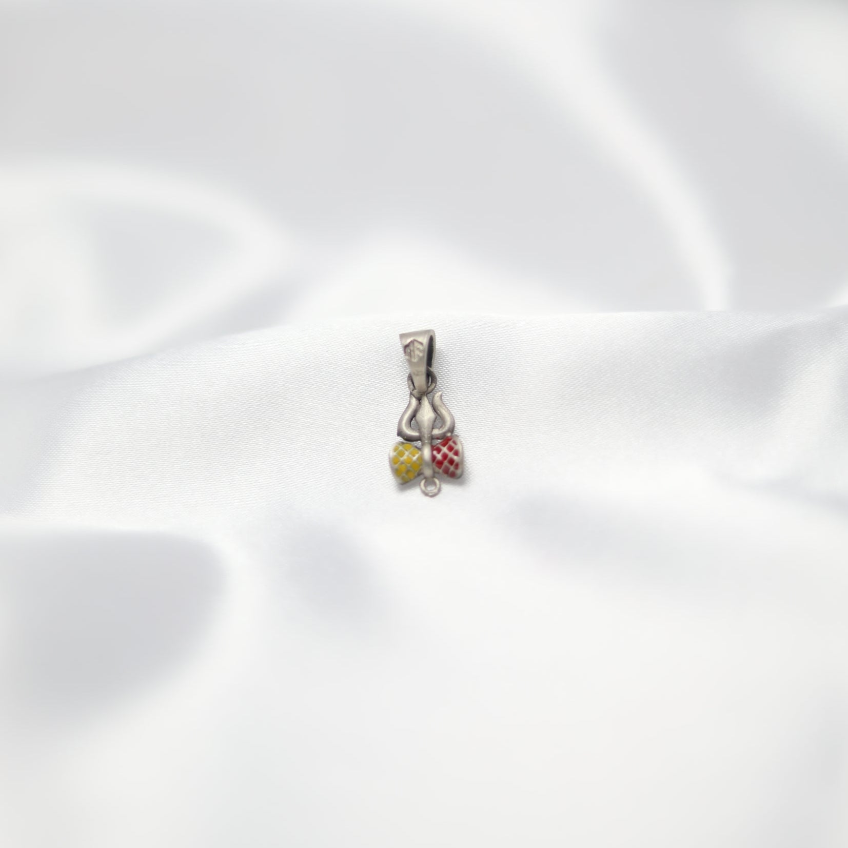 Embrace timeless elegance with this exquisite sterling silver pendant, meticulously crafted to showcase a stunning trishul design, symbolizing strength and divinity. Accentuated with two vibrant danglers in rich red and golden yellow, adorned with intricate lattice patterns, this pendant beautifully blends tradition with contemporary style.