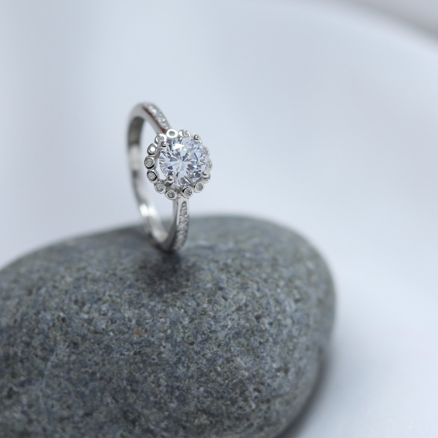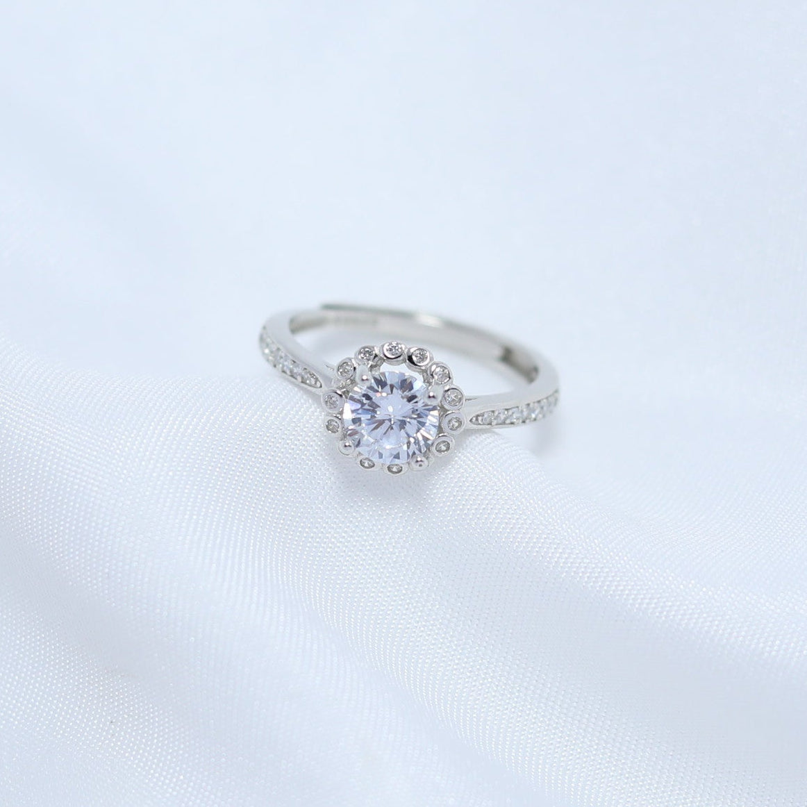 Elegant and timeless, the Ziva Ring is crafted in pure 92.5 sterling silver and features a brilliant round solitaire at its heart. Surrounded by delicate silver dots and a halo of fine stones, this ring sparkles with every movement. The sleek, stone-studded band adds an extra touch of sophistication, making it perfect for both daily wear and special moments.